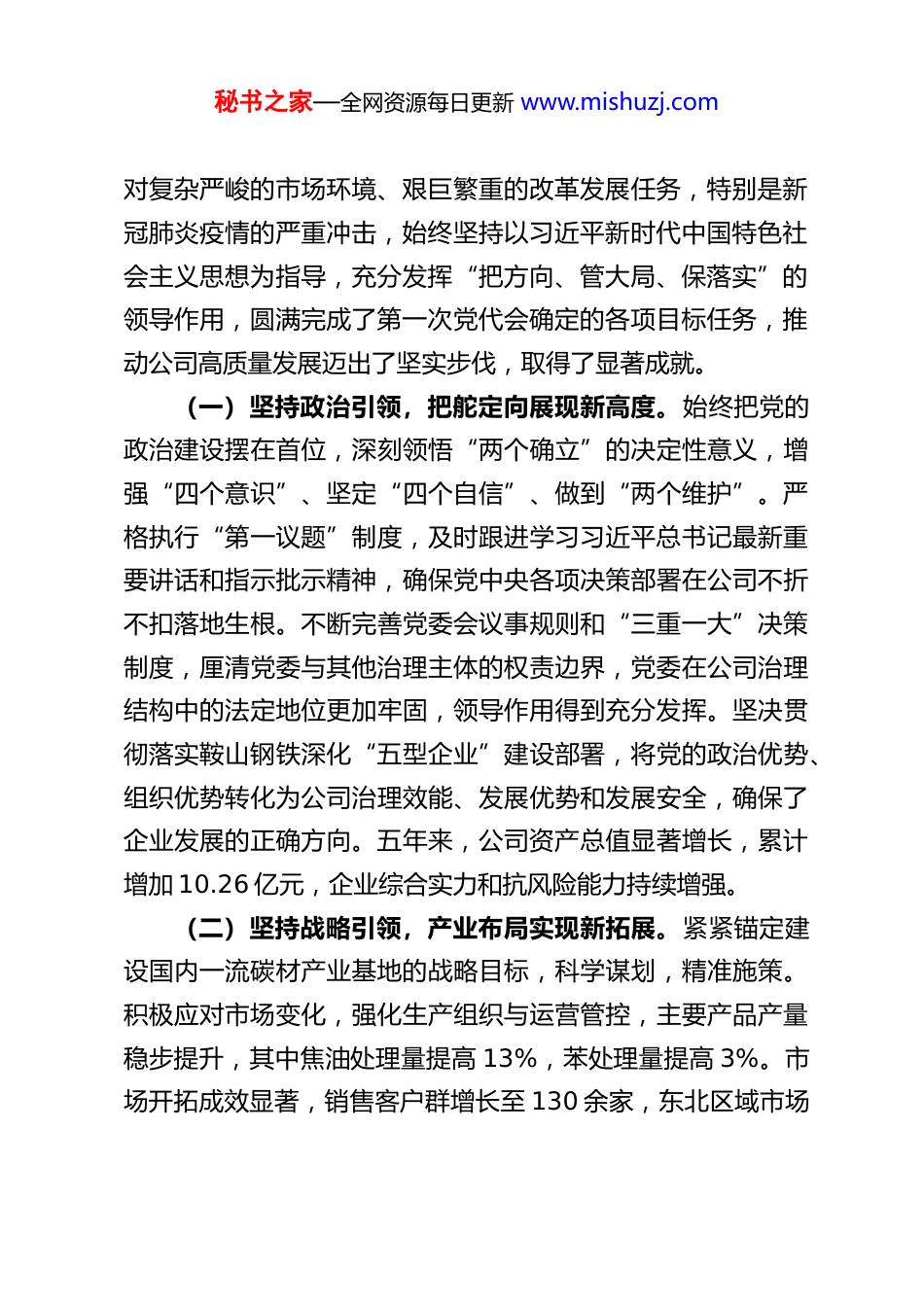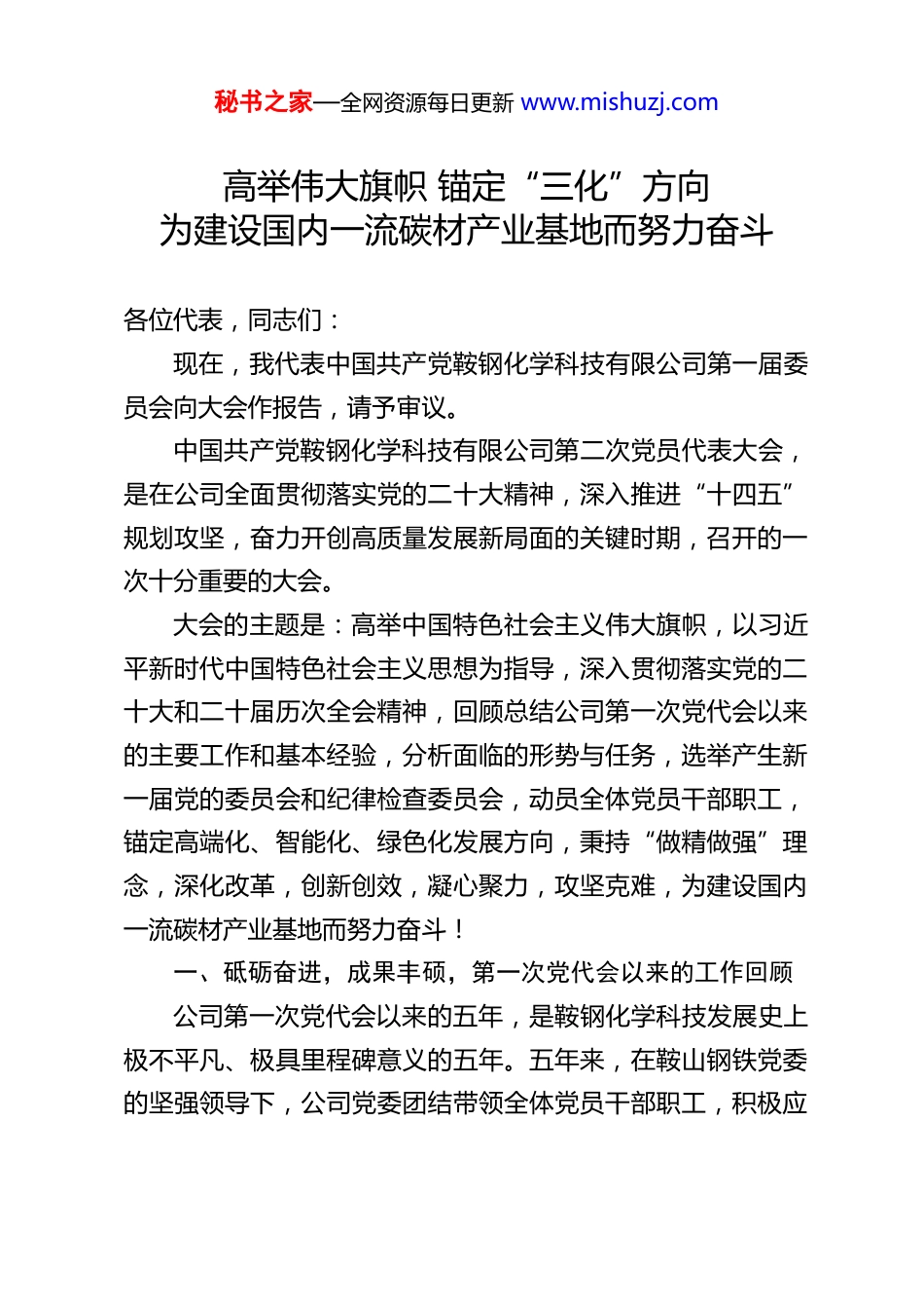 秘书之家—全网资源每日更新 www.mishuzj.com高举伟大旗帜 锚定“三化”方向为建设国内一流碳材产业基地而努力奋斗各位代表,同志们:现在,我代表中国共产党鞍钢化学科技有限公司第一届委员会向大会作报告,请予审议。中国共产党鞍钢化学科技有限公司第二次党员代表大会,是在公司全面贯彻落实党的二十大精神,深入推进“十四五”规划攻坚,奋力开创高质量发展新局面的关键时期,召开的一次十分重要的大会。大会的主题是:高举中国特色社会主义伟大旗帜,以习近平新时代中国特色社会主义思想为指导,深入贯彻落实党的二十大和二十届历次全会精神,回顾总结公司第一次党代会以来的主要工作和基本经验,分析面临的形势与任务,选举产生新一届党的委员会和纪律检查委员会,动员全体党员干部职工,锚定高端化、智能化、绿色化发展方向,秉持“做精做强”理念,深化改革,创新创效,凝心聚力,攻坚克难,为建设国内一流碳材产业基地而努力奋斗!一、砥砺奋进,成果丰硕,第一次党代会以来的工作回顾公司第一次党代会以来的五年,是鞍钢化学科技发展史上极不平凡、极具里程碑意义的五年。五年来,在鞍山钢铁党委的坚强领导下,公司党委团结带领全体党员干部职工,积极应秘书之家—全网资源每日更新 www.mishuzj.com对复杂严峻的市场环境、艰巨繁重的改革发展任务,特别是新冠肺炎疫情的严重冲击,始终坚持以习近平新时代中国特色社会主义思想为指导,充分发挥“把方向、管大局、保落实”的领导作用,圆满完成了第一次党代会确定的各项目标任务,推动公司高质量发展迈出了坚实步伐,取得了显著成就。(一)坚持政治引领,把舵定向展现新高度。始终把党的政治建设摆在首位,深刻领悟“两个确立”的决定性意义,增强“四个意识”、坚定“四个自信”、做到“两个维护”。严格执行“第一议题”制度,及时跟进学习习近平总书记最新重要讲话和指示批示精神,确保党中央各项决策部署在公司不折不扣落地生根。不断完善党委会议事规则和“三重一大”决策制度,厘清党委与其他治理主体的权责边界,党委在公司治理结构中的法定地位更加牢固,领导作用得到充分发挥。坚决贯彻落实鞍山钢铁深化“五型企业”建设部署,将党的政治优势、组织优势转化为公司治理效能、发展优势和发展安全,确保了企业发展的正确方向。五年来,公司资产总值显著增长,累计增加 10.26 亿元,企业综合实力和抗风险能力持续增强。(二)坚持战略引领,产业布局实现新拓展。紧紧锚定建设国内一流碳材产业基地的战略目标,科学谋划,精准施策。积极应对市场变化,强化生产组织与运营管控,主要产品产量稳步提升,其中焦油处理量提高 13%,苯处理量提高 3%。市场开拓成效显著,销售客户群增长至 130 余家,东北区域市场秘书之家—全网资源每日更新 www.mishuzj.com占有率稳固在 80%以上,国际化经营取得突破,精萘产品成功打入巴西、韩国、泰国市场,中温沥青实现出口“零的突破”。坚决落实鞍钢集团碳材产业专业化整合战略,成功实现本钢50%以上化产资源回运、凌钢 100%资源整合,并战略性成立四川绿鑫鼎碳业有限公司,初步构建了辐射“鞍、本、凌、攀”的跨区域产业布局,为打造碳材产业生态圈奠定了坚实基础。(三)坚持创新驱动,核心竞争构筑新优势。深入实施创新驱动发展战略,将科技创新作为引领发展的第一动力。持续加大研发投入,建成省级企业技术中心,配套建设了 9 个专业实验室和 2 条中试线,研发条件显著改善。积极承接国家及省部级科研任务,成功承担 1 项辽宁省“揭榜挂帅”项目,获得政府资金支持 500 万元。技术成果丰硕,五年间共获得全国发明展览会银奖 6 项、铜奖 6 项,1 项成果荣获中央企业 QC 小组成果二等奖。聚焦成本管控,大力实施成本变革项目攻关,累计实现降本增效 1.5 亿元,有效提升了产品的市场竞争力。(四)坚持改革攻坚,内生动力得到新激发。以入选国资委国企改革“双百行动”企业为契机,纵深推进各项改革举措。持续深化市场化经营机制改革,牢固树立“算账经营”理念,全面运行“三干三算”管理模式,细化“经营建模”,强力推进销、研、产、财一体化联动,...