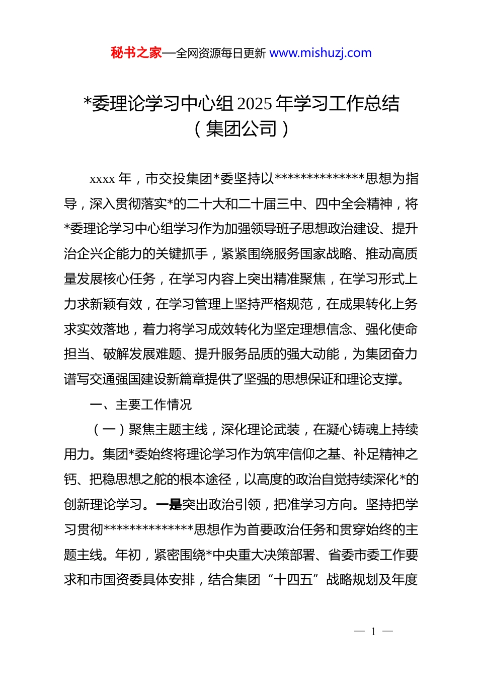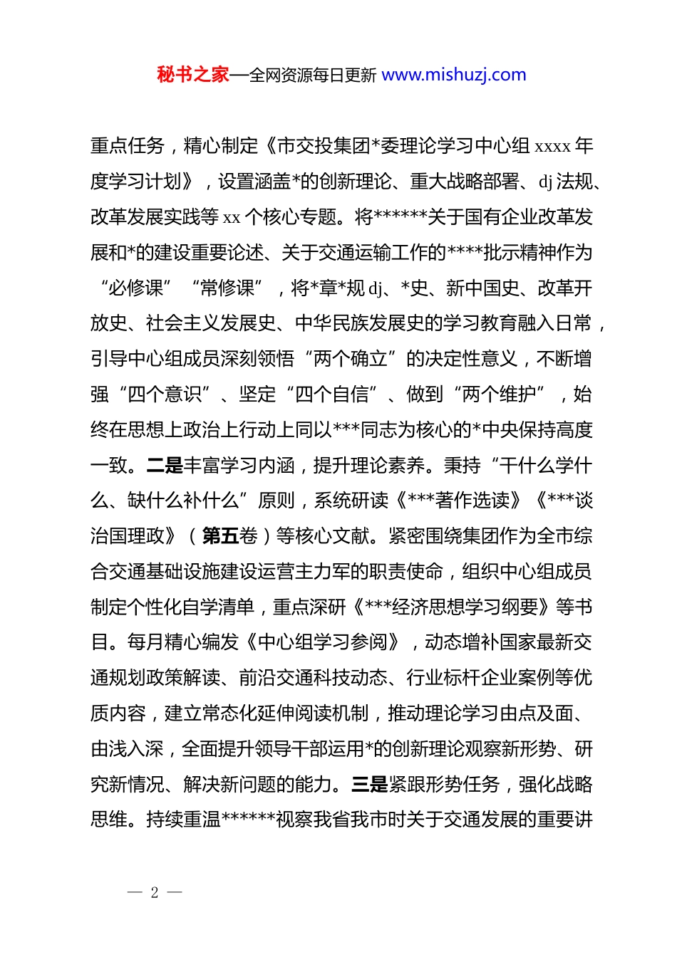 秘书之家—全网资源每日更新 www.mishuzj.com*委理论学习中心组 2025 年学习工作总结(集团公司)xxxx 年,市交投集团*委坚持以**************思想为指导,深入贯彻落实*的二十大和二十届三中、四中全会精神,将*委理论学习中心组学习作为加强领导班子思想政治建设、提升治企兴企能力的关键抓手,紧紧围绕服务国家战略、推动高质量发展核心任务,在学习内容上突出精准聚焦,在学习形式上力求新颖有效,在学习管理上坚持严格规范,在成果转化上务求实效落地,着力将学习成效转化为坚定理想信念、强化使命担当、破解发展难题、提升服务品质的强大动能,为集团奋力谱写交通强国建设新篇章提供了坚强的思想保证和理论支撑。一、主要工作情况(一)聚焦主题主线,深化理论武装,在凝心铸魂上持续用力。集团*委始终将理论学习作为筑牢信仰之基、补足精神之钙、把稳思想之舵的根本途径,以高度的政治自觉持续深化*的创新理论学习。一是突出政治引领,把准学习方向。坚持把学习贯彻**************思想作为首要政治任务和贯穿始终的主题主线。年初,紧密围绕*中央重大决策部署、省委市委工作要求和市国资委具体安排,结合集团“十四五”战略规划及年度— 1 —秘书之家—全网资源每日更新 www.mishuzj.com重点任务,精心制定《市交投集团*委理论学习中心组 xxxx 年度学习计划》,设置涵盖*的创新理论、重大战略部署、dj 法规、改革发展实践等 xx 个核心专题。将******关于国有企业改革发展和*的建设重要论述、关于交通运输工作的****批示精神作为“必修课”“常修课”,将*章*规 dj、*史、新中国史、改革开放史、社会主义发展史、中华民族发展史的学习教育融入日常,引导中心组成员深刻领悟“两个确立”的决定性意义,不断增强“四个意识”、坚定“四个自信”、做到“两个维护”,始终在思想上政治上行动上同以***同志为核心的*中央保持高度一致。二是丰富学习内涵,提升理论素养。秉持“干什么学什么、缺什么补什么”原则,系统研读《***著作选读》《***谈治国理政》(第五卷)等核心文献。紧密围绕集团作为全市综合交通基础设施建设运营主力军的职责使命,组织中心组成员制定个性化自学清单,重点深研《***经济思想学习纲要》等书目。每月精心编发《中心组学习参阅》,动态增补国家最新交通规划政策解读、前沿交通科技动态、行业标杆企业案例等优质内容,建立常态化延伸阅读机制,推动理论学习由点及面、由浅入深,全面提升领导干部运用*的创新理论观察新形势、研究新情况、解决新问题的能力。三是紧跟形势任务,强化战略思维。持续重温******视察我省我市时关于交通发展的重要讲— 2 —秘书之家—全网资源每日更新 www.mishuzj.com话精神,专题学习研讨******对加快建设交通强国、发展新质生产力、推进区域协调发展等作出的系列****批示,深刻领会其核心要义和实践要求,不断增强服务国家战略和区域发展的政治自觉、思想自觉、行动自觉。围绕“交通强国建设”、“智慧交通”、“绿色低碳交通”、“交通领域新质生产力培育”等前沿课题和战略重点,邀请知名专家学者、行业领军人物开设“交投大讲堂”或专题辅导报告,引导中心组成员精准把握时代发展脉搏、洞悉行业变革趋势、认清自身差距短板,切实提升战略谋划能力和履职尽责本领。(二)创新方式载体,增强学习引力,在入脑入心上务求实效。集团*委坚守政治定位,强化理论底色,在抓实个人自学、集体研讨的基础上,积极探索形式多样、富有吸引力的学习载体,推动理论学习走深走实、入脑入心。一是发挥“头雁”效应,以上率下带动学。突出抓好“关键少数”的示范引领。中心组成员坚持先学一步、深学一层,年内举办 x 期高质量专题读书班,严格做到会前潜心自学、会上深入研讨、会后撰写心得。在学习贯彻中央关于力戒形式主义为基层减负等重要部署期间,中心组专题组织学习《***关于力戒形式主义官僚主义重要论述摘编》及相关文件精神,并安排新任职干部、青年骨干代表列席并作重点发言,引导各级干部深刻认识形式主义危害,— 3 —秘书之家—全网资源每日更新 www.mishuzj.com将优良作风内化于心、外化于行。二是拓...