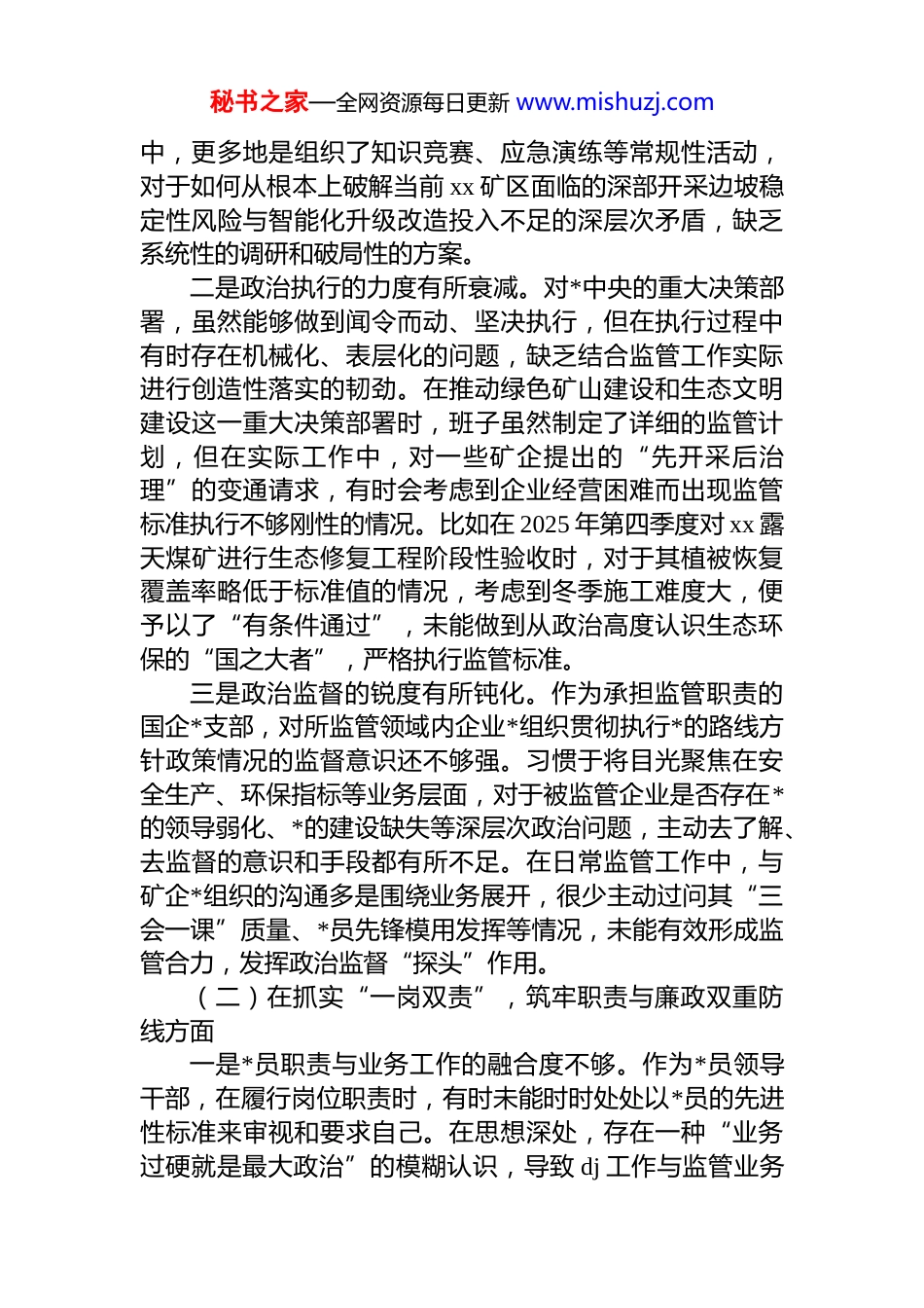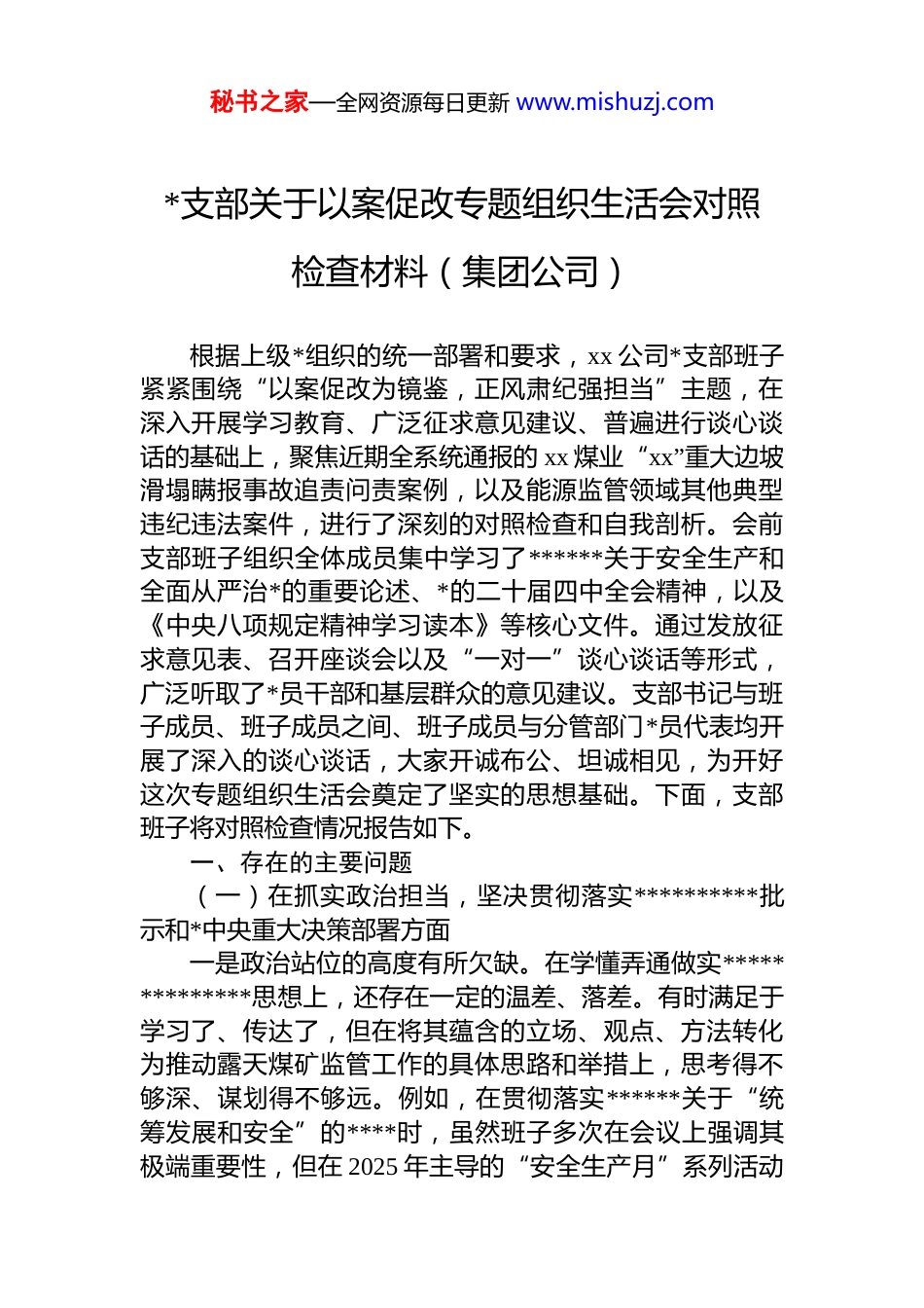 秘书之家—全网资源每日更新 www.mishuzj.com*支部关于以案促改专题组织生活会对照检查材料(集团公司)根据上级*组织的统一部署和要求,xx 公司*支部班子紧紧围绕“以案促改为镜鉴,正风肃纪强担当”主题,在深入开展学习教育、广泛征求意见建议、普遍进行谈心谈话的基础上,聚焦近期全系统通报的 xx 煤业“xx”重大边坡滑塌瞒报事故追责问责案例,以及能源监管领域其他典型违纪违法案件,进行了深刻的对照检查和自我剖析。会前支部班子组织全体成员集中学习了******关于安全生产和全面从严治*的重要论述、*的二十届四中全会精神,以及《中央八项规定精神学习读本》等核心文件。通过发放征求意见表、召开座谈会以及“一对一”谈心谈话等形式,广泛听取了*员干部和基层群众的意见建议。支部书记与班子成员、班子成员之间、班子成员与分管部门*员代表均开展了深入的谈心谈话,大家开诚布公、坦诚相见,为开好这次专题组织生活会奠定了坚实的思想基础。下面,支部班子将对照检查情况报告如下。一、存在的主要问题(一)在抓实政治担当,坚决贯彻落实**********批示和*中央重大决策部署方面一是政治站位的高度有所欠缺。在学懂弄通做实**************思想上,还存在一定的温差、落差。有时满足于学习了、传达了,但在将其蕴含的立场、观点、方法转化为推动露天煤矿监管工作的具体思路和举措上,思考得不够深、谋划得不够远。例如,在贯彻落实******关于“统筹发展和安全”的****时,虽然班子多次在会议上强调其极端重要性,但在 2025 年主导的“安全生产月”系列活动秘书之家—全网资源每日更新 www.mishuzj.com中,更多地是组织了知识竞赛、应急演练等常规性活动,对于如何从根本上破解当前 xx 矿区面临的深部开采边坡稳定性风险与智能化升级改造投入不足的深层次矛盾,缺乏系统性的调研和破局性的方案。二是政治执行的力度有所衰减。对*中央的重大决策部署,虽然能够做到闻令而动、坚决执行,但在执行过程中有时存在机械化、表层化的问题,缺乏结合监管工作实际进行创造性落实的韧劲。在推动绿色矿山建设和生态文明建设这一重大决策部署时,班子虽然制定了详细的监管计划,但在实际工作中,对一些矿企提出的“先开采后治理”的变通请求,有时会考虑到企业经营困难而出现监管标准执行不够刚性的情况。比如在 2025 年第四季度对 xx 露天煤矿进行生态修复工程阶段性验收时,对于其植被恢复覆盖率略低于标准值的情况,考虑到冬季施工难度大,便予以了“有条件通过”,未能做到从政治高度认识生态环保的“国之大者”,严格执行监管标准。三是政治监督的锐度有所钝化。作为承担监管职责的国企*支部,对所监管领域内企业*组织贯彻执行*的路线方针政策情况的监督意识还不够强。习惯于将目光聚焦在安全生产、环保指标等业务层面,对于被监管企业是否存在*的领导弱化、*的建设缺失等深层次政治问题,主动去了解、去监督的意识和手段都有所不足。在日常监管工作中,与矿企*组织的沟通多是围绕业务展开,很少主动过问其“三会一课”质量、*员先锋模用发挥等情况,未能有效形成监管合力,发挥政治监督“探头”作用。(二)在抓实“一岗双责”,筑牢职责与廉政双重防线方面一是*员职责与业务工作的融合度不够。作为*员领导干部,在履行岗位职责时,有时未能时时处处以*员的先进性标准来审视和要求自己。在思想深处,存在一种“业务过硬就是最大政治”的模糊认识,导致 dj 工作与监管业务秘书之家—全网资源每日更新 www.mishuzj.com“两张皮”现象依然存在。在部署业务工作时,强调技术规范、管理流程的多,但结合业务特点同步强调廉政风险同步进行*性教育的少。2025 年组织对《露天煤矿安全规程》进行再学习再培训时,主要精力放在了对边坡角、台阶高度等技术参数的解读上,对于规程背后所体现的敬畏生命、敬畏法纪的*员责任担当精神,挖掘和阐释得不够深入。二是岗位职责中的廉政风险排查不够主动。对监管工作中存在的廉政风险点,虽然有制度性的排查机制,但有时存在一定的滞后性和被动性,未能完全做到防患于未然对一些新兴领域或流程变化中可能产生的廉政风险,敏感性不强。...