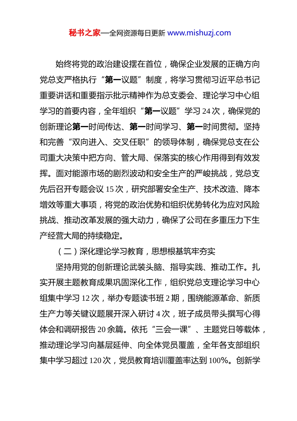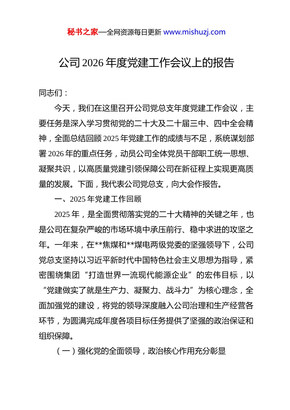 秘书之家—全网资源每日更新 www.mishuzj.com公司 2026 年度党建工作会议上的报告 同志们:今天,我们在这里召开公司党总支年度党建工作会议,主要任务是深入学习贯彻党的二十大及二十届三中、四中全会精神,全面总结回顾 2025 年党建工作的成绩与不足,系统谋划部署 2026 年的重点任务,动员公司全体党员干部职工统一思想、凝聚共识,以高质量党建引领保障公司在新征程上实现更高质量的发展。下面,我代表公司党总支,向大会作报告。一、2025 年党建工作回顾2025 年,是全面贯彻落实党的二十大精神的关键之年,也是公司在复杂严峻的市场环境中承压前行、稳中求进的攻坚之年。一年来,在**焦煤和**煤电两级党委的坚强领导下,公司党总支坚持以习近平新时代中国特色社会主义思想为指导,紧密围绕集团“打造世界一流现代能源企业”的宏伟目标,以“党建做实了就是生产力、凝聚力、战斗力”为核心理念,全面加强党的建设,将党的领导深度融入公司治理和生产经营各环节,为圆满完成年度各项目标任务提供了坚强的政治保证和组织保障。(一)强化党的全面领导,政治核心作用充分彰显秘书之家—全网资源每日更新 www.mishuzj.com始终将党的政治建设摆在首位,确保企业发展的正确方向党总支严格执行“第一议题”制度,将学习贯彻习近平总书记重要讲话和重要指示批示精神作为总支委会、理论学习中心组学习的首要内容,全年组织“第一议题”学习 24 次,确保党的创新理论第一时间传达、第一时间学习、第一时间贯彻。坚持和完善“双向进入、交叉任职”的领导体制,确保党总支在公司重大决策中把方向、管大局、保落实的核心作用得到有效发挥。面对能源市场的剧烈波动和安全生产的严峻挑战,党总支先后召开专题会议 15 次,研究部署安全生产、技术改造、降本增效等重大事项,将党的政治优势和组织优势转化为应对风险挑战、推动改革发展的强大动力,确保了公司在多重压力下生产经营大局的持续稳定。(二)深化理论学习教育,思想根基筑牢夯实坚持用党的创新理论武装头脑、指导实践、推动工作。扎实开展主题教育成果巩固深化工作,组织党总支理论学习中心组集中学习 12 次,举办专题读书班 2 期,围绕能源革命、新质生产力等关键议题展开深入研讨 4 次,班子成员带头撰写心得体会和调研报告 20 余篇。依托“三会一课”、主题党日等载体,推动理论学习向基层延伸、向全体党员覆盖,全年各支部组织集中学习超过 120 次,党员教育培训覆盖率达到 100%。创新学秘书之家—全网资源每日更新 www.mishuzj.com习方式,积极利用**焦煤搭建的党建管理工作平台,组织线上专题培训和知识竞赛 8 批次,参与党员及入党积极分子超过 700人次,有效提升了学习教育的吸引力和实效性。通过系统深入的学习,广大党员干部的政治判断力、政治领悟力、政治执行力得到显著增强。(三)抓实意识形态引领,发展正能量广泛汇聚牢牢掌握意识形态工作领导权、主动权。严格落实意识形态工作责任制,定期分析研判意识形态领域风险,加强对公司网站、公众号、内部宣传栏等阵地的管理,确保了意识形态领域的绝对安全。围绕安全生产、精益管理、技术创新等中心工作,精心组织了“安全生产月”、“党员亮身份、岗位作贡献”等系列主题宣传活动,深入挖掘一线涌现的先进典型和感人事迹,全年选树各类先进典型 35 名,在各级媒体平台刊发稿件 80 余篇。加强思想政治工作研究,聚焦职工思想动态和企业发展难点,形成了一批有价值的思政研究成果,为**焦煤政研会成果丛书的编撰贡献了力量营造了团结一心、昂扬向上的浓厚氛围。(四)夯实基层组织建设,战斗堡垒作用坚强有力树立大抓基层的鲜明导向,着力提升基层党组织的组织力全面推进党支部标准化规范化建设,对所属 5 个党支部进行全秘书之家—全网资源每日更新 www.mishuzj.com面“政治体检”,实现“四强”党支部创建达标率 100%。深化“党建+”融合模式,围绕安全生产、降本增效、技术攻关等中心任务,设立“党员责任区”30 个,“党员示范岗”52 个,组建“党员突击队”12 支。特别是在 3 号煤层智能化综采工作面建设等重点工程中,党...