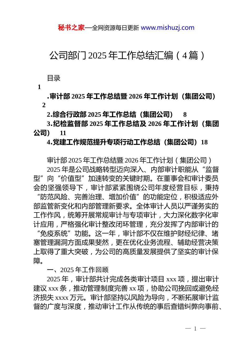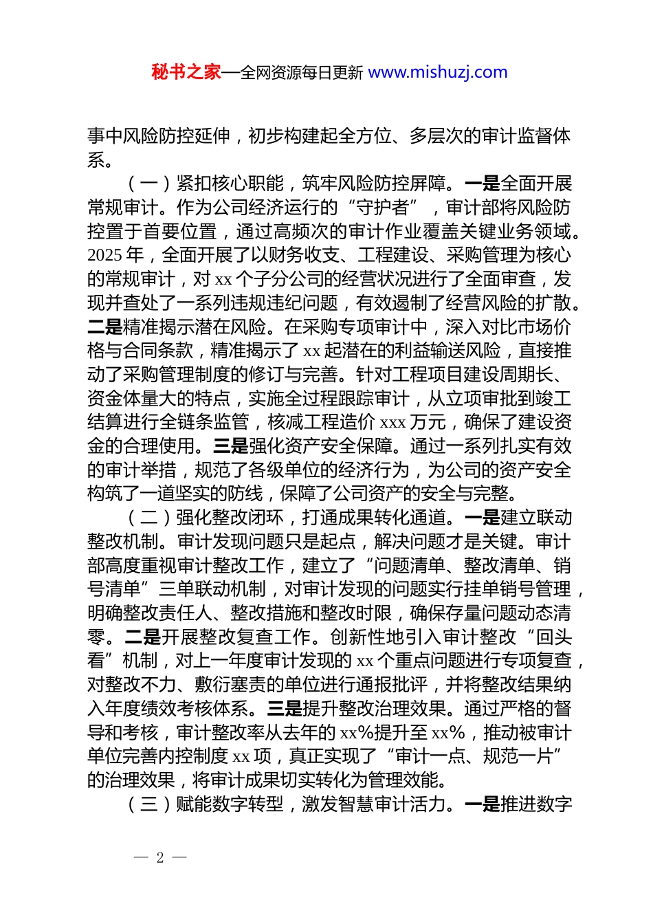 秘书之家—全网资源每日更新 www.mishuzj.com公司部门 2025 年工作总结汇编(4 篇)目录1.审计部 2025 年工作总结暨 2026 年工作计划(集团公司)22.综合行政部 2025 年工作总结(集团公司)83.纪检监督部 2025 年工作总结及 2026 年工作计划(集团公司)114.党建工作规范提升专项行动工作总结(集团公司)18审计部 2025 年工作总结暨 2026 年工作计划(集团公司)2025 年是公司战略转型迈向深入、内部审计职能从“监督型”向“价值型”加速转变的关键时期。在董事会和审计委员会的坚强领导下,审计部紧紧围绕公司年度经营目标,秉持“防范风险、完善治理、增加价值”的功能定位,积极适应外部监管新变化和内部管理新要求。全体审计人员以严谨务实的工作作风,统筹开展常规审计与专项审计,大力深化数字化审计应用,严格强化审计整改闭环管理,充分发挥了内部审计的“免疫系统”功能。这一年,审计部不仅在维护财经纪律、堵塞管理漏洞方面成果斐然,更在优化业务流程、辅助经营决策上取得了重大突破,为公司的高质量发展提供了坚实的审计保障。一、2025 年工作回顾2025 年,审计部共计完成各类审计项目 xxx 项,提出审计建议 xxx 条,推动管理制度完善 xx 项,协助公司挽回或避免经济损失 xxxx 万元。审计部坚持以风险为导向,不断拓展审计监督的广度与深度,推动审计工作从传统的事后查错纠弊向事前、— 1 —秘书之家—全网资源每日更新 www.mishuzj.com事中风险防控延伸,初步构建起全方位、多层次的审计监督体系。(一)紧扣核心职能,筑牢风险防控屏障。一是全面开展常规审计。作为公司经济运行的“守护者”,审计部将风险防控置于首要位置,通过高频次的审计作业覆盖关键业务领域。2025 年,全面开展了以财务收支、工程建设、采购管理为核心的常规审计,对 xx 个子分公司的经营状况进行了全面审查,发现并查处了一系列违规违纪问题,有效遏制了经营风险的扩散。二是精准揭示潜在风险。在采购专项审计中,深入对比市场价格与合同条款,精准揭示了 xx 起潜在的利益输送风险,直接推动了采购管理制度的修订与完善。针对工程项目建设周期长、资金体量大的特点,实施全过程跟踪审计,从立项审批到竣工结算进行全链条监管,核减工程造价 xxx 万元,确保了建设资金的合理使用。三是强化资产安全保障。通过一系列扎实有效的审计举措,规范了各级单位的经济行为,为公司的资产安全构筑了一道坚实的防线,保障了公司资产的安全与完整。(二)强化整改闭环,打通成果转化通道。一是建立联动整改机制。审计发现问题只是起点,解决问题才是关键。审计部高度重视审计整改工作,建立了“问题清单、整改清单、销号清单”三单联动机制,对审计发现的问题实行挂单销号管理,明确整改责任人、整改措施和整改时限,确保存量问题动态清零。二是开展整改复查工作。创新性地引入审计整改“回头看”机制,对上一年度审计发现的 xx 个重点问题进行专项复查,对整改不力、敷衍塞责的单位进行通报批评,并将整改结果纳入年度绩效考核体系。三是提升整改治理效果。通过严格的督导和考核,审计整改率从去年的 xx%提升至 xx%,推动被审计单位完善内控制度 xx 项,真正实现了“审计一点、规范一片”的治理效果,将审计成果切实转化为管理效能。(三)赋能数字转型,激发智慧审计活力。一是推进数字— 2 —秘书之家—全网资源每日更新 www.mishuzj.com化审计应用。面对海量业务数据和日益复杂的经营环境,传统手工审计模式已难以满足需求,数字化转型成为必然选择2025 年,审计部大力推进非现场审计与大数据分析技术的应用,搭建了内部审计数据分析平台,初步实现了对关键财务指标和异常业务数据的实时监测。二是开发自动化审计模型。开发了xx 个自动化审计模型,覆盖资金支付、销售回款、存货管理等高风险环节,通过系统自动跑批筛查疑点数据 xxx 条,极大提高了审计线索发现的精准度和效率。三是实现审计方式跨越。特别是在对电商业务线的审计中,利用数据挖掘技术,精准锁定了多笔异常关联交易,实现了从被动等待线索到主动发现风险的转变。数字化手段...