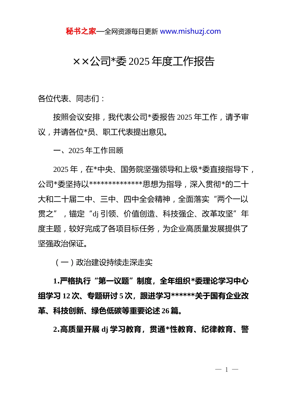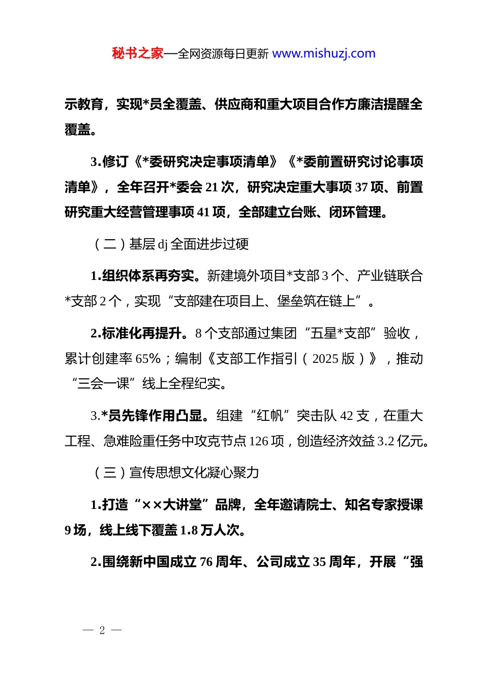 秘书之家—全网资源每日更新 www.mishuzj.com××公司*委 2025 年度工作报告各位代表、同志们:按照会议安排,我代表公司*委报告 2025 年工作,请予审议,并请各位*员、职工代表提出意见。一、2025 年工作回顾2025 年,在*中央、国务院坚强领导和上级*委直接指导下,公司*委坚持以**************思想为指导,深入贯彻*的二十大和二十届二中、三中、四中全会精神,全面落实“两个一以贯之”,锚定“dj 引领、价值创造、科技强企、改革攻坚”年度主题,较好完成了各项目标任务,为企业高质量发展提供了坚强政治保证。(一)政治建设持续走深走实1.严格执行“第一议题”制度,全年组织*委理论学习中心组学习 12 次、专题研讨 5 次,跟进学习******关于国有企业改革、科技创新、绿色低碳等重要论述 26 篇。2.高质量开展 dj 学习教育,贯通*性教育、纪律教育、警— 1 —秘书之家—全网资源每日更新 www.mishuzj.com示教育,实现*员全覆盖、供应商和重大项目合作方廉洁提醒全覆盖。3.修订《*委研究决定事项清单》《*委前置研究讨论事项清单》,全年召开*委会 21 次,研究决定重大事项 37 项、前置研究重大经营管理事项 41 项,全部建立台账、闭环管理。(二)基层 dj 全面进步过硬1.组织体系再夯实。新建境外项目*支部 3 个、产业链联合*支部 2 个,实现“支部建在项目上、堡垒筑在链上”。2.标准化再提升。8 个支部通过集团“五星*支部”验收,累计创建率 65%;编制《支部工作指引(2025 版)》,推动“三会一课”线上全程纪实。3.*员先锋作用凸显。组建“红帆”突击队 42 支,在重大工程、急难险重任务中攻克节点 126 项,创造经济效益 3.2 亿元。(三)宣传思想文化凝心聚力1.打造“××大讲堂”品牌,全年邀请院士、知名专家授课9 场,线上线下覆盖 1.8 万人次。2.围绕新中国成立 76 周年、公司成立 35 周年,开展“强— 2 —秘书之家—全网资源每日更新 www.mishuzj.com国复兴有我”主题征文、短视频挑战赛,征集作品 1200 余件,总阅读量突破 1 亿。3.压实意识形态责任制,修订《网络舆情处置细则》,全年妥善处置苗头性舆情 18 起,未发生较大负面影响事件。(四)干部人才队伍不断优化1.完成经理层任期制契约化签约率 100%,滚动修订《管理人员竞争上岗办法》,全年开展岗位“揭榜挂帅”3 批次,92名优秀年轻干部脱颖而出。2.实施“首席科学家+青年拔尖”双轮驱动,新增国务院特贴专家 2 人、省部级领军人才 11 人;博士后工作站出站留企率首次突破 80%。3.打造“工匠学院”,新增高级技师、特级技师 136 人,2名职工荣获“全国技术能手”。(五)全面从严治*纵深推进1.强化监督执纪。公司纪委开展政治监督专项检查 4 轮,发现并督促整改问题 63 项;全年接收信访举报同比下降 22%。2.重拳纠治“四风”。开展“靠企吃企”、境外腐败、影— 3 —秘书之家—全网资源每日更新 www.mishuzj.com子股东、虚假贸易等专项整治,立案审查调查 11 件,dj 政务处分 9 人,挽回经济损失 4100 万元。3.深化廉洁文化建设。升级企业廉洁教育基地,打造“清风××”数字展馆,全年接待内外部参观者 1.3 万人次。(六)群团统战工作活力迸发1.职代会审议通过《集体合同(2025—2027 年)》等 4 项制度,征集提案 286 条,办结率 97%。2.劳动和技能竞赛创造经济效益 1.1 亿元,职工技术创新成果获省部级奖励 23 项。3.深化“我为群众办实事”,投入帮扶资金 2100 万元,解决职工急难愁盼问题 168 项;乡村振兴对口帮扶村集体经济收入突破 120 万元。(七)经营发展成果好于预期在 dj 引领保障下,公司主要经营指标再创历史新高:——营业收入 1286 亿元,同比增长 12.3%;——利润总额 86 亿元,同比增长 15.7%;——净利润 68 亿元,同比增长 14.2%;— 4 —秘书之家—全网资源每日更新 www.mishuzj.com——资产负债率降至 56.8%,同比下降 2.1 个百分点;——研发投入强度达到 4.5%,同比提升 0.4 个百分点;——万元产值综合能耗下降 3.9%,超额完成国资委考核目标。...