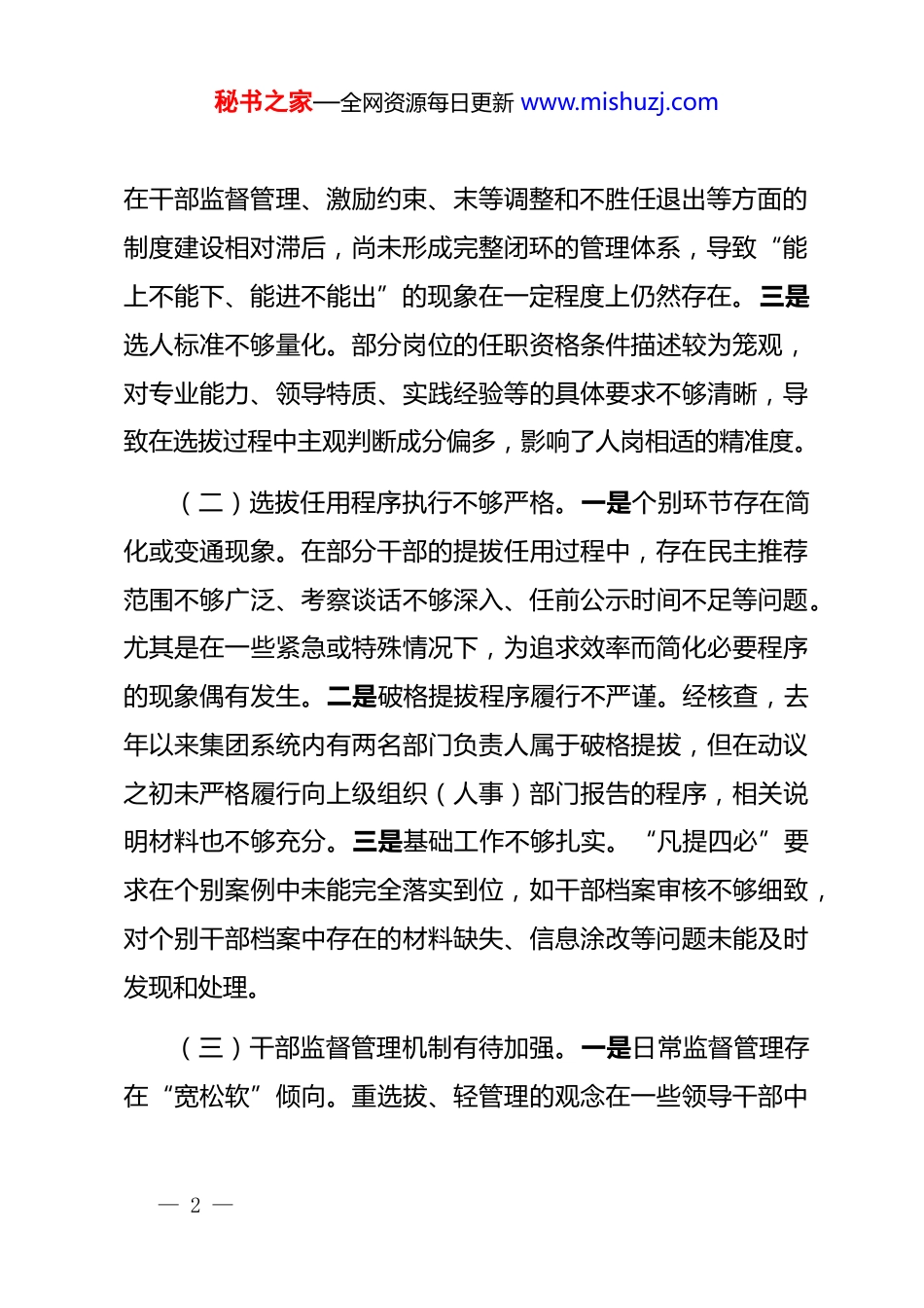 秘书之家—全网资源每日更新 www.mishuzj.com公司关于选人用人工作的自查整改方案为深入贯彻落实 2025 年 10 月中共中央、国务院印发的《关于深化国有企业改革的指导意见》等最新文件精神,坚持和加强*对国有企业的全面领导,着力破解选人用人工作中的难点、堵点问题,**集团有限公司*组于近期组织开展了选人用人工作专项自查。本次自查聚焦制度建设、程序执行、监督管理和队伍建设等关键环节,旨在全面排查风险隐患,找准问题根源,制定有效整改措施。现将自查情况与整改方案报告如下:一、自查发现的主要问题通过“地毯式”的自查自纠,集团在选人用人工作方面总体保持了平稳有序,但在对标新时代*的组织路线和国企改革发展要求下,仍暴露出一些亟待解决的突出问题。(一)制度体系建设存在短板。一是顶层设计与基层实践衔接不畅。集团现行的《中层管理人员选拔任用实施办法》制定于数年前,部分条款已不能完全适应当前市场化选聘、契约化管理和职业经理人制度改革的新要求,对不同类型、不同层级子公司的指导性和操作性有所减弱。二是配套制度不健全。— 1 —秘书之家—全网资源每日更新 www.mishuzj.com在干部监督管理、激励约束、末等调整和不胜任退出等方面的制度建设相对滞后,尚未形成完整闭环的管理体系,导致“能上不能下、能进不能出”的现象在一定程度上仍然存在。三是选人标准不够量化。部分岗位的任职资格条件描述较为笼观,对专业能力、领导特质、实践经验等的具体要求不够清晰,导致在选拔过程中主观判断成分偏多,影响了人岗相适的精准度。(二)选拔任用程序执行不够严格。一是个别环节存在简化或变通现象。在部分干部的提拔任用过程中,存在民主推荐范围不够广泛、考察谈话不够深入、任前公示时间不足等问题。尤其是在一些紧急或特殊情况下,为追求效率而简化必要程序的现象偶有发生。二是破格提拔程序履行不严谨。经核查,去年以来集团系统内有两名部门负责人属于破格提拔,但在动议之初未严格履行向上级组织(人事)部门报告的程序,相关说明材料也不够充分。三是基础工作不够扎实。“凡提四必”要求在个别案例中未能完全落实到位,如干部档案审核不够细致,对个别干部档案中存在的材料缺失、信息涂改等问题未能及时发现和处理。(三)干部监督管理机制有待加强。一是日常监督管理存在“宽松软”倾向。重选拔、轻管理的观念在一些领导干部中— 2 —秘书之家—全网资源每日更新 www.mishuzj.com依然存在,对干部的日常思想动态、工作表现和“八小时外”生活圈、社交圈的了解监督不够及时、全面,抓早抓小、防微杜渐的力度有待提升。二是责任追究机制未能有效发挥震慑作用。对于选人用人过程中的失察失误,尚未完全建立起有效的倒查和追责机制,导致“谁推荐、谁负责,谁考察、谁负责”的压力传导不到位。三是干部人事档案管理存在薄弱环节。部分基层单位对档案管理工作重视不足,存在档案材料收集不及时、整理不规范、数字化建设滞后等问题,为人事决策的准确性埋下隐患。(四)人才队伍结构与发展储备不足。一是干部队伍年龄结构老化趋势显现。根据集团 2025 年人力资源统计数据,集团总部及核心子公司中层管理人员平均年龄为 46.5 岁,35 岁以下青年干部占比仅为 12%,与行业内标杆企业平均 20%以上的水平存在明显差距。二是专业化、市场化人才储备严重不足。随着集团向新能源、智能制造等新业务领域拓展,既懂技术又懂管理、熟悉资本运作的复合型人才和职业经理人缺口较大。据统计,近两年集团关键技术岗位的年度离职率达到了 8%,高于公司整体 5%的平均水平,人才“引不进、留不住”的问题日益突出。三是干部交流轮岗机制不畅。部分干部长期在一个— 3 —秘书之家—全网资源每日更新 www.mishuzj.com部门或一个岗位工作,视野不开阔,经验单一化,不利于复合型领导人才的培养和成长。二、产生问题的原因分析深入剖析上述问题,其根源主要在于以下几个方面:(一)思想认识存在偏差。部分领导干部对新时期国有企业选人用人工作的重要性、复杂性认识不足,未能完全处理好坚持*管干部原则与市场化选人用人机制的关系。有的认为选人用...
