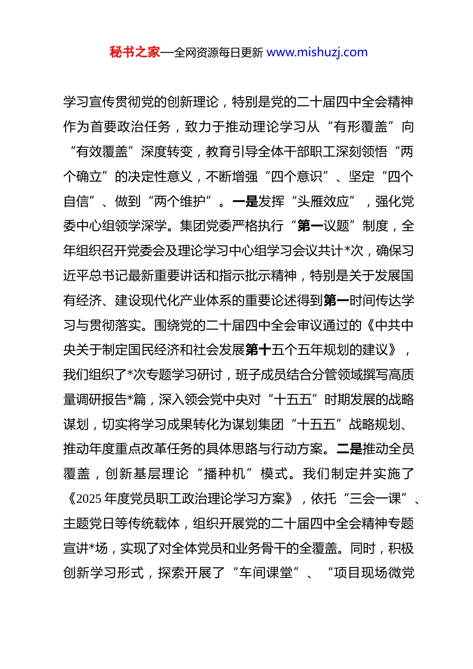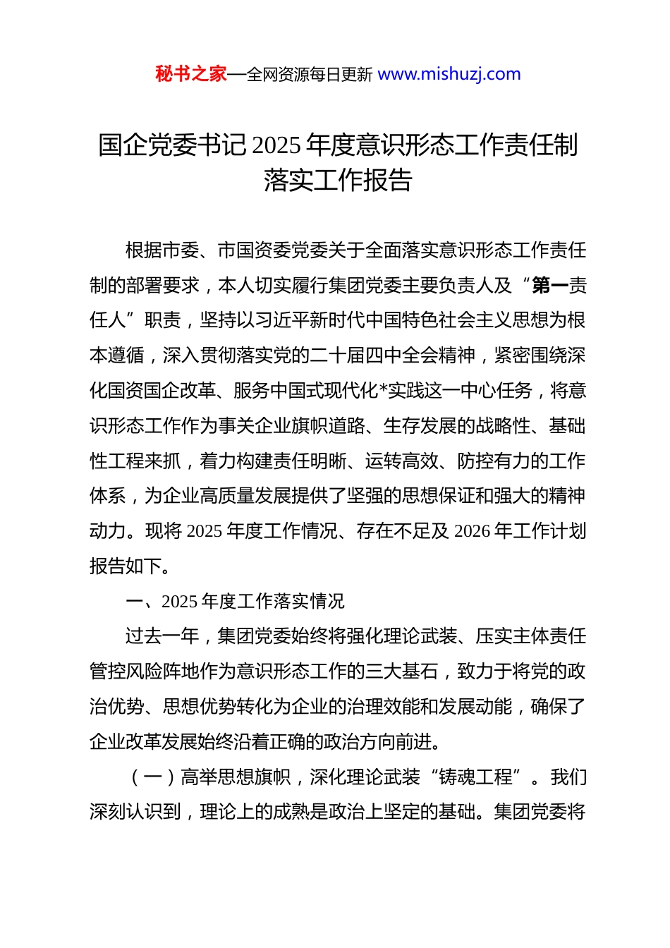 秘书之家—全网资源每日更新 www.mishuzj.com国企党委书记 2025 年度意识形态工作责任制落实工作报告 根据市委、市国资委党委关于全面落实意识形态工作责任制的部署要求,本人切实履行集团党委主要负责人及“第一责任人”职责,坚持以习近平新时代中国特色社会主义思想为根本遵循,深入贯彻落实党的二十届四中全会精神,紧密围绕深化国资国企改革、服务中国式现代化*实践这一中心任务,将意识形态工作作为事关企业旗帜道路、生存发展的战略性、基础性工程来抓,着力构建责任明晰、运转高效、防控有力的工作体系,为企业高质量发展提供了坚强的思想保证和强大的精神动力。现将 2025 年度工作情况、存在不足及 2026 年工作计划报告如下。一、2025 年度工作落实情况过去一年,集团党委始终将强化理论武装、压实主体责任管控风险阵地作为意识形态工作的三大基石,致力于将党的政治优势、思想优势转化为企业的治理效能和发展动能,确保了企业改革发展始终沿着正确的政治方向前进。(一)高举思想旗帜,深化理论武装“铸魂工程”。我们深刻认识到,理论上的成熟是政治上坚定的基础。集团党委将秘书之家—全网资源每日更新 www.mishuzj.com学习宣传贯彻党的创新理论,特别是党的二十届四中全会精神作为首要政治任务,致力于推动理论学习从“有形覆盖”向“有效覆盖”深度转变,教育引导全体干部职工深刻领悟“两个确立”的决定性意义,不断增强“四个意识”、坚定“四个自信”、做到“两个维护”。一是发挥“头雁效应”,强化党委中心组领学深学。集团党委严格执行“第一议题”制度,全年组织召开党委会及理论学习中心组学习会议共计*次,确保习近平总书记最新重要讲话和指示批示精神,特别是关于发展国有经济、建设现代化产业体系的重要论述得到第一时间传达学习与贯彻落实。围绕党的二十届四中全会审议通过的《中共中央关于制定国民经济和社会发展第十五个五年规划的建议》,我们组织了*次专题学习研讨,班子成员结合分管领域撰写高质量调研报告*篇,深入领会党中央对“十五五”时期发展的战略谋划,切实将学习成果转化为谋划集团“十五五”战略规划、推动年度重点改革任务的具体思路与行动方案。二是推动全员覆盖,创新基层理论“播种机”模式。我们制定并实施了《2025 年度党员职工政治理论学习方案》,依托“三会一课”、主题党日等传统载体,组织开展党的二十届四中全会精神专题宣讲*场,实现了对全体党员和业务骨干的全覆盖。同时,积极创新学习形式,探索开展了“车间课堂”、“项目现场微党秘书之家—全网资源每日更新 www.mishuzj.com课”等一线学习活动*次,推动党的创新理论进部门、进车间、进班组、进头脑,有效破解了理论学习与生产经营“时空隔离”的难题,增强了理论的亲和力与穿透力。三是注重学用贯通,构建成果转化“催化剂”机制。集团党委坚决反对学用“两张皮”,着力构建理论学习成果向实践转化的闭环机制。我们结合学习贯彻二十届四中全会精神,在全集团范围内组织开展了“对标新规划、激发新动能”大讨论活动,引导干部职工围绕发展新质生产力、优化国有资本布局等重大课题建言献策,共征集到有价值建议*条。全年通过理论学习成果的转化应用,有效推动了*项制约企业发展的技术或管理瓶颈问题的解决,完成了*个技术革新或降本增效项目,理论学习切实成为破解难题、推动发展的“金钥匙”。(二)压实主体责任,织密齐抓共管“责任网络”。我们始终牢记“抓好意识形态工作是本职、不抓是失职、抓不好是渎职”的政治要求,将构建严密的责任体系作为确保意识形态工作落地生根的根本保障,着力形成党委统一领导、党政齐抓共管、宣传部门组织协调、有关部门分工负责、全体干部职工共同参与的工作大格局。一是健全制度体系,明确权责“边界线”。年初,集团党委召开专题会议,研究制定并印发了《集团党委 2025 年意识形态工作要点与责任清单》,将年度意识形秘书之家—全网资源每日更新 www.mishuzj.com态工作任务细化分解为*个大项、*个子项,逐一明确了党委书记的第一责任、班子成员的“一岗双责”以及各职能部门、下属子公司的具体责任。修订完善了《...