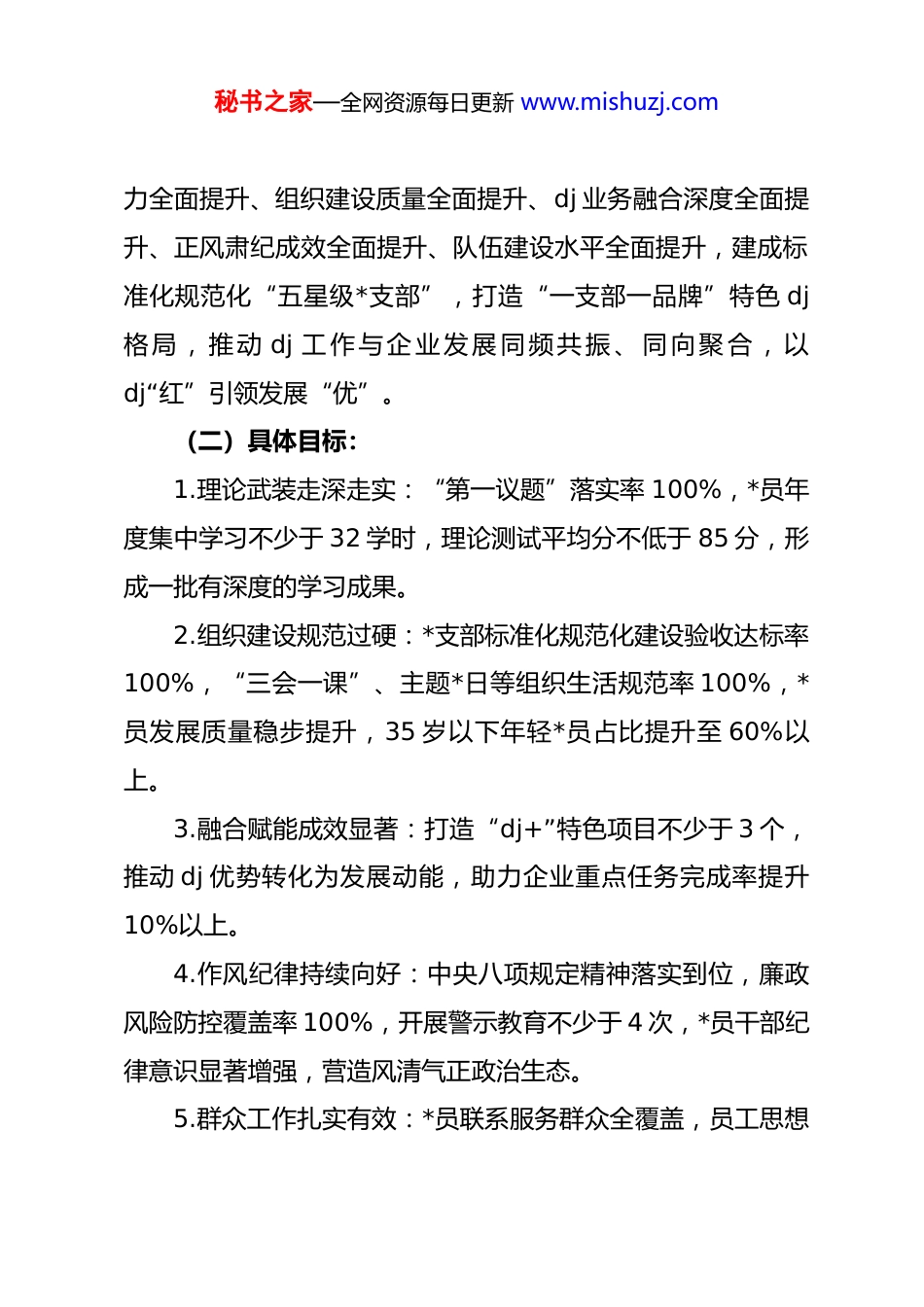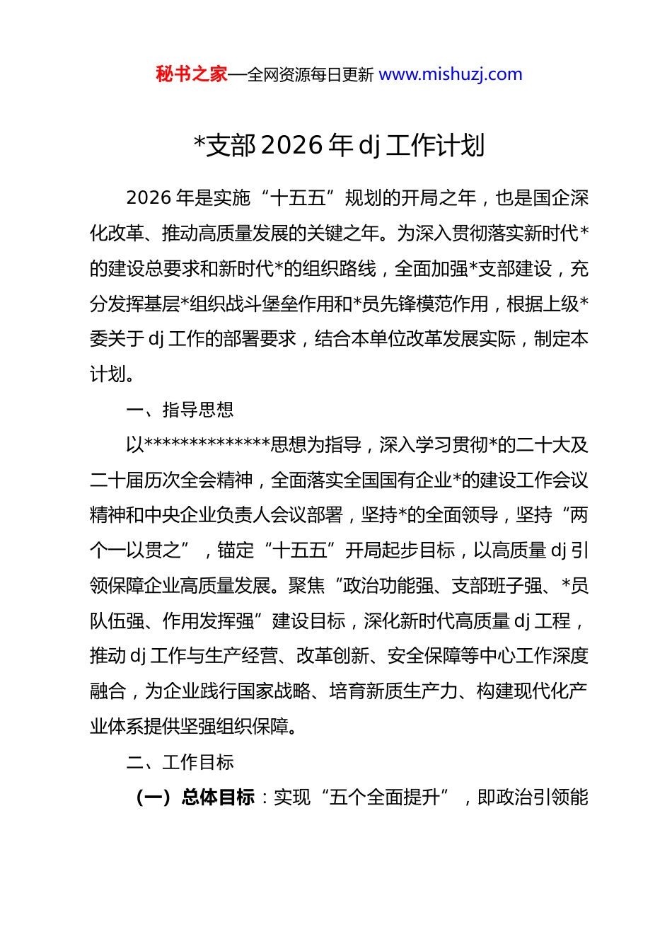 秘书之家—全网资源每日更新 www.mishuzj.com*支部 2026 年 dj 工作计划2026 年是实施“十五五”规划的开局之年,也是国企深化改革、推动高质量发展的关键之年。为深入贯彻落实新时代*的建设总要求和新时代*的组织路线,全面加强*支部建设,充分发挥基层*组织战斗堡垒作用和*员先锋模范作用,根据上级*委关于 dj 工作的部署要求,结合本单位改革发展实际,制定本计划。一、指导思想以**************思想为指导,深入学习贯彻*的二十大及二十届历次全会精神,全面落实全国国有企业*的建设工作会议精神和中央企业负责人会议部署,坚持*的全面领导,坚持“两个一以贯之”,锚定“十五五”开局起步目标,以高质量 dj 引领保障企业高质量发展。聚焦“政治功能强、支部班子强、*员队伍强、作用发挥强”建设目标,深化新时代高质量 dj 工程,推动 dj 工作与生产经营、改革创新、安全保障等中心工作深度融合,为企业践行国家战略、培育新质生产力、构建现代化产业体系提供坚强组织保障。二、工作目标(一)总体目标:实现“五个全面提升”,即政治引领能秘书之家—全网资源每日更新 www.mishuzj.com力全面提升、组织建设质量全面提升、dj 业务融合深度全面提升、正风肃纪成效全面提升、队伍建设水平全面提升,建成标准化规范化“五星级*支部”,打造“一支部一品牌”特色 dj格局,推动 dj 工作与企业发展同频共振、同向聚合,以dj“红”引领发展“优”。(二)具体目标:1.理论武装走深走实:“第一议题”落实率 100%,*员年度集中学习不少于 32 学时,理论测试平均分不低于 85 分,形成一批有深度的学习成果。2.组织建设规范过硬:*支部标准化规范化建设验收达标率100%,“三会一课”、主题*日等组织生活规范率 100%,*员发展质量稳步提升,35 岁以下年轻*员占比提升至 60%以上。3.融合赋能成效显著:打造“dj+”特色项目不少于 3 个,推动 dj 优势转化为发展动能,助力企业重点任务完成率提升10%以上。4.作风纪律持续向好:中央八项规定精神落实到位,廉政风险防控覆盖率 100%,开展警示教育不少于 4 次,*员干部纪律意识显著增强,营造风清气正政治生态。5.群众工作扎实有效:*员联系服务群众全覆盖,员工思想秘书之家—全网资源每日更新 www.mishuzj.com动态排查化解率 100%,群众对 dj 工作满意度不低于 95%。三、主要任务及措施(一)强化政治建设,筑牢思想根基1.深化理论武装体系。严格落实“第一议题”制度,支部委员会每月至少开展 1 次**************思想专题学习,*员大会每季度围绕*的创新理论、国家战略部署、国企改革要求开展1 次集中研讨。建立“线上+线下”融合学习模式,依托“学习强国”“企业 dj 云平台”开展线上自学,要求*员日均积分不低于 30 分,季度评选“学习标兵”;线下每季度组织 1 次红色教育基地现场教学,全年覆盖全体*员,推动*的创新理论进基层、进一线、进班组。2.强化政治忠诚教育。深入开展拥护“两个确立”、做到“两个维护”zt 教育,将其融入*员教育培训全过程。支部委员每年讲专题*课不少于 2 次,邀请上级领导、行业专家开展专题辅导不少于 1 次,引导*员干部始终在思想上政治上行动上同以***同志为核心的*中央保持高度一致,坚定当好贯彻*中央决策部署的行动派、执行者、实干家。3.严守意识形态阵地。建立“*员思想联络员”制度,每名*员联系 3-5 名群众,每月开展 1 次思想动态调研,形成《员工思想动态月报》,及时化解思想困惑。加强支部微信群、宣传秘书之家—全网资源每日更新 www.mishuzj.com栏等阵地管理,每季度开展 1 次意识形态风险排查,严禁发布不当言论,确保意识形态领域零风险。规范信息报送机制,及时宣传支部 dj 成效和先进典型,弘扬主旋律、传播正能量。(二)夯实组织基础,提升组织能力1.推进标准化规范化建设。对照《国有企业*支部标准化规范化建设指引》,完善支部委员会设置,明确组织、宣传、纪检委员职责分工。升级*员活动室,配备 dj 书籍不少于 200册,dj 宣传栏每季度更新 1 次。制定《支部“三会一课”年度计划表》,严格执行组织生活制...