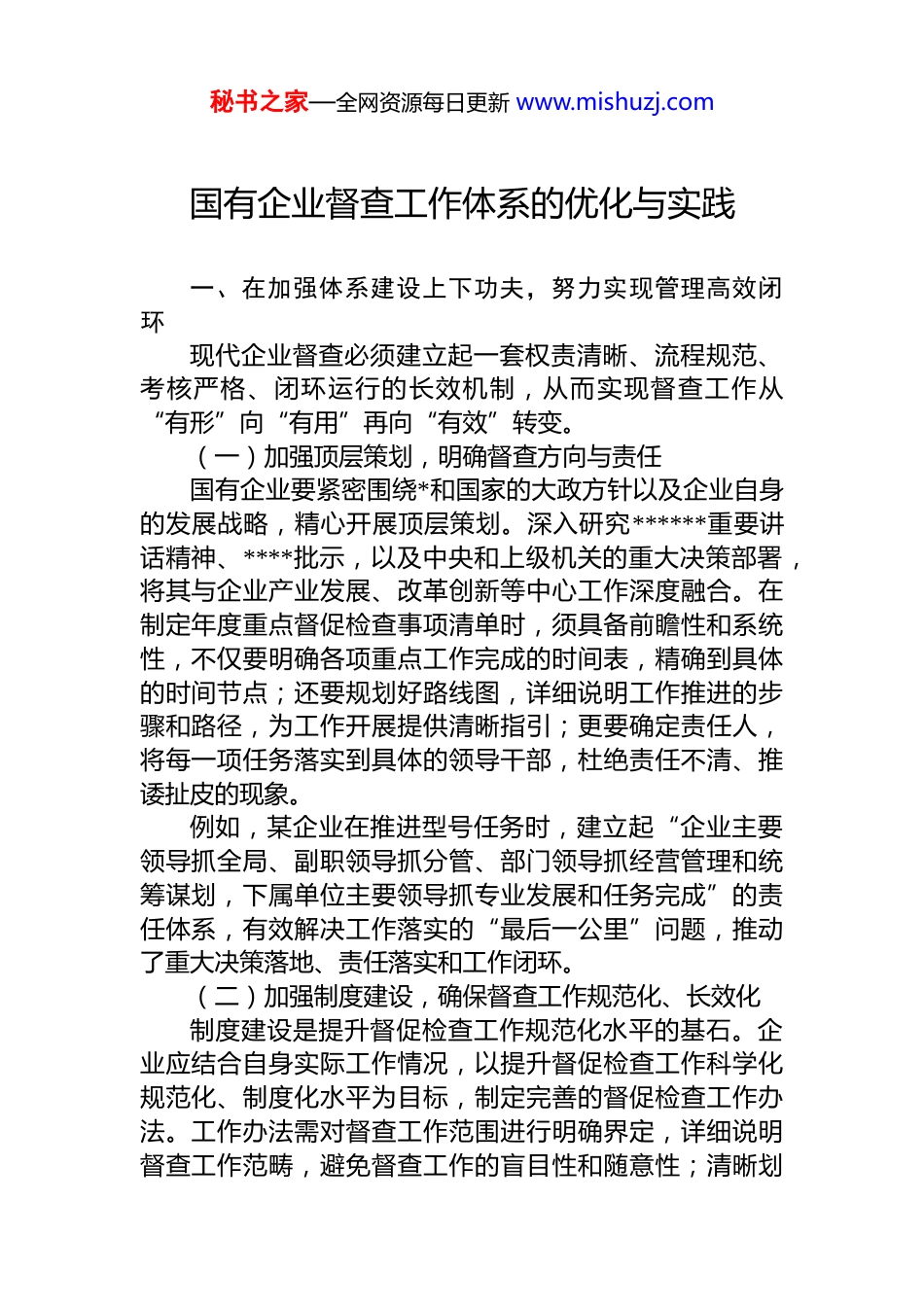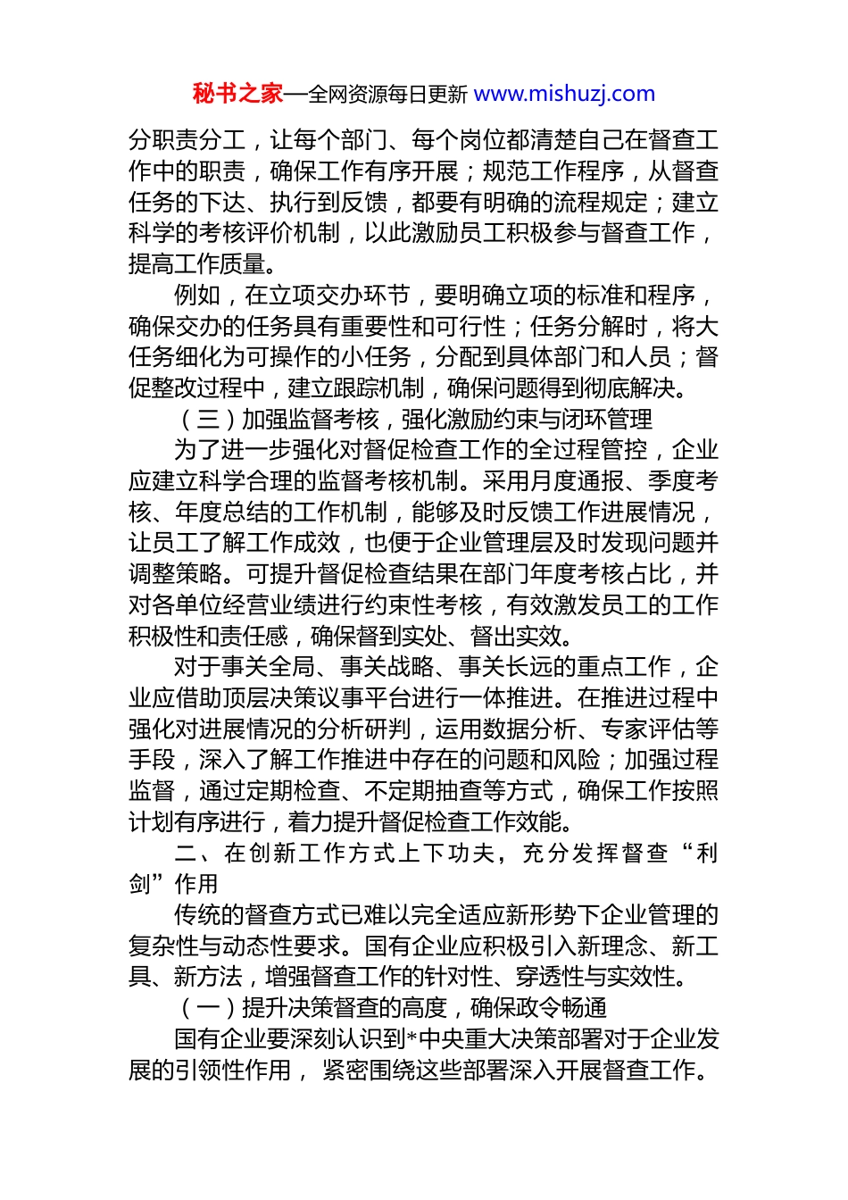 秘书之家—全网资源每日更新 www.mishuzj.com国有企业督查工作体系的优化与实践一、在加强体系建设上下功夫,努力实现管理高效闭环现代企业督查必须建立起一套权责清晰、流程规范、考核严格、闭环运行的长效机制,从而实现督查工作从“有形”向“有用”再向“有效”转变。(一)加强顶层策划,明确督查方向与责任国有企业要紧密围绕*和国家的大政方针以及企业自身的发展战略,精心开展顶层策划。深入研究******重要讲话精神、****批示,以及中央和上级机关的重大决策部署,将其与企业产业发展、改革创新等中心工作深度融合。在制定年度重点督促检查事项清单时,须具备前瞻性和系统性,不仅要明确各项重点工作完成的时间表,精确到具体的时间节点;还要规划好路线图,详细说明工作推进的步骤和路径,为工作开展提供清晰指引;更要确定责任人,将每一项任务落实到具体的领导干部,杜绝责任不清、推诿扯皮的现象。例如,某企业在推进型号任务时,建立起“企业主要领导抓全局、副职领导抓分管、部门领导抓经营管理和统筹谋划,下属单位主要领导抓专业发展和任务完成”的责任体系,有效解决工作落实的“最后一公里”问题,推动了重大决策落地、责任落实和工作闭环。(二)加强制度建设,确保督查工作规范化、长效化制度建设是提升督促检查工作规范化水平的基石。企业应结合自身实际工作情况,以提升督促检查工作科学化规范化、制度化水平为目标,制定完善的督促检查工作办法。工作办法需对督查工作范围进行明确界定,详细说明督查工作范畴,避免督查工作的盲目性和随意性;清晰划秘书之家—全网资源每日更新 www.mishuzj.com分职责分工,让每个部门、每个岗位都清楚自己在督查工作中的职责,确保工作有序开展;规范工作程序,从督查任务的下达、执行到反馈,都要有明确的流程规定;建立科学的考核评价机制,以此激励员工积极参与督查工作,提高工作质量。例如,在立项交办环节,要明确立项的标准和程序,确保交办的任务具有重要性和可行性;任务分解时,将大任务细化为可操作的小任务,分配到具体部门和人员;督促整改过程中,建立跟踪机制,确保问题得到彻底解决。(三)加强监督考核,强化激励约束与闭环管理为了进一步强化对督促检查工作的全过程管控,企业应建立科学合理的监督考核机制。采用月度通报、季度考核、年度总结的工作机制,能够及时反馈工作进展情况,让员工了解工作成效,也便于企业管理层及时发现问题并调整策略。可提升督促检查结果在部门年度考核占比,并对各单位经营业绩进行约束性考核,有效激发员工的工作积极性和责任感,确保督到实处、督出实效。对于事关全局、事关战略、事关长远的重点工作,企业应借助顶层决策议事平台进行一体推进。在推进过程中强化对进展情况的分析研判,运用数据分析、专家评估等手段,深入了解工作推进中存在的问题和风险;加强过程监督,通过定期检查、不定期抽查等方式,确保工作按照计划有序进行,着力提升督促检查工作效能。二、在创新工作方式上下功夫,充分发挥督查“利剑”作用传统的督查方式已难以完全适应新形势下企业管理的复杂性与动态性要求。国有企业应积极引入新理念、新工具、新方法,增强督查工作的针对性、穿透性与实效性。(一)提升决策督查的高度,确保政令畅通国有企业要深刻认识到*中央重大决策部署对于企业发展的引领性作用, 紧密围绕这些部署深入开展督查工作。秘书之家—全网资源每日更新 www.mishuzj.com在实际操作中,要将责任层层压实,从企业高层到基层员工,都要明确自己在落实决策部署中的责任,形成全员参与、共同推进的良好局面。例如,某企业推进绿色生产工艺改造的过程中,主要领导亲自挂帅,成立专项工作小组,将责任落实到每个部门和车间,为每个环节都制定了详细的工作措施,并定期进行督查,以久久为功的定力、耐心和韧劲,确保工作措施落实落地、生根见效,助力企业成为行业内绿色生产的标杆。(二)加大督查调研的深度,破解发展难题聚焦企业科研生产、改革发展、经营管理等重点工作中存在的突出问题和短板问题,开展有针对性地督查调研在调研方式上,综合运用现场核查、实地暗访、随机...