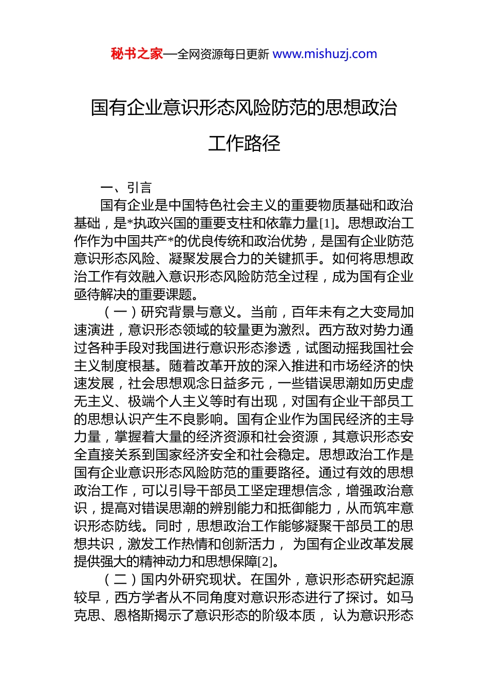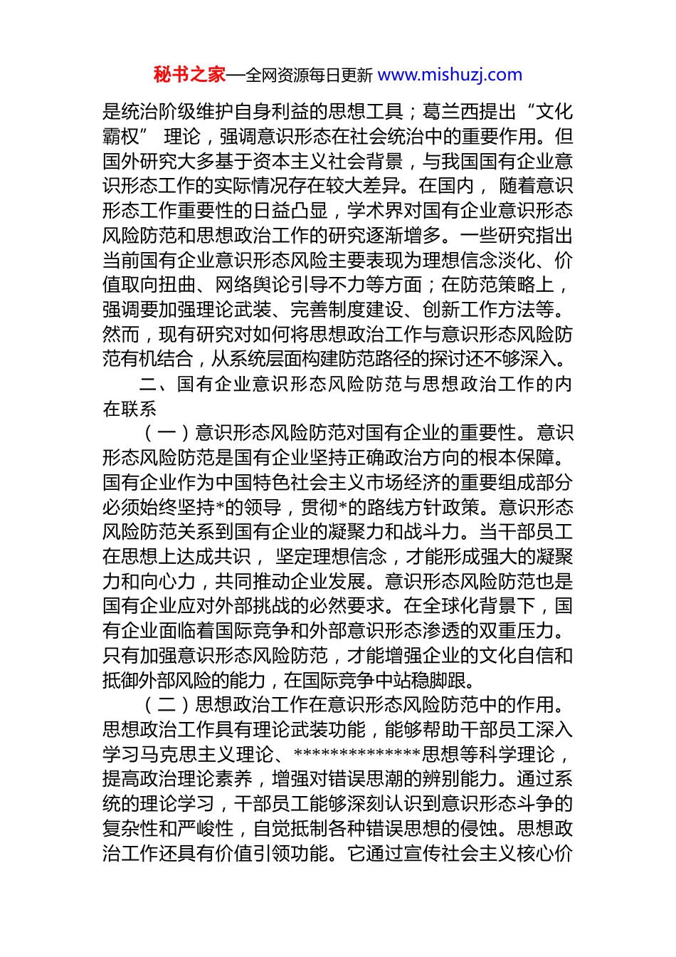 秘书之家—全网资源每日更新 www.mishuzj.com国有企业意识形态风险防范的思想政治工作路径一、引言国有企业是中国特色社会主义的重要物质基础和政治基础,是*执政兴国的重要支柱和依靠力量[1]。思想政治工作作为中国共产*的优良传统和政治优势,是国有企业防范意识形态风险、凝聚发展合力的关键抓手。如何将思想政治工作有效融入意识形态风险防范全过程,成为国有企业亟待解决的重要课题。(一)研究背景与意义。当前,百年未有之大变局加速演进,意识形态领域的较量更为激烈。西方敌对势力通过各种手段对我国进行意识形态渗透,试图动摇我国社会主义制度根基。随着改革开放的深入推进和市场经济的快速发展,社会思想观念日益多元,一些错误思潮如历史虚无主义、极端个人主义等时有出现,对国有企业干部员工的思想认识产生不良影响。国有企业作为国民经济的主导力量,掌握着大量的经济资源和社会资源,其意识形态安全直接关系到国家经济安全和社会稳定。思想政治工作是国有企业意识形态风险防范的重要路径。通过有效的思想政治工作,可以引导干部员工坚定理想信念,增强政治意识,提高对错误思潮的辨别能力和抵御能力,从而筑牢意识形态防线。同时,思想政治工作能够凝聚干部员工的思想共识,激发工作热情和创新活力, 为国有企业改革发展提供强大的精神动力和思想保障[2]。(二)国内外研究现状。在国外,意识形态研究起源较早,西方学者从不同角度对意识形态进行了探讨。如马克思、恩格斯揭示了意识形态的阶级本质, 认为意识形态秘书之家—全网资源每日更新 www.mishuzj.com是统治阶级维护自身利益的思想工具;葛兰西提出“文化霸权” 理论,强调意识形态在社会统治中的重要作用。但国外研究大多基于资本主义社会背景,与我国国有企业意识形态工作的实际情况存在较大差异。在国内, 随着意识形态工作重要性的日益凸显,学术界对国有企业意识形态风险防范和思想政治工作的研究逐渐增多。一些研究指出当前国有企业意识形态风险主要表现为理想信念淡化、价值取向扭曲、网络舆论引导不力等方面;在防范策略上,强调要加强理论武装、完善制度建设、创新工作方法等。然而,现有研究对如何将思想政治工作与意识形态风险防范有机结合,从系统层面构建防范路径的探讨还不够深入。二、国有企业意识形态风险防范与思想政治工作的内在联系(一)意识形态风险防范对国有企业的重要性。意识形态风险防范是国有企业坚持正确政治方向的根本保障。国有企业作为中国特色社会主义市场经济的重要组成部分必须始终坚持*的领导,贯彻*的路线方针政策。意识形态风险防范关系到国有企业的凝聚力和战斗力。当干部员工在思想上达成共识, 坚定理想信念,才能形成强大的凝聚力和向心力,共同推动企业发展。意识形态风险防范也是国有企业应对外部挑战的必然要求。在全球化背景下,国有企业面临着国际竞争和外部意识形态渗透的双重压力。只有加强意识形态风险防范,才能增强企业的文化自信和抵御外部风险的能力,在国际竞争中站稳脚跟。(二)思想政治工作在意识形态风险防范中的作用。思想政治工作具有理论武装功能,能够帮助干部员工深入学习马克思主义理论、**************思想等科学理论,提高政治理论素养,增强对错误思潮的辨别能力。通过系统的理论学习,干部员工能够深刻认识到意识形态斗争的复杂性和严峻性,自觉抵制各种错误思想的侵蚀。思想政治工作还具有价值引领功能。它通过宣传社会主义核心价秘书之家—全网资源每日更新 www.mishuzj.com值观,引导干部员工树立正确的世界观、人生观、价值观形成积极向上的价值取向。在意识形态风险防范中,思想政治工作能够帮助员工明辨是非,坚守道德底线,避免受到不良价值观念的影响。此外, 思想政治工作具有凝聚共识功能。通过开展各种形式的思想政治教育活动,能够增进干部员工之间的沟通与理解,消除思想分歧,形成共同的奋斗目标和价值追求。三、对标学习教育,把握思想政治工作方向(一)学习教育对国有企业思想政治工作的导向作用。各类学习教育活动的开展为国有企业思想政治工作提供了重要契机。学习教育活动以*的最新理论成果和政策要求...