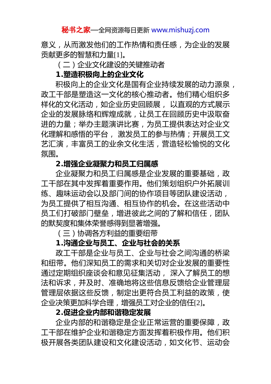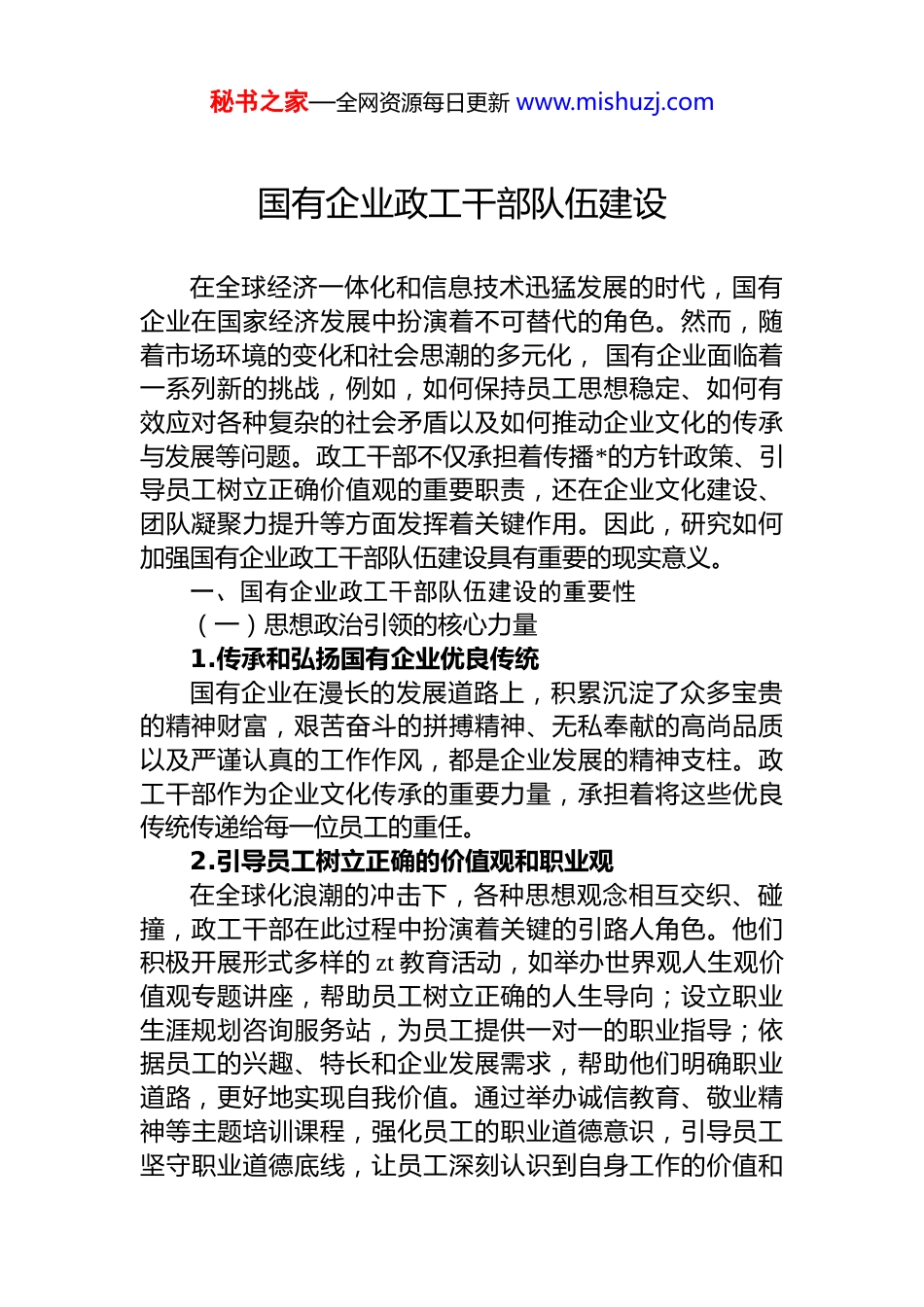 秘书之家—全网资源每日更新 www.mishuzj.com国有企业政工干部队伍建设在全球经济一体化和信息技术迅猛发展的时代,国有企业在国家经济发展中扮演着不可替代的角色。然而,随着市场环境的变化和社会思潮的多元化, 国有企业面临着一系列新的挑战,例如,如何保持员工思想稳定、如何有效应对各种复杂的社会矛盾以及如何推动企业文化的传承与发展等问题。政工干部不仅承担着传播*的方针政策、引导员工树立正确价值观的重要职责,还在企业文化建设、团队凝聚力提升等方面发挥着关键作用。因此,研究如何加强国有企业政工干部队伍建设具有重要的现实意义。一、国有企业政工干部队伍建设的重要性(一)思想政治引领的核心力量1.传承和弘扬国有企业优良传统国有企业在漫长的发展道路上,积累沉淀了众多宝贵的精神财富,艰苦奋斗的拼搏精神、无私奉献的高尚品质以及严谨认真的工作作风,都是企业发展的精神支柱。政工干部作为企业文化传承的重要力量,承担着将这些优良传统传递给每一位员工的重任。2.引导员工树立正确的价值观和职业观在全球化浪潮的冲击下,各种思想观念相互交织、碰撞,政工干部在此过程中扮演着关键的引路人角色。他们积极开展形式多样的 zt 教育活动,如举办世界观人生观价值观专题讲座,帮助员工树立正确的人生导向;设立职业生涯规划咨询服务站,为员工提供一对一的职业指导;依据员工的兴趣、特长和企业发展需求,帮助他们明确职业道路,更好地实现自我价值。通过举办诚信教育、敬业精神等主题培训课程,强化员工的职业道德意识,引导员工坚守职业道德底线,让员工深刻认识到自身工作的价值和秘书之家—全网资源每日更新 www.mishuzj.com意义,从而激发他们的工作热情和责任感,为企业的发展贡献更多的智慧和力量[1]。(二)企业文化建设的关键推动者1.塑造积极向上的企业文化积极向上的企业文化是国有企业持续发展的动力源泉,政工干部是塑造这一文化的核心推动者。他们精心组织多样化的文化活动,如企业历史回顾展, 以直观的方式展示企业的发展脉络和辉煌成就,让员工在回顾历史中汲取奋进的力量;举办主题演讲比赛,为员工提供表达对企业文化理解和感悟的平台, 激发员工的参与热情;开展员工文艺汇演,丰富员工的业余文化生活,营造轻松愉悦的文化氛围。2.增强企业凝聚力和员工归属感企业凝聚力和员工归属感是企业发展的重要基础,政工干部在其中发挥着重要作用。他们策划组织户外拓展训练、趣味运动会以及部门间的协作项目等团队建设活动,为员工提供了相互沟通、相互协作的机会。在这些活动中员工们打破部门壁垒,增进彼此之间的了解和信任,团队的默契度和集体荣誉感得到显著增强。(三)协调各方利益的重要纽带1.沟通企业与员工、企业与社会的关系政工干部是企业与员工、企业与社会之间沟通的桥梁和纽带。他们深知员工的需求和关切对企业发展的重要性通过定期组织座谈会和意见征集活动, 深入了解员工的想法和诉求,并及时、准确地将这些信息反馈给企业管理层管理层依据这些反馈,制定出更符合员工利益的政策,使企业决策更加科学合理,增强员工对企业的信任[2]。2.促进企业内部和谐稳定发展企业内部的和谐稳定是企业正常运营的重要保障,政工干部在维护企业和谐稳定方面发挥着积极作用。他们积极开展各类团队建设和文化建设活动,如文化节、运动会秘书之家—全网资源每日更新 www.mishuzj.com等,这些活动为员工提供了展示自我的平台,增进了员工之间的理解和合作,营造了良好的工作氛围。二、加强国企政工干部队伍建设的策略与方法(一)完善思想政治教育体系1.构建系统政治理论学习机制国有企业要为政工干部打造系统、全面的政治理论学习体系。一方面,精心制定培训规划,将马克思主义基本原理、**************思想作为核心学习内容。另一方面,在学习形式上,可以采取多元化方式。每月定期组织专题讲座,邀请专家学者深入解读理论精髓;举办读书班,鼓励政工干部自主研读经典著作,开展交流研讨,加深对理论的理解;充分利用现代信息技术,搭建线上学习平台,提供丰富的学习资料,包括视频课程、电子书籍、案例分析等,方便政工干部随时学习...
