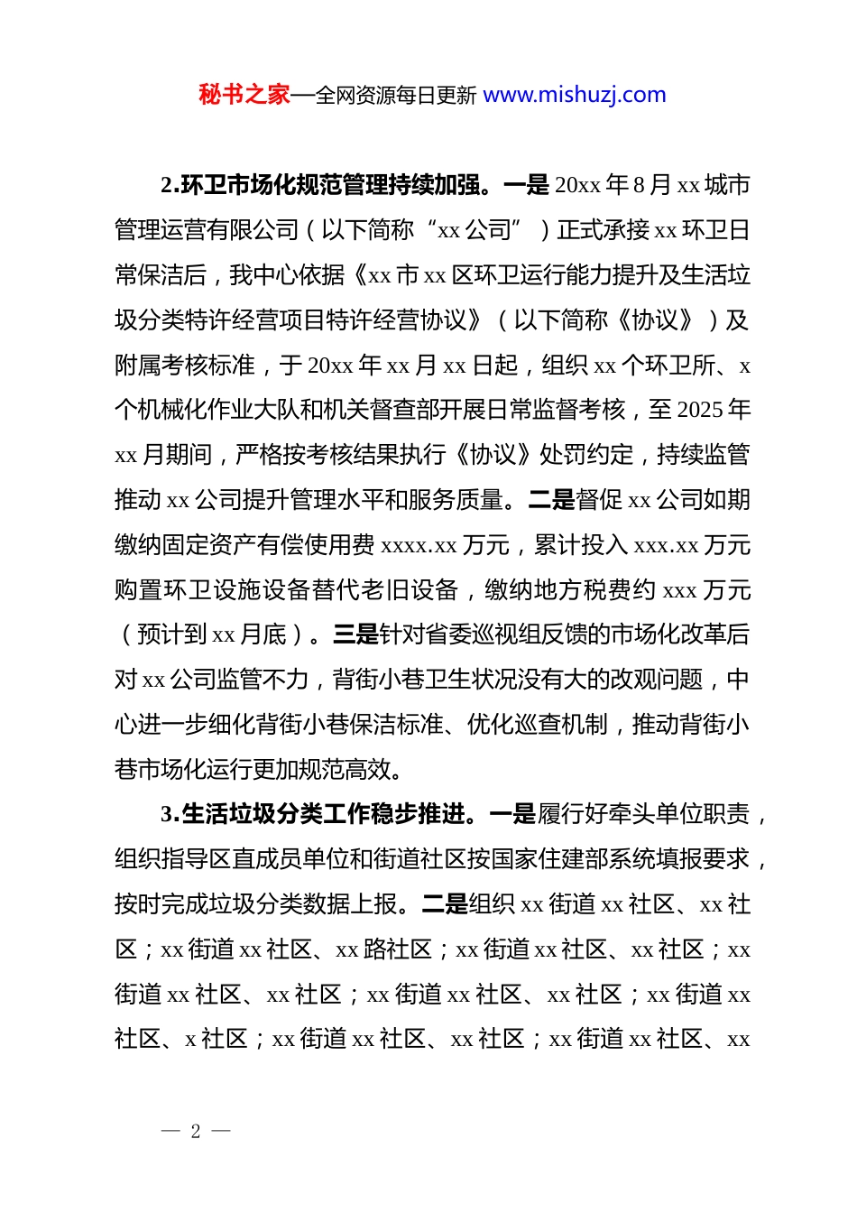 秘书之家—全网资源每日更新 www.mishuzj.com环境卫生工作服务中心 2025 年工作总结(公司)2025 年,区环卫服务中心在区委、区政府的坚强领导下,紧紧围绕年度重点任务,统筹推进环卫市场化运行监管、垃圾分类、环卫基础设施建设、重大活动保障等核心工作,为全区经济社会发展营造了洁净、优美、有序的城市环境。现将全年工作情况总结如下:一、2025 年工作完成情况1.专项整治行动成效显著。2025 年,我中心聚焦城市环境卫生突出问题,精准发力破解环境治理难点,全年组织 xx 公司累计开展城区“大清扫、大清洗、大清运”专项整治行动 xx 次,以集中攻坚推动市容面貌持续提升。其中,针对餐饮门店周边、夜市街区等重点区域的地面油污问题,开展专项整治行动 xx 次,组织作业力量采用高压冲洗与人工擦洗相结合的方式,累计清洗地面油污 xxxx 余处,有效解决路面油污污染、黏腻湿滑等问题。围绕背街小巷卫生死角多、保洁难度大的痛点,开展背街小巷专项整治行动 x 次,重点清理杂物堆积、垃圾滞留等问题,累计排查并清理卫生死角 xxxx 处,清运各类垃圾 xxx 吨,推动背街小巷整体环境卫生根本性转变,切实回应群众关切。— 1 —秘书之家—全网资源每日更新 www.mishuzj.com2.环卫市场化规范管理持续加强。一是 20xx 年 8 月 xx 城市管理运营有限公司(以下简称“xx 公司”)正式承接 xx 环卫日常保洁后,我中心依据《xx 市 xx 区环卫运行能力提升及生活垃圾分类特许经营项目特许经营协议》(以下简称《协议》)及附属考核标准,于 20xx 年 xx 月 xx 日起,组织 xx 个环卫所、x个机械化作业大队和机关督查部开展日常监督考核,至 2025 年xx 月期间,严格按考核结果执行《协议》处罚约定,持续监管推动 xx 公司提升管理水平和服务质量。二是督促 xx 公司如期缴纳固定资产有偿使用费 xxxx.xx 万元,累计投入 xxx.xx 万元购置环卫设施设备替代老旧设备,缴纳地方税费约 xxx 万元(预计到 xx 月底)。三是针对省委巡视组反馈的市场化改革后对 xx 公司监管不力,背街小巷卫生状况没有大的改观问题,中心进一步细化背街小巷保洁标准、优化巡查机制,推动背街小巷市场化运行更加规范高效。3.生活垃圾分类工作稳步推进。一是履行好牵头单位职责,组织指导区直成员单位和街道社区按国家住建部系统填报要求,按时完成垃圾分类数据上报。二是组织 xx 街道 xx 社区、xx 社区;xx 街道 xx 社区、xx 路社区;xx 街道 xx 社区、xx 社区;xx街道 xx 社区、xx 社区;xx 街道 xx 社区、xx 社区;xx 街道 xx社区、x 社区;xx 街道 xx 社区、xx 社区;xx 街道 xx 社区、xx— 2 —秘书之家—全网资源每日更新 www.mishuzj.com路社区等 xx 个社区的 xx 个小区开展生活垃圾分类工作,新建垃圾分类亭 xx 座、大件垃圾及建筑垃圾暂存点 xx 个、小型可回收物站点 xx 个。全力开展示范区域创建,通过示范引领作用,由点带面全面提升主城区生活垃圾分类工作全覆盖。三是开展街道专干专题培训 x 场次,指导区直成员单位和街道社区开展形式多样的宣传活动,提升市民对生活垃圾分类工作的知晓率和参与率,为全区生活垃圾分类工作深入推进夯实基础。4.环卫基础设施短板加快补齐。一是城乡垃圾综合利用建设及改造项目(大型生活垃圾分拣转运中心)已于 2025 年 xx月中旬竣工,现正在对接市级财政明确经费保障,计划 2026 年正式投入运行。二是涉及区级民生实事项目的 x 座垃圾中转站除臭设备提质改造,已于 2025 年 x 月全面完成并投入使用,均升级为“双向流离子净化负压除臭设备”,显著改善了站内及外围空气环境质量。三是为系统性补齐环卫基础设施短板,针对目前环卫工作紧缺的环卫车辆停保场、淤泥处理等设施设备,积极谋划了 x 个“十五五”时期重点项目,预估总投资 x.x 亿元。5.重大活动保障任务圆满完成。一是指导 xx 公司组织 xxxx余名环卫人员、xxx 余台作业车辆高质量完成 第二届湖南(xx)rcep 经贸博览会、第五届湖南旅游发展大会、省级文明城市复检等重大活动环境卫生...