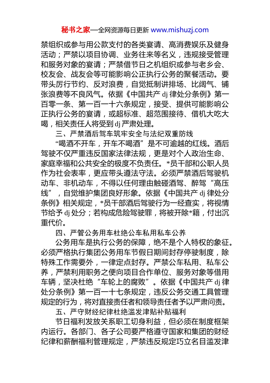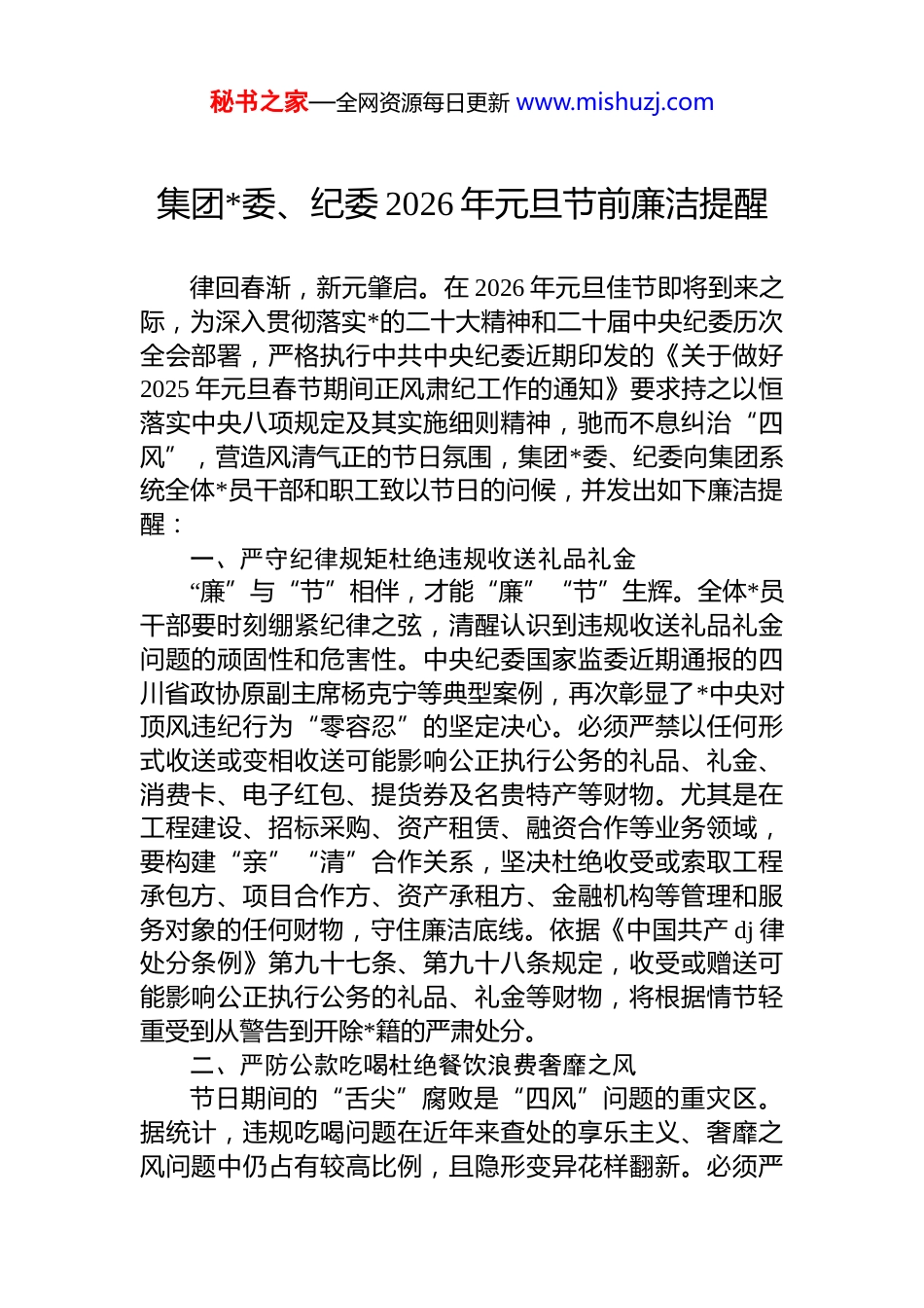 秘书之家—全网资源每日更新 www.mishuzj.com集团*委、纪委 2026 年元旦节前廉洁提醒律回春渐,新元肇启。在 2026 年元旦佳节即将到来之际,为深入贯彻落实*的二十大精神和二十届中央纪委历次全会部署,严格执行中共中央纪委近期印发的《关于做好2025 年元旦春节期间正风肃纪工作的通知》要求持之以恒落实中央八项规定及其实施细则精神,驰而不息纠治“四风”,营造风清气正的节日氛围,集团*委、纪委向集团系统全体*员干部和职工致以节日的问候,并发出如下廉洁提醒:一、严守纪律规矩杜绝违规收送礼品礼金“廉”与“节”相伴,才能“廉”“节”生辉。全体*员干部要时刻绷紧纪律之弦,清醒认识到违规收送礼品礼金问题的顽固性和危害性。中央纪委国家监委近期通报的四川省政协原副主席杨克宁等典型案例,再次彰显了*中央对顶风违纪行为“零容忍”的坚定决心。必须严禁以任何形式收送或变相收送可能影响公正执行公务的礼品、礼金、消费卡、电子红包、提货券及名贵特产等财物。尤其是在工程建设、招标采购、资产租赁、融资合作等业务领域,要构建“亲”“清”合作关系,坚决杜绝收受或索取工程承包方、项目合作方、资产承租方、金融机构等管理和服务对象的任何财物,守住廉洁底线。依据《中国共产 dj 律处分条例》第九十七条、第九十八条规定,收受或赠送可能影响公正执行公务的礼品、礼金等财物,将根据情节轻重受到从警告到开除*籍的严肃处分。二、严防公款吃喝杜绝餐饮浪费奢靡之风节日期间的“舌尖”腐败是“四风”问题的重灾区。据统计,违规吃喝问题在近年来查处的享乐主义、奢靡之风问题中仍占有较高比例,且隐形变异花样翻新。必须严秘书之家—全网资源每日更新 www.mishuzj.com禁组织或参与用公款支付的各类宴请、高消费娱乐及健身活动;严禁以项目协调、业务往来等名义,违规接受管理和服务对象的宴请;严禁借节日之机组织或参与老乡会、校友会、战友会等可能影响公正执行公务的聚餐活动。要带头厉行节约、反对浪费,自觉抵制讲排场、比阔气、铺张浪费等不良风气。依据《中国共产 dj 律处分条例》第一百零一条、第一百一十六条规定,接受、提供可能影响公正执行公务的宴请,或超标准、超范围接待、借机大吃大喝,相关责任人将受到 dj 严肃处理。三、严禁酒后驾车筑牢安全与法纪双重防线“喝酒不开车,开车不喝酒”是不可逾越的红线。酒后驾驶不仅严重违反国家法律法规,更是对个人政治生命、家庭幸福和公共安全的极度不负责任。*员干部和公职人员作为社会表率,更应带头遵法守法。必须严禁酒后驾驶机动车、非机动车,不得以任何理由触碰酒驾、醉驾“高压线”,自觉维护集团良好形象。依据《中国共产 dj 律处分条例》相关规定,*员干部酒后驾驶行为一经查实,将视情节给予 dj 处分;若构成危险驾驶罪,将被开除*籍,付出沉重代价。四、严管公务用车杜绝公车私用私车公养公务用车是执行公务的保障,绝不是个人特权的象征。必须严格执行集团公务用车节假日期间封存停驶制度,除特殊工作需要外,一律定点封存。严禁公车私用、私车公养,严禁利用职务之便向项目合作单位、服务对象等借用车辆,坚决杜绝“车轮上的腐败”。依据《中国共产 dj 律处分条例》第一百一十七条规定,违反公务交通工具管理规定的行为,将对直接责任者和领导责任者予以严肃问责。五、严守财经纪律杜绝滥发津贴补贴福利节日福利发放关系职工切身利益,但必须在制度框架内运行。各部门、各子公司要严格遵守国家和集团的财经纪律和薪酬福利管理规定,严禁违反规定巧立名目滥发津秘书之家—全网资源每日更新 www.mishuzj.com贴、补贴、奖金和实物,杜绝以节日慰问等名义变相为个人谋取不当利益。依据《中国共产 dj 律处分条例》第一百一十四条规定,违规自定薪酬或滥发津补贴、奖金、福利等,将根据情节对相关责任人给予严肃处分,直至开除*籍。六、严于律己修身杜绝其他违纪违法行为节日期间是放松身心的时刻,但绝不是放松纪律要求的“假期”。必须严禁组织或参与任何形式的赌博、封建迷信活动;严禁违规大操大办婚丧喜庆事宜并借机敛财;严禁违反节日期间值班值守、外出报备等规定,...