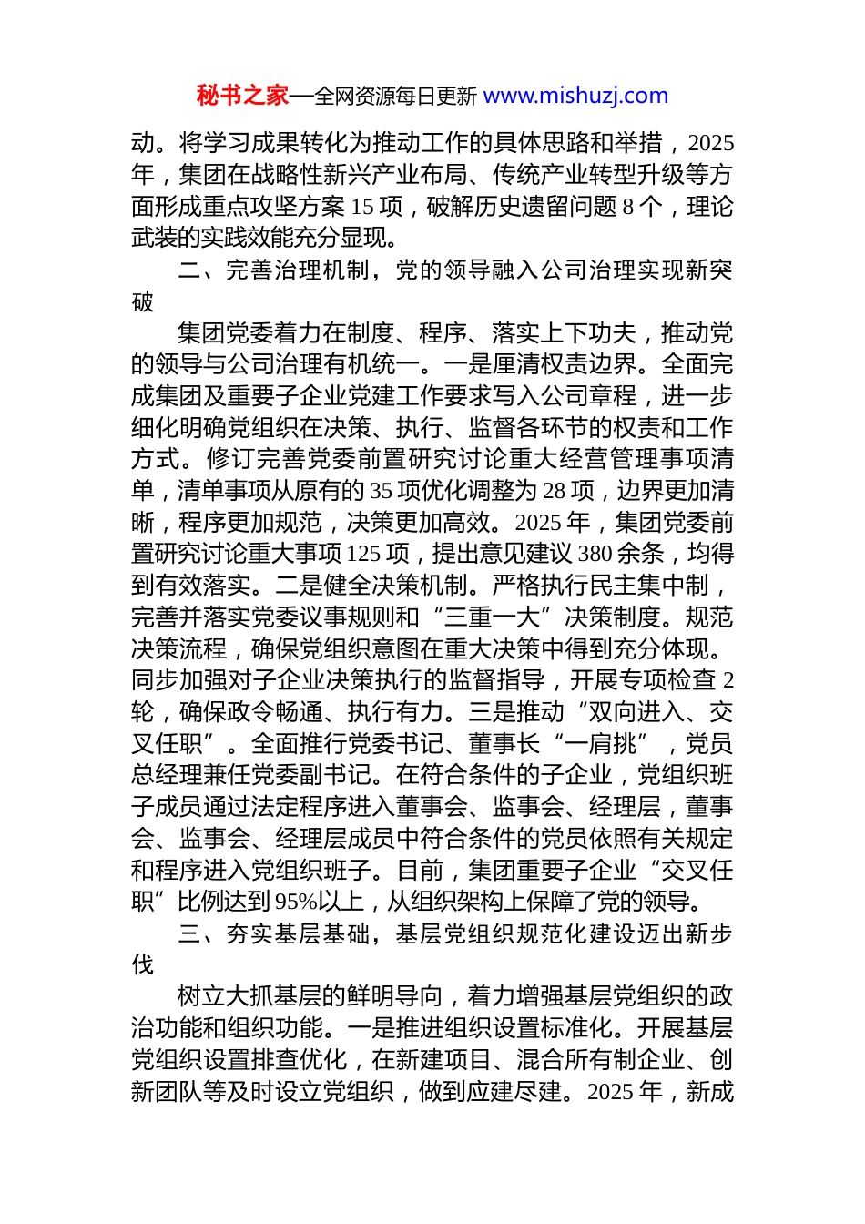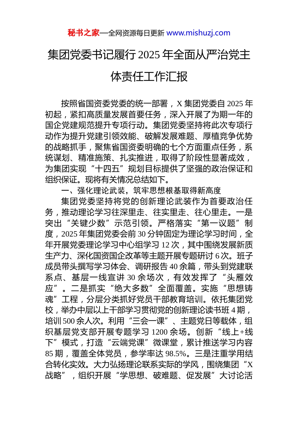 秘书之家—全网资源每日更新 www.mishuzj.com集团党委书记履行 2025 年全面从严治党主体责任工作汇报按照省国资委党委的统一部署,X 集团党委自 2025 年初起,紧扣高质量发展首要任务,深入开展了为期一年的国企党建规范提升专项行动。集团党委坚持将此次专项行动作为提升党建引领效能、破解发展难题、厚植竞争优势的战略抓手,聚焦省国资委明确的七个方面重点任务,系统谋划、精准施策、扎实推进,取得了阶段性显著成效,为集团实现“十四五”规划目标提供了坚强的政治保证和组织保证。现将有关情况总结如下。一、强化理论武装,筑牢思想根基取得新高度集团党委坚持将党的创新理论武装作为首要政治任务,推动理论学习往深里走、往实里走、往心里走。一是突出“关键少数”示范引领。严格落实“第一议题”制度,2025 年集团党委会前 30 分钟固定为理论学习时间,全年开展党委理论学习中心组学习 12 次,其中围绕发展新质生产力、深化国资国企改革等主题开展专题研讨 6 次。班子成员带头撰写学习体会、调研报告 40 余篇,带头到党建联系点、基层一线宣讲 30 余场次,有效发挥了“头雁效应”。二是抓实“绝大多数”全面覆盖。实施“思想铸魂”工程,分层分类抓好党员干部教育培训。依托集团党校,举办中层以上干部学习贯彻党的创新理论读书班 4 期,培训 500 余人次。利用“三会一课”、主题党日等载体,组织基层党支部开展专题学习 1200 余场。创新“线上+线下”模式,打造“云端党课”微课堂,累计推送学习内容85 期,覆盖全体党员,参学率达 98.5%。三是注重学用结合转化实效。大力弘扬理论联系实际的学风,围绕集团“X战略”,组织开展“学思想、破难题、促发展”大讨论活秘书之家—全网资源每日更新 www.mishuzj.com动。将学习成果转化为推动工作的具体思路和举措,2025年,集团在战略性新兴产业布局、传统产业转型升级等方面形成重点攻坚方案 15 项,破解历史遗留问题 8 个,理论武装的实践效能充分显现。二、完善治理机制,党的领导融入公司治理实现新突破集团党委着力在制度、程序、落实上下功夫,推动党的领导与公司治理有机统一。一是厘清权责边界。全面完成集团及重要子企业党建工作要求写入公司章程,进一步细化明确党组织在决策、执行、监督各环节的权责和工作方式。修订完善党委前置研究讨论重大经营管理事项清单,清单事项从原有的 35 项优化调整为 28 项,边界更加清晰,程序更加规范,决策更加高效。2025 年,集团党委前置研究讨论重大事项 125 项,提出意见建议 380 余条,均得到有效落实。二是健全决策机制。严格执行民主集中制,完善并落实党委议事规则和“三重一大”决策制度。规范决策流程,确保党组织意图在重大决策中得到充分体现。同步加强对子企业决策执行的监督指导,开展专项检查 2轮,确保政令畅通、执行有力。三是推动“双向进入、交叉任职”。全面推行党委书记、董事长“一肩挑”,党员总经理兼任党委副书记。在符合条件的子企业,党组织班子成员通过法定程序进入董事会、监事会、经理层,董事会、监事会、经理层成员中符合条件的党员依照有关规定和程序进入党组织班子。目前,集团重要子企业“交叉任职”比例达到 95%以上,从组织架构上保障了党的领导。三、夯实基层基础,基层党组织规范化建设迈出新步伐树立大抓基层的鲜明导向,着力增强基层党组织的政治功能和组织功能。一是推进组织设置标准化。开展基层党组织设置排查优化,在新建项目、混合所有制企业、创新团队等及时设立党组织,做到应建尽建。2025 年,新成秘书之家—全网资源每日更新 www.mishuzj.com立基层党支部 12 个,调整优化设置不合理的党支部 5 个。深化“支部建在连上”,在 X 重点工程项目部、X 科研攻关团队等一线单元设立党员责任区、党员示范岗 165 个。二是推进组织生活制度化。严格执行“三会一课”、组织生活会、民主评议党员、谈心谈话等基本制度。印发《党支部工作标准化手册》,统一规范记录格式和流程。集团党委班子成员均以普通党员身份参加所在支部组织生活,并建立基层党支部联系点 22 个,全年深入联系点...
