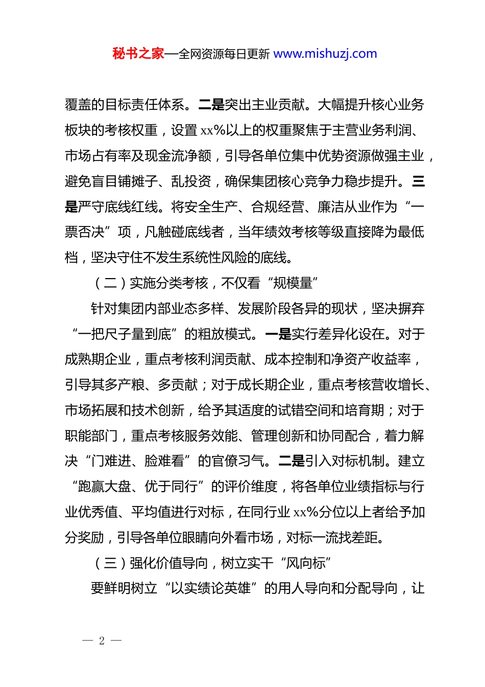 秘书之家—全网资源每日更新 www.mishuzj.com集团公司 2025 年度绩效考核方案:聚焦价值创造,激活内生动力2025 年是集团公司深化改革、决胜高质量发展的关键之年,也是推进业务转型升级、实现跨越式发展的攻坚之年。面对日益复杂的外部市场环境和激烈的行业竞争态势,唯有建立科学、精准、高效的绩效考核体系,才能有效传导战略压力,激发全员干事创业热情。为全面贯彻集团发展战略,破除“大锅饭”思维,打破“平均主义”倾向,构建“业绩升薪酬升、业绩降薪酬降”的市场化分配机制,特制定本方案。一、坚持战略引领,把准考核“风向标”绩效考核不仅是分配价值的工具,更是创造价值的抓手。2025 年度考核工作必须紧紧围绕集团总体战略目标,坚持以业绩论英雄、以结果论成败,确保集团上下思想统一、步调一致、行动有力。(一)锚定核心目标,筑牢发展“压舱石”必须将集团年度经营目标无缝分解至各子公司、各部门及每一位员工,确保千斤重担人人挑。一是强化目标承接。各考核单元要依据集团下达的 xx 亿元营收、xx 亿元利润等核心指标,层层签订目标责任书,确保指标不悬空、责任不打折,形成全— 1 —秘书之家—全网资源每日更新 www.mishuzj.com覆盖的目标责任体系。二是突出主业贡献。大幅提升核心业务板块的考核权重,设置 xx%以上的权重聚焦于主营业务利润、市场占有率及现金流净额,引导各单位集中优势资源做强主业,避免盲目铺摊子、乱投资,确保集团核心竞争力稳步提升。三是严守底线红线。将安全生产、合规经营、廉洁从业作为“一票否决”项,凡触碰底线者,当年绩效考核等级直接降为最低档,坚决守住不发生系统性风险的底线。(二)实施分类考核,不仅看“规模量”针对集团内部业态多样、发展阶段各异的现状,坚决摒弃“一把尺子量到底”的粗放模式。一是实行差异化设在。对于成熟期企业,重点考核利润贡献、成本控制和净资产收益率,引导其多产粮、多贡献;对于成长期企业,重点考核营收增长、市场拓展和技术创新,给予其适度的试错空间和培育期;对于职能部门,重点考核服务效能、管理创新和协同配合,着力解决“门难进、脸难看”的官僚习气。二是引入对标机制。建立“跑赢大盘、优于同行”的评价维度,将各单位业绩指标与行业优秀值、平均值进行对标,在同行业 xx%分位以上者给予加分奖励,引导各单位眼睛向外看市场,对标一流找差距。(三)强化价值导向,树立实干“风向标”要鲜明树立“以实绩论英雄”的用人导向和分配导向,让— 2 —秘书之家—全网资源每日更新 www.mishuzj.com有为者有位、吃苦者吃香。一是坚持增量激励。在存量考核的基础上,加大对增量业绩的奖励力度,对于超额完成年度利润目标的单位,按超额部分的 xx%比例计提专项奖励基金,上不封顶,充分调动各单位做大蛋糕的积极性。二是鼓励创新突破。设立“重大项目突破奖”和“技术创新贡献奖”,对在关键核心技术攻关、重大市场项目落地中做出突出贡献的团队和个人,在年度绩效考核中给予单列加分,最高可上浮 xx%,营造勇于创新、敢于担当的良好氛围。二、优化指标体系,构建评价“多维镜”科学的指标体系是绩效考核的灵魂。2025 年考核指标将更加注重质量与效益的平衡、短期利益与长期发展的统筹,构建财务指标与非财务指标相结合、定量指标与定性指标相补充的立体化评价体系。(一)聚焦经营效益,做大真金“蓄水池”经济效益是企业生存发展的根本,必须始终把利润指标放在考核的首位。一是深化“两利四率”考核。将利润总额、净利润作为核心考核指标,权重合计不低于 xx%,同时纳入营业现金比率、资产负债率、研发经费投入强度、全员劳动生产率等指标,引导企业从单纯追求规模扩张向追求质量效益转变。二是强化成本管控。设置“可控费用下降率”和“成本费用利— 3 —秘书之家—全网资源每日更新 www.mishuzj.com润率”指标,倒逼各单位深入开展降本增效行动,严控非生产性支出,坚决压缩“三公”经费,确保每一分钱都花在刀刃上。三是关注现金流安全。针对当前市场回款难的问题,增设“应收账款周转率”和“经营性现金净流量”考核权重,实行“利润+现金流”双否决...