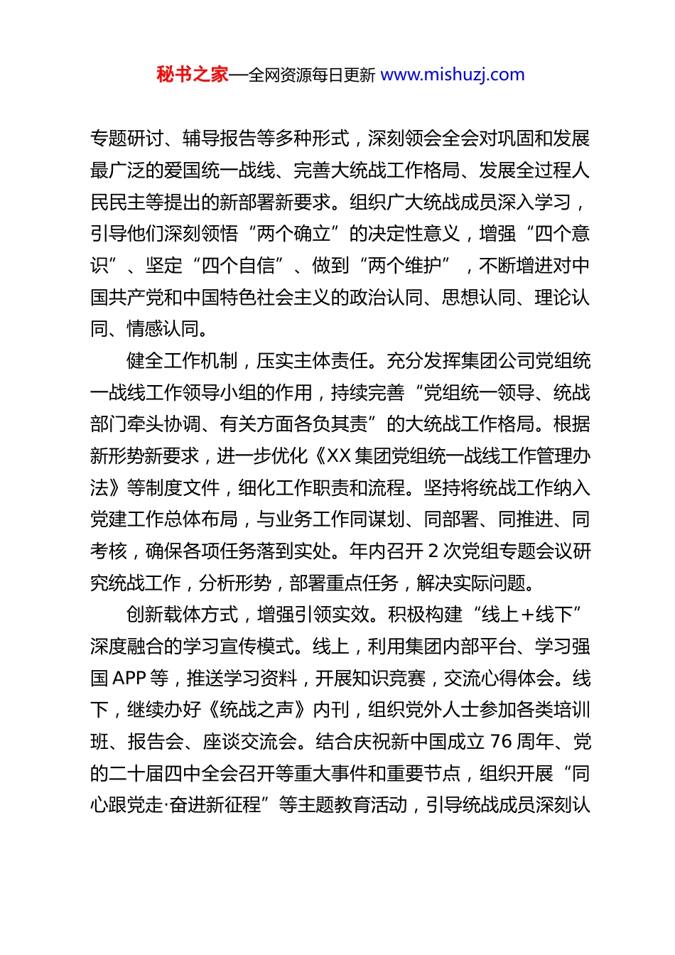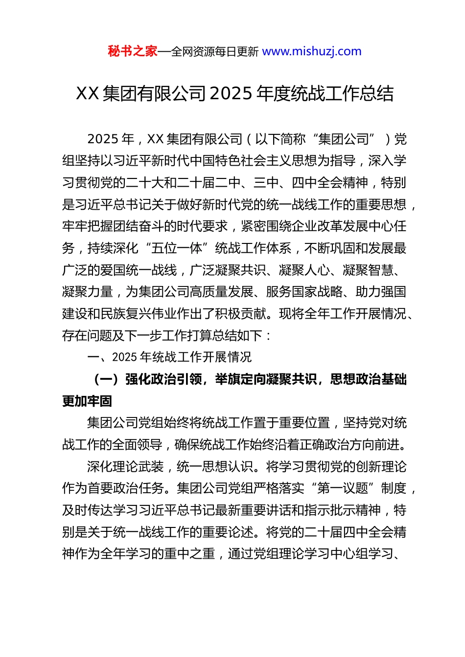 秘书之家—全网资源每日更新 www.mishuzj.comXX 集团有限公司 2025 年度统战工作总结2025 年,XX 集团有限公司(以下简称“集团公司”)党组坚持以习近平新时代中国特色社会主义思想为指导,深入学习贯彻党的二十大和二十届二中、三中、四中全会精神,特别是习近平总书记关于做好新时代党的统一战线工作的重要思想,牢牢把握团结奋斗的时代要求,紧密围绕企业改革发展中心任务,持续深化“五位一体”统战工作体系,不断巩固和发展最广泛的爱国统一战线,广泛凝聚共识、凝聚人心、凝聚智慧、凝聚力量,为集团公司高质量发展、服务国家战略、助力强国建设和民族复兴伟业作出了积极贡献。现将全年工作开展情况、存在问题及下一步工作打算总结如下:一、2025 年统战工作开展情况(一)强化政治引领,举旗定向凝聚共识,思想政治基础更加牢固集团公司党组始终将统战工作置于重要位置,坚持党对统战工作的全面领导,确保统战工作始终沿着正确政治方向前进。深化理论武装,统一思想认识。将学习贯彻党的创新理论作为首要政治任务。集团公司党组严格落实“第一议题”制度,及时传达学习习近平总书记最新重要讲话和指示批示精神,特别是关于统一战线工作的重要论述。将党的二十届四中全会精神作为全年学习的重中之重,通过党组理论学习中心组学习、秘书之家—全网资源每日更新 www.mishuzj.com专题研讨、辅导报告等多种形式,深刻领会全会对巩固和发展最广泛的爱国统一战线、完善大统战工作格局、发展全过程人民民主等提出的新部署新要求。组织广大统战成员深入学习,引导他们深刻领悟“两个确立”的决定性意义,增强“四个意识”、坚定“四个自信”、做到“两个维护”,不断增进对中国共产党和中国特色社会主义的政治认同、思想认同、理论认同、情感认同。健全工作机制,压实主体责任。充分发挥集团公司党组统一战线工作领导小组的作用,持续完善“党组统一领导、统战部门牵头协调、有关方面各负其责”的大统战工作格局。根据新形势新要求,进一步优化《XX 集团党组统一战线工作管理办法》等制度文件,细化工作职责和流程。坚持将统战工作纳入党建工作总体布局,与业务工作同谋划、同部署、同推进、同考核,确保各项任务落到实处。年内召开 2 次党组专题会议研究统战工作,分析形势,部署重点任务,解决实际问题。创新载体方式,增强引领实效。积极构建“线上+线下”深度融合的学习宣传模式。线上,利用集团内部平台、学习强国 APP 等,推送学习资料,开展知识竞赛,交流心得体会。线下,继续办好《统战之声》内刊,组织党外人士参加各类培训班、报告会、座谈交流会。结合庆祝新中国成立 76 周年、党的二十届四中全会召开等重大事件和重要节点,组织开展“同心跟党走·奋进新征程”等主题教育活动,引导统战成员深刻认秘书之家—全网资源每日更新 www.mishuzj.com识国家发展成就和集团发展前景,夯实团结奋斗的共同思想政治基础。(二)搭建平台载体,集思广益汇聚众智,服务发展成效更加显著集团公司积极为党外人士发挥作用搭建平台、创造条件,引导他们将智慧和力量凝聚到企业高质量发展上来。支持深入调研,破解发展难题。聚焦集团公司“十四五”规划中期评估与调整、能源保供、绿色低碳转型、科技创新、数字化转型、国际化经营等重大课题,继续支持党外人士组建专题调研组,深入基层一线开展调查研究。2025 年,共形成高质量调研报告 50 余篇,其中《关于新型电力系统背景下储能技术应用路径的调研》《关于海外项目风险防控与合规管理的建议》等多篇报告获得集团领导批示,为相关决策提供了重要参考。部分优秀成果被推荐至上级单位。畅通建言渠道,促进科学决策。进一步规范和提升党外代表人士建言献策工作室建设水平,明确年度攻关方向,完善激励机制。各工作室围绕生产经营、技术创新、管理提升等难点问题,积极献计出力。例如,大唐国际发电股份有限公司某工作室在燃煤机组灵活性改造方面提出关键技术方案,有效提升了机组调峰能力;XX 集团科研总院某工作室在新能源功率预测算法上取得突破,提升了预报精度。全年通过工作室渠道收集各类意见建议 200 余条,...