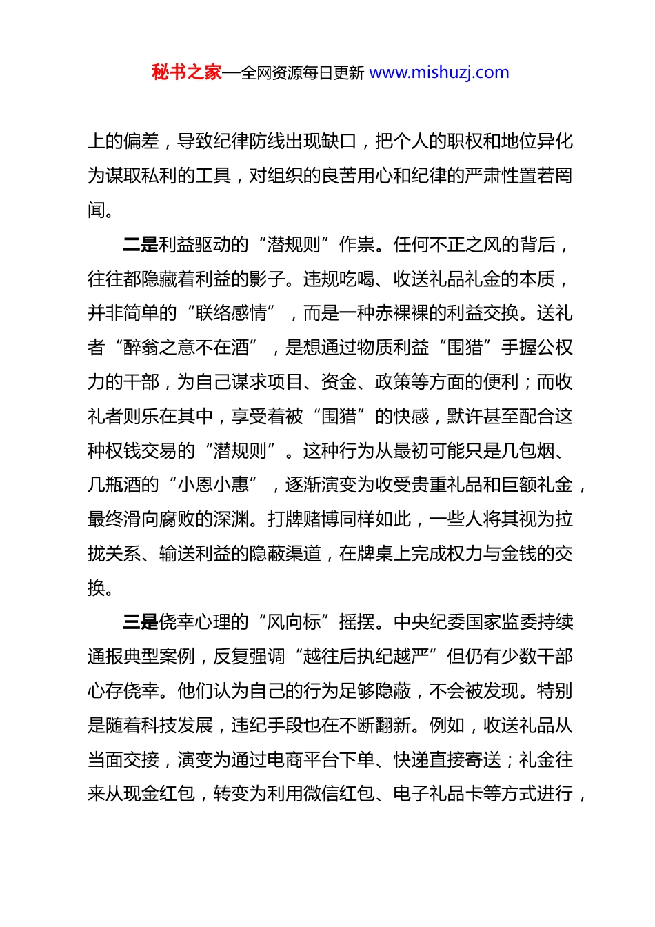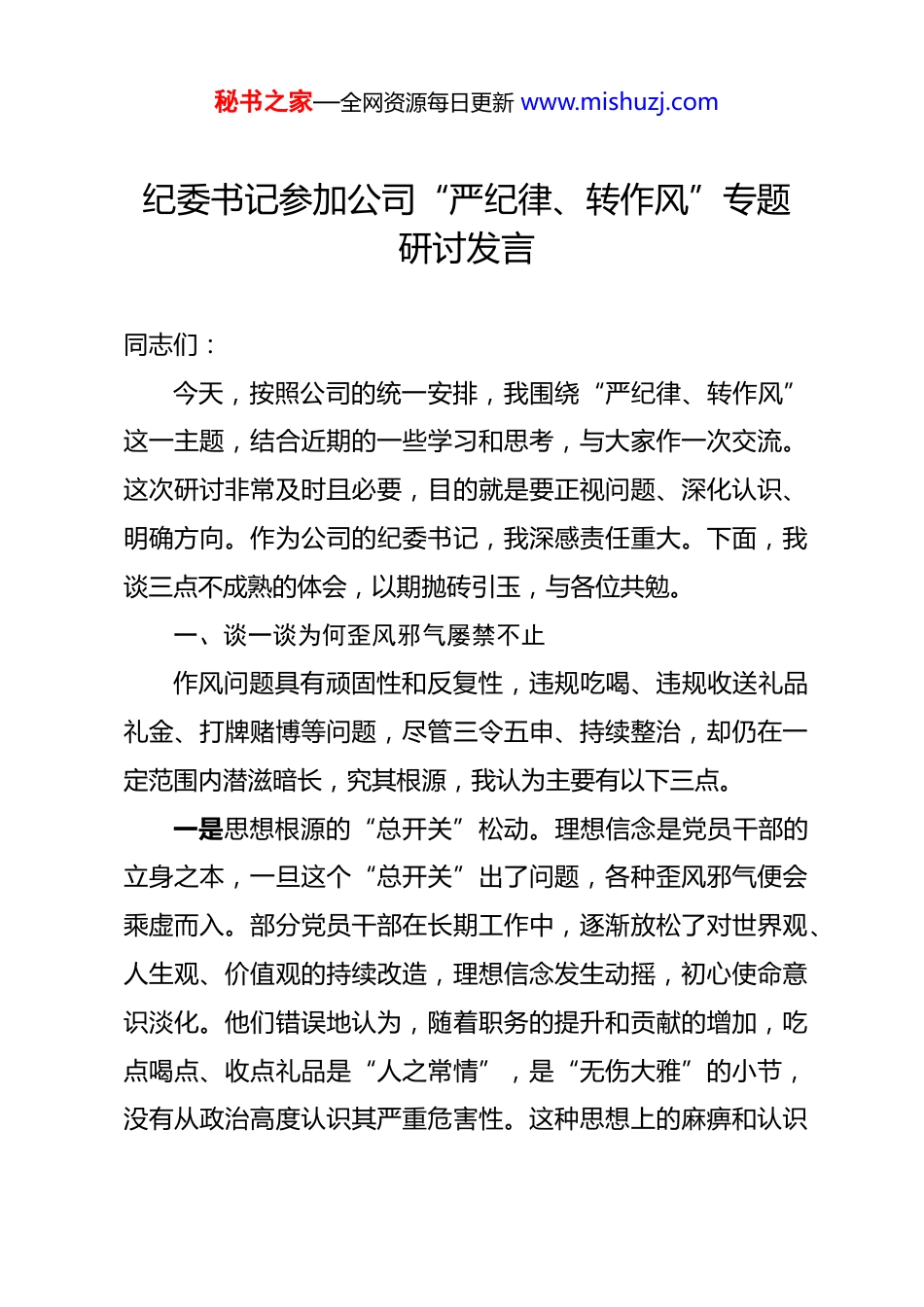 秘书之家—全网资源每日更新 www.mishuzj.com纪委书记参加公司“严纪律、转作风”专题研讨发言 同志们:今天,按照公司的统一安排,我围绕“严纪律、转作风”这一主题,结合近期的一些学习和思考,与大家作一次交流。这次研讨非常及时且必要,目的就是要正视问题、深化认识、明确方向。作为公司的纪委书记,我深感责任重大。下面,我谈三点不成熟的体会,以期抛砖引玉,与各位共勉。一、谈一谈为何歪风邪气屡禁不止作风问题具有顽固性和反复性,违规吃喝、违规收送礼品礼金、打牌赌博等问题,尽管三令五申、持续整治,却仍在一定范围内潜滋暗长,究其根源,我认为主要有以下三点。一是思想根源的“总开关”松动。理想信念是党员干部的立身之本,一旦这个“总开关”出了问题,各种歪风邪气便会乘虚而入。部分党员干部在长期工作中,逐渐放松了对世界观、人生观、价值观的持续改造,理想信念发生动摇,初心使命意识淡化。他们错误地认为,随着职务的提升和贡献的增加,吃点喝点、收点礼品是“人之常情”,是“无伤大雅”的小节,没有从政治高度认识其严重危害性。这种思想上的麻痹和认识秘书之家—全网资源每日更新 www.mishuzj.com上的偏差,导致纪律防线出现缺口,把个人的职权和地位异化为谋取私利的工具,对组织的良苦用心和纪律的严肃性置若罔闻。二是利益驱动的“潜规则”作祟。任何不正之风的背后,往往都隐藏着利益的影子。违规吃喝、收送礼品礼金的本质,并非简单的“联络感情”,而是一种赤裸裸的利益交换。送礼者“醉翁之意不在酒”,是想通过物质利益“围猎”手握公权力的干部,为自己谋求项目、资金、政策等方面的便利;而收礼者则乐在其中,享受着被“围猎”的快感,默许甚至配合这种权钱交易的“潜规则”。这种行为从最初可能只是几包烟、几瓶酒的“小恩小惠”,逐渐演变为收受贵重礼品和巨额礼金,最终滑向腐败的深渊。打牌赌博同样如此,一些人将其视为拉拢关系、输送利益的隐蔽渠道,在牌桌上完成权力与金钱的交换。三是侥幸心理的“风向标”摇摆。中央纪委国家监委持续通报典型案例,反复强调“越往后执纪越严”但仍有少数干部心存侥幸。他们认为自己的行为足够隐蔽,不会被发现。特别是随着科技发展,违纪手段也在不断翻新。例如,收送礼品从当面交接,演变为通过电商平台下单、快递直接寄送;礼金往来从现金红包,转变为利用微信红包、电子礼品卡等方式进行,秘书之家—全网资源每日更新 www.mishuzj.com大大增加了发现和查处的难度。这种“一对一”的隐蔽交接方式,加上一些人打着“走亲访友”、“专家咨询费”等幌子作掩护使得他们产生了“神不知、鬼不觉”的错觉,从而在违纪的道路上越走越远。二、理一理我们我们的差距在哪里对照中央和上级的严格要求,结合我们**建设投资有限公司作为工程建设投资类企业的行业特点,我认为在作风建设方面,我们还存在一些不容忽视的差距和短板。一是压力传导存在“上热下冷”现象。从中央到地方,各级纪检监察机关正以前所未有的力度正风肃纪,尤其是在元旦、春节等重要节点前后,更是密集部署,严查“四风”问题。公司层面也反复开会强调、发文要求,可以说,在高层级和机关层面,纪律的氛围是浓厚的。但是,这种压力在向下传导的过程中,存在逐级递减的现象。到了基层项目部、一线班组,一些同志可能会觉得“天高皇帝远”,监督的“探头”照不到,从而产生松懈思想。制度的执行力在“最后一公里”打了折扣,导致上级的严要求未能完全转化为基层的严作风。二是监督体系存在“灯下黑”盲区。我们公司作为工程建设投资主体,项目点多、线长、面广,很多项目地处偏远,人员流动性大,这给日常监督带来了客观上的困难。传统的监督秘书之家—全网资源每日更新 www.mishuzj.com方式往往聚焦于办公区域、工作时间,但大量的违规吃喝、打牌赌博行为,恰恰发生在“八小时之外”、发生在项目部的食堂、宿舍或者周边的隐蔽场所。这些区域和时段,往往成为监督的“灯下黑”和“真空带”。虽然纪检部门也在努力拓宽监督的覆盖面和深度,但如何实现对分散项目部的有效、实时、全方位监督,如何穿透“人情”和“圈子”的壁垒,发现...