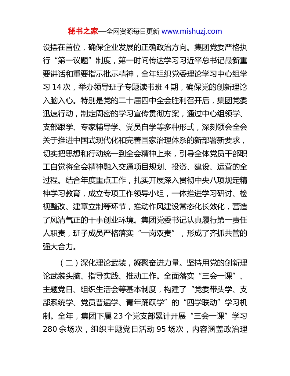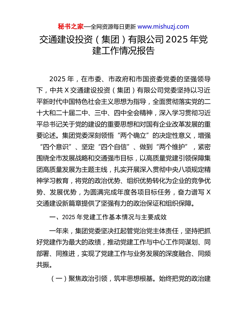 秘书之家—全网资源每日更新 www.mishuzj.com交通建设投资(集团)有限公司 2025 年党建工作情况报告2025 年,在市委、市政府和市国资委党委的坚强领导下,中共 X 交通建设投资(集团)有限公司党委坚持以习近平新时代中国特色社会主义思想为指导,全面贯彻落实党的二十大和二十届二中、三中、四中全会精神,深入学习贯彻习近平总书记关于党的建设的重要思想和对国有企业改革发展的重要论述。集团党委深刻领悟“两个确立”的决定性意义,增强“四个意识”、坚定“四个自信”、做到“两个维护”,紧密围绕全市发展战略和交通强市目标,以高质量党建引领保障集团高质量发展为主题主线,扎实开展深入贯彻中央八项规定精神学习教育,将党的政治优势、组织优势转化为企业的竞争优势、发展优势,为圆满完成年度各项目标任务,奋力谱写 X交通建设新篇章提供了坚强有力的政治保证和组织保障。一、2025 年党建工作基本情况与主要成效一年来,集团党委坚决扛起管党治党主体责任,坚持把抓好党建作为最大的政绩,推动党建工作与中心工作同谋划、同部署、同推进,实现了党建工作与业务发展的深度融合、同频共振。(一)聚焦政治引领,筑牢思想根基。始终把党的政治建秘书之家—全网资源每日更新 www.mishuzj.com设摆在首位,确保企业发展的正确政治方向。集团党委严格执行“第一议题”制度,第一时间传达学习习近平总书记最新重要讲话和重要指示批示精神,全年组织党委理论学习中心组学习 14 次,举办领导班子专题读书班 4 期,确保党的创新理论入脑入心。特别是党的二十届四中全会胜利召开后,集团党委迅速行动,制定周密的学习宣传贯彻方案,通过中心组领学、支部跟学、专家辅导学、党员自学等多种形式,深刻领会全会关于推进中国式现代化和完善国家治理体系的新部署新要求,切实把思想和行动统一到全会精神上来,引导全体党员干部职工自觉将全会精神融入交通项目规划、投资、建设、运营的全过程。结合年度重点工作,扎实开展深入贯彻中央八项规定精神学习教育,成立专项工作领导小组,一体推进学习研讨、检视整改、建章立制等环节,推动作风建设常态化长效化,营造了风清气正的干事创业环境。集团党委书记认真履行第一责任人职责,班子成员严格落实“一岗双责”,形成了齐抓共管的强大合力。(二)深化理论武装,凝聚奋进力量。坚持用党的创新理论武装头脑、指导实践、推动工作。全面落实“三会一课”、主题党日、组织生活会等基本制度,构建了“党委带头学、支部系统学、党员普遍学、青年踊跃学”的“四学联动”学习机制。全年,集团下属 23 个党支部累计开展“三会一课”学习280 余场次,组织主题党日活动 95 场次,内容涵盖政治理秘书之家—全网资源每日更新 www.mishuzj.com论、党纪法规、业务知识和红色文化教育等。充分利用 X 丰富的红色教育资源,组织党员干部赴 X 会议会址、X 纪念馆等红色教育基地开展现场教学,重温革命历史,传承红色基因,汲取奋进力量。建强用好青年理论学习小组,围绕“交通强国与青年担当”等主题开展学习研讨、实践调研活动 12 场次,有效提升了青年员工的政治素养和理论水平,为集团发展储备了可靠的后备力量。(三)夯实基层基础,建强战斗堡垒。树立大抓基层的鲜明导向,着力增强基层党组织的政治功能和组织功能。坚持“支部建在项目上、党旗飘在工地上”,在 X 环城高速、X 乌江特大桥等重点工程项目一线成立临时党支部 8 个,将党的工作覆盖到工程建设的最前沿,确保党的领导在基层一线坚强有力。圆满完成集团机关党委和 11 个基层党支部的换届选举工作,选优配强了支部班子。严格党员发展程序,把好政治关、廉洁关,全年共发展预备党员 18 名,转正党员 15 名,吸收确定入党积极分子 25 名,为党组织注入了新鲜血液。深入开展“建功‘十四五’,交通当先行”主题劳动竞赛和党员先锋岗、责任区创建活动,引导广大党员在项目攻坚、技术创新、安全生产等急难险重任务中冲锋在前、勇挑重担,有效发挥了战斗堡垒和先锋模范作用。选送的《党建引领,打造红色智慧工地》项目,在 2025 年 X 市“先锋杯”工作创新...