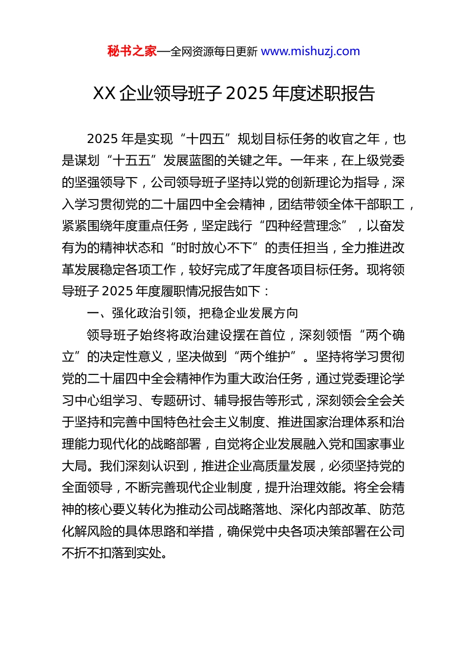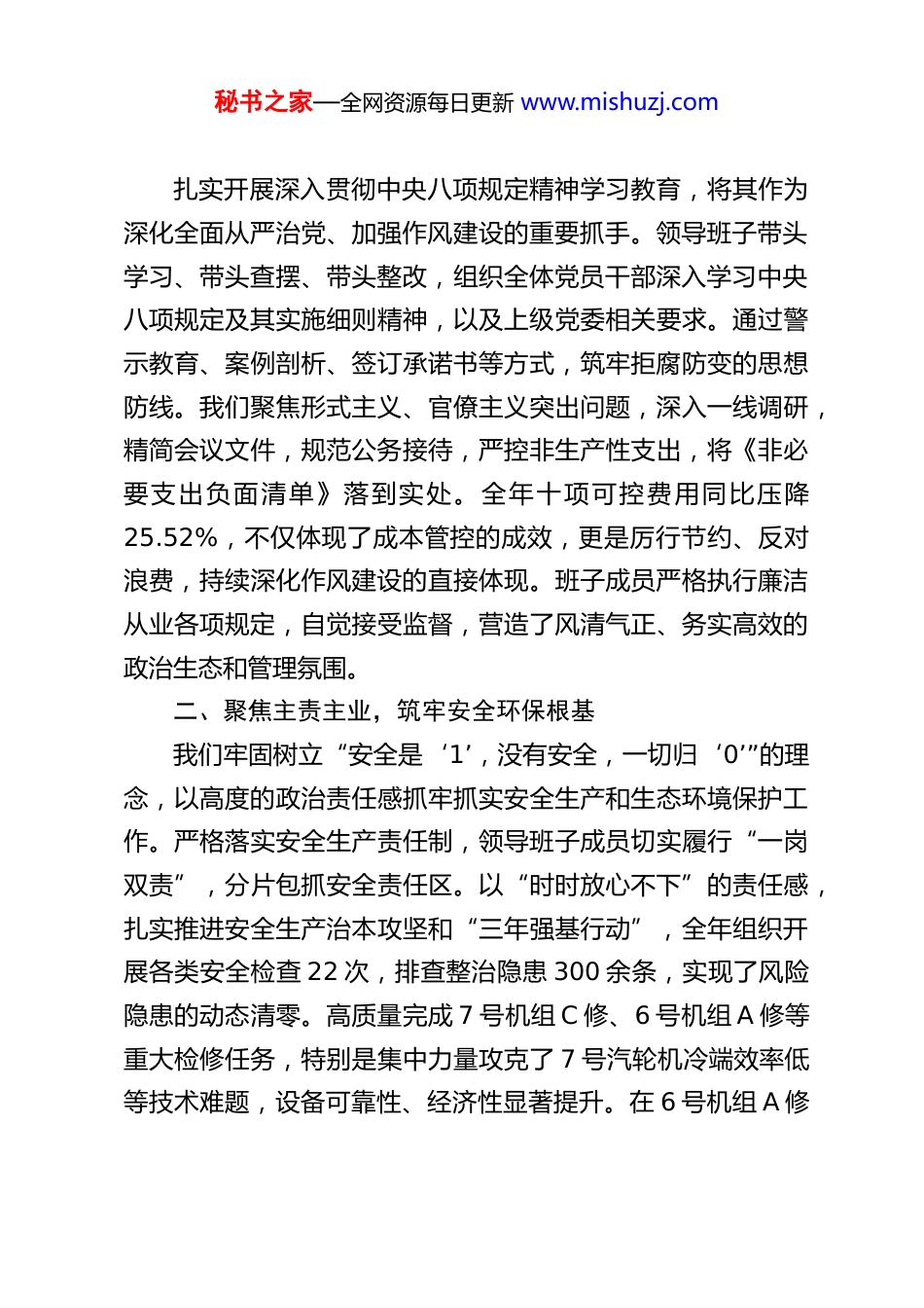 秘书之家—全网资源每日更新 www.mishuzj.comXX 企业领导班子 2025 年度述职报告2025 年是实现“十四五”规划目标任务的收官之年,也是谋划“十五五”发展蓝图的关键之年。一年来,在上级党委的坚强领导下,公司领导班子坚持以党的创新理论为指导,深入学习贯彻党的二十届四中全会精神,团结带领全体干部职工,紧紧围绕年度重点任务,坚定践行“四种经营理念”,以奋发有为的精神状态和“时时放心不下”的责任担当,全力推进改革发展稳定各项工作,较好完成了年度各项目标任务。现将领导班子 2025 年度履职情况报告如下:一、强化政治引领,把稳企业发展方向领导班子始终将政治建设摆在首位,深刻领悟“两个确立”的决定性意义,坚决做到“两个维护”。坚持将学习贯彻党的二十届四中全会精神作为重大政治任务,通过党委理论学习中心组学习、专题研讨、辅导报告等形式,深刻领会全会关于坚持和完善中国特色社会主义制度、推进国家治理体系和治理能力现代化的战略部署,自觉将企业发展融入党和国家事业大局。我们深刻认识到,推进企业高质量发展,必须坚持党的全面领导,不断完善现代企业制度,提升治理效能。将全会精神的核心要义转化为推动公司战略落地、深化内部改革、防范化解风险的具体思路和举措,确保党中央各项决策部署在公司不折不扣落到实处。秘书之家—全网资源每日更新 www.mishuzj.com扎实开展深入贯彻中央八项规定精神学习教育,将其作为深化全面从严治党、加强作风建设的重要抓手。领导班子带头学习、带头查摆、带头整改,组织全体党员干部深入学习中央八项规定及其实施细则精神,以及上级党委相关要求。通过警示教育、案例剖析、签订承诺书等方式,筑牢拒腐防变的思想防线。我们聚焦形式主义、官僚主义突出问题,深入一线调研,精简会议文件,规范公务接待,严控非生产性支出,将《非必要支出负面清单》落到实处。全年十项可控费用同比压降25.52%,不仅体现了成本管控的成效,更是厉行节约、反对浪费,持续深化作风建设的直接体现。班子成员严格执行廉洁从业各项规定,自觉接受监督,营造了风清气正、务实高效的政治生态和管理氛围。二、聚焦主责主业,筑牢安全环保根基我们牢固树立“安全是‘1’,没有安全,一切归‘0’”的理念,以高度的政治责任感抓牢抓实安全生产和生态环境保护工作。严格落实安全生产责任制,领导班子成员切实履行“一岗双责”,分片包抓安全责任区。以“时时放心不下”的责任感,扎实推进安全生产治本攻坚和“三年强基行动”,全年组织开展各类安全检查 22 次,排查整治隐患 300 余条,实现了风险隐患的动态清零。高质量完成 7 号机组 C 修、6 号机组 A 修等重大检修任务,特别是集中力量攻克了 7 号汽轮机冷端效率低等技术难题,设备可靠性、经济性显著提升。在 6 号机组 A 修秘书之家—全网资源每日更新 www.mishuzj.com中,充分发挥党组织战斗堡垒和党员先锋模范作用,设立党员责任区 16 个、突击队 11 个、示范岗 79 个,助推检修任务提前 7 天完成,彰显了党建引领保障中心工作的强大力量。坚决扛起生态环境保护政治责任,严守生态环保红线底线全面加强环保设施运行精细化管控,确保污染物稳定达标排放。积极践行绿色发展理念,将环保要求融入生产经营全过程。通过机组节能改造、运行优化等措施,供电煤耗持续下降,为区域环境质量改善作出了应有贡献。安全环保形势的持续稳定,为公司生产经营和改革发展创造了最基本、最核心的前提条件。三、深化经营管控,提升企业质量效益面对复杂严峻的电力市场环境和改革深化的挑战,领导班子主动识变应变求变,牢固树立市场意识和效益意识。带领公司主动融入电力现货交易体系,加强对市场供需和价格走势的研判,优化中长期合约与现货交易的策略组合,精准实施“抢发效益电”,全年电价水平高于全省平均,实现电费增收 1.39亿元,有效对冲了市场风险,提升了经营韧性。坚定不移践行“四种经营理念”,将成本管控作为提升竞争力的关键。穿透式执行“降本增效 30 条措施”,深入开展“一抢二降三控四提升”专项工作和“一分钱”成本攻坚行动。强化全面预算管理...