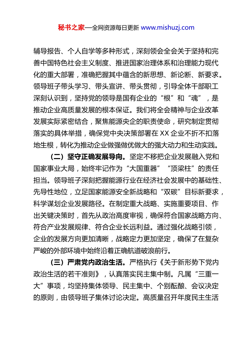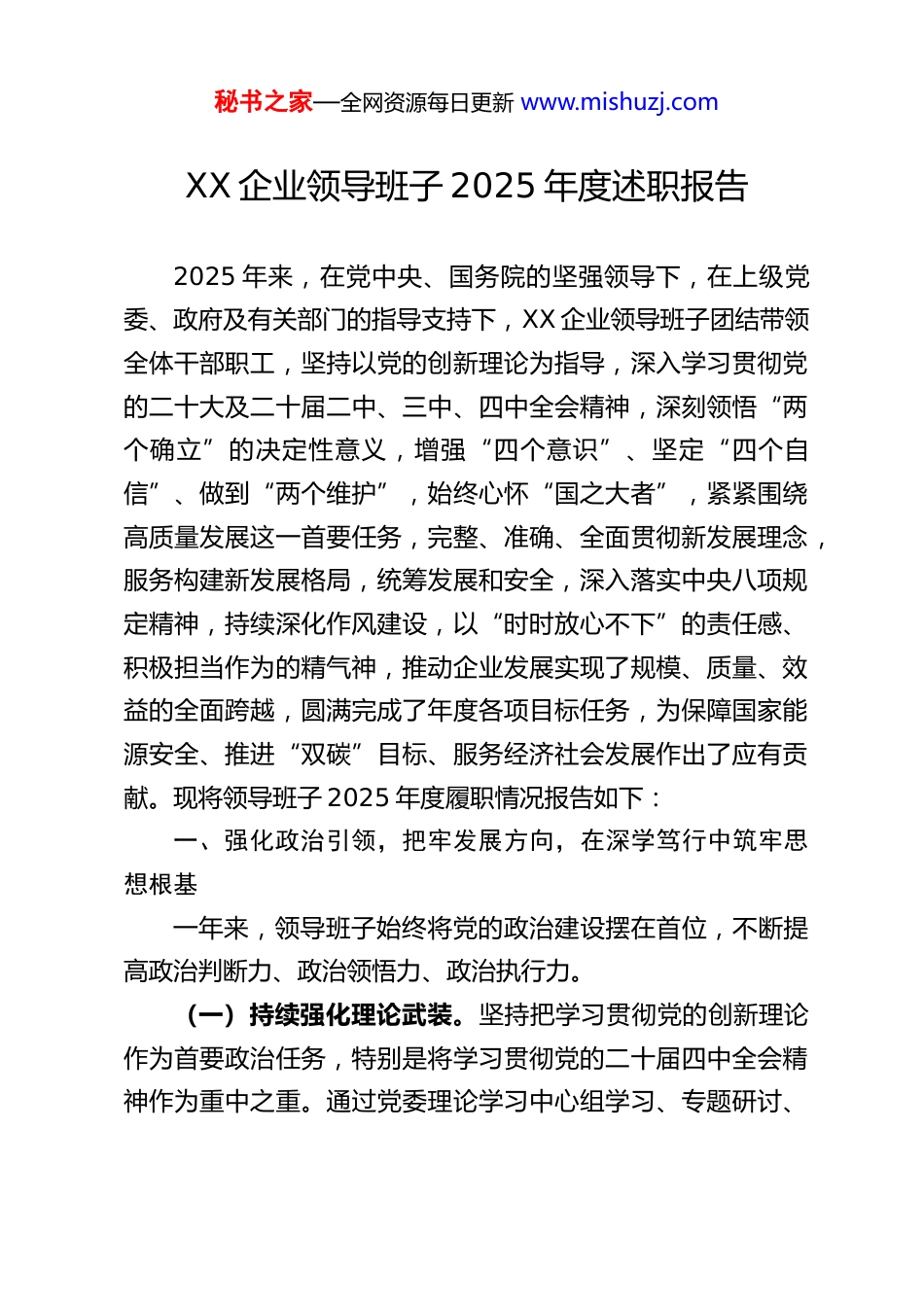 秘书之家—全网资源每日更新 www.mishuzj.comXX 企业领导班子 2025 年度述职报告2025 年来,在党中央、国务院的坚强领导下,在上级党委、政府及有关部门的指导支持下,XX 企业领导班子团结带领全体干部职工,坚持以党的创新理论为指导,深入学习贯彻党的二十大及二十届二中、三中、四中全会精神,深刻领悟“两个确立”的决定性意义,增强“四个意识”、坚定“四个自信”、做到“两个维护”,始终心怀“国之大者”,紧紧围绕高质量发展这一首要任务,完整、准确、全面贯彻新发展理念,服务构建新发展格局,统筹发展和安全,深入落实中央八项规定精神,持续深化作风建设,以“时时放心不下”的责任感、积极担当作为的精气神,推动企业发展实现了规模、质量、效益的全面跨越,圆满完成了年度各项目标任务,为保障国家能源安全、推进“双碳”目标、服务经济社会发展作出了应有贡献。现将领导班子 2025 年度履职情况报告如下:一、强化政治引领,把牢发展方向,在深学笃行中筑牢思想根基一年来,领导班子始终将党的政治建设摆在首位,不断提高政治判断力、政治领悟力、政治执行力。(一)持续强化理论武装。坚持把学习贯彻党的创新理论作为首要政治任务,特别是将学习贯彻党的二十届四中全会精神作为重中之重。通过党委理论学习中心组学习、专题研讨、秘书之家—全网资源每日更新 www.mishuzj.com辅导报告、个人自学等多种形式,深刻领会全会关于坚持和完善中国特色社会主义制度、推进国家治理体系和治理能力现代化的重大部署,准确把握其中蕴含的新思想、新论断、新要求。领导班子带头学习、带头宣讲、带头贯彻,引导全体干部职工深刻认识到,坚持党的领导是国有企业的“根”和“魂”,是推动企业高质量发展的根本保证。我们将全会精神与企业改革发展实际紧密结合,聚焦能源央企的职责使命,研究制定贯彻落实的具体举措,确保党中央决策部署在 XX 企业不折不扣落地生根,转化为推动企业做强做优做大的强大动力和生动实践。(二)坚守正确发展导向。坚定不移把企业发展融入党和国家事业大局,始终牢记作为“大国重器”“顶梁柱”的责任担当。领导班子深刻把握能源行业在经济社会发展中的基础性、先导性地位,立足国家能源安全新战略和“双碳”目标新要求,科学谋划企业发展路径。在制定重大战略、实施重要项目、作出关键决策时,首先从政治高度审视,确保符合国家战略方向、符合产业发展规律、符合企业长远利益。通过强化战略引领,企业的发展方向更加清晰,战略定力更加坚定,确保了在复杂严峻的外部环境中始终沿着正确航道破浪前行。(三)严肃党内政治生活。严格执行《关于新形势下党内政治生活的若干准则》,认真落实民主集中制。凡属“三重一大”事项,均坚持集体领导、民主集中、个别酝酿、会议决定的原则,由领导班子集体讨论决定。高质量召开年度民主生活秘书之家—全网资源每日更新 www.mishuzj.com会,严肃认真开展批评和自我批评,查摆问题深刻,整改措施务实,达到了统一思想、增进团结、互相监督、共同提高的目的。班子成员自觉以普通党员身份参加所在党支部的组织生活,带头讲党课、谈体会,营造了风清气正的良好政治生态。二、聚焦主责主业,推动高质量发展,在担当作为中创造卓越业绩领导班子坚持发展是第一要务,以“五个价值”(党建引领价值、战略协同价值、创新驱动价值、管理提升价值、风险防控价值)提升专项行动为抓手,全力推动企业发展实现质的有效提升和量的合理增长,取得了令人瞩目的成就。(一)综合实力迈上新台阶,规模品牌实现双跃升。我们始终将做强做优做大国有资本和国有企业作为核心目标。截至2025 年底,公司资产总额历史性突破 1.3 万亿元,发电总装机容量攀升至 2.8 亿千瓦,较“十三五”末大幅增长 68%,规模体量实现跨越式发展,为国家能源安全构筑了更为坚实的物质基础。尤为可喜的是,品牌影响力与综合实力同步提升。连续 13 年获评国资委年度经营业绩考核 A 级,连续 5 个任期获任期经营业绩考核 A 级,这既是对我们经营管理水平和持续盈利能力的高度认可,更是对我们深化改革、锐意进取的充分肯定。连续 3 年...