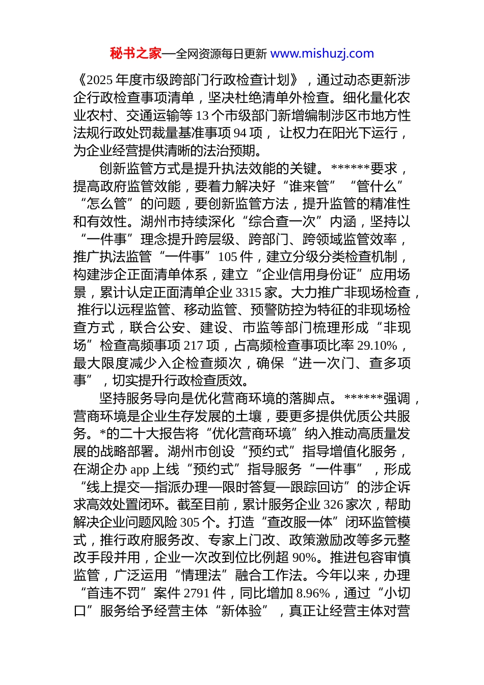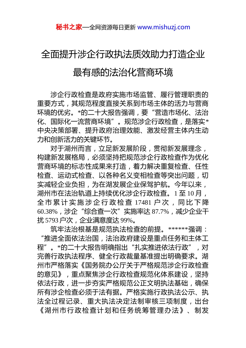 秘书之家—全网资源每日更新 www.mishuzj.com全面提升涉企行政执法质效助力打造企业最有感的法治化营商环境涉企行政检查是政府实施市场监管、履行管理职责的重要方式,其规范程度直接关系到市场主体的活力与营商环境的优劣。*的二十大报告强调,要“营造市场化、法治化、国际化一流营商环境”。规范涉企行政检查,是落实*中央决策部署、提升政府治理效能、激发经营主体内生动力和创新活力的关键环节。对于湖州而言,立足新发展阶段,贯彻新发展理念,构建新发展格局,必须坚持把规范涉企行政检查作为优化营商环境的标志性成果来打造,着力解决重复检查、任性检查、运动式检查、以各种名义变相检查等突出问题,切实减轻企业负担,为在湖发展企业保驾护航。今年以来,湖州市在法治轨道上持续优化涉企行政检查。1 至 10 月,全 市 累 计 实 施 涉 企 行 政 检 查 17481 户 次 , 同 比 下 降60.38%,涉企“综合查一次”实施率达 87.7%,减少企业干扰 5793 户次,企业满意度达 99%。筑牢法治根基是规范执法检查的前提。******强调:“推进全面依法治国,法治政府建设是重点任务和主体工程”。*的二十大报告明确指出“扎实推进依法行政”,对完善行政执法程序、健全行政裁量基准提出明确要求。湖州市严格落实《国务院办公厅关于严格规范涉企行政检查的意见》,重点聚焦涉企行政检查规范化体系建设,坚持依法行政,进一步夯实严格规范公正文明执法基础,确保所有涉企检查必须于法有据。严格实施行政执法公示、执法全过程记录、重大执法决定法制审核三项制度,出台《湖州市行政检查计划和任务统筹管理办法》、制发秘书之家—全网资源每日更新 www.mishuzj.com《2025 年度市级跨部门行政检查计划》,通过动态更新涉企行政检查事项清单,坚决杜绝清单外检查。细化量化农业农村、交通运输等 13 个市级部门新增编制涉区市地方性法规行政处罚裁量基准事项 94 项, 让权力在阳光下运行,为企业经营提供清晰的法治预期。创新监管方式是提升执法效能的关键。******要求,提高政府监管效能,要着力解决好“谁来管”“管什么”“怎么管”的问题,要创新监管方法,提升监管的精准性和有效性。湖州市持续深化“综合查一次”内涵,坚持以“一件事”理念提升跨层级、跨部门、跨领域监管效率,推广执法监管“一件事”105 件,建立分级分类检查机制,构建涉企正面清单体系,建立“企业信用身份证”应用场景,累计认定正面清单企业 3315 家。大力推广非现场检查, 推行以远程监管、移动监管、预警防控为特征的非现场检查方式,联合公安、建设、市监等部门梳理形成“非现场”检查高频事项 217 项,占高频检查事项比率 29.10%,最大限度减少入企检查频次,确保“进一次门、查多项事”,切实提升行政检查质效。坚持服务导向是优化营商环境的落脚点。******强调,营商环境是企业生存发展的土壤,要更多提供优质公共服务。*的二十大报告将“优化营商环境”纳入推动高质量发展的战略部署。湖州市创设“预约式”指导增值化服务,在湖企办 app 上线“预约式”指导服务“一件事”,形成“线上提交—指派办理—限时答复—跟踪回访”的涉企诉求高效处置闭环。截至目前,累计服务企业 326 家次,帮助解决企业问题风险 305 个。打造“查改服一体”闭环监管模式,推行政府服务改、专家上门改、政策激励改等多元整改手段并用,企业一次改到位比例超 90%。推进包容审慎监管,广泛运用“情理法”融合工作法。今年以来,办理“首违不罚”案件 2791 件,同比增加 8.96%,通过“小切口”服务给予经营主体“新体验”,真正让经营主体对营秘书之家—全网资源每日更新 www.mishuzj.com商环境的改善看得见、摸得着、有感受。规范涉企行政检查是一项需要持续用力、久久为功的系统工程。湖州将深入学习贯彻******关于优化营商环境的重要论述,全面落实*的二十大关于法治政府建设的部署要求,坚持制度规范与技术赋能双轮驱动,严格监督与优化服务同步发力,不断深化执法体制改革,致力于打造行政执法最规范、法治环境最优质的标杆城市,让规范涉企行政检查工作成为湖州营商环境的标志性成果,为经济社会高质量发展提供坚实的法治保障。