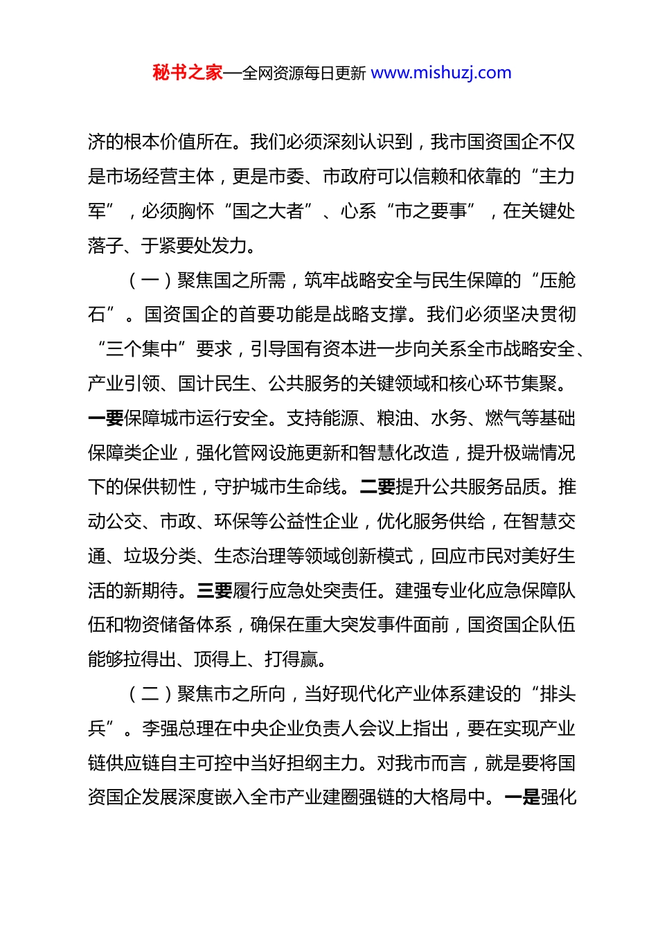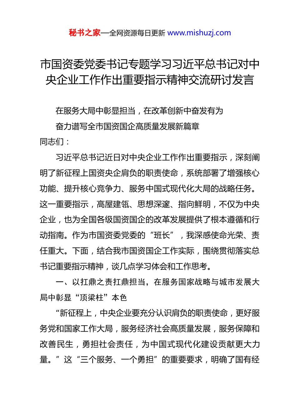 秘书之家—全网资源每日更新 www.mishuzj.com市国资委党委书记专题学习习近平总书记对中央企业工作作出重要指示精神交流研讨发言 在服务大局中彰显担当,在改革创新中奋发有为奋力谱写全市国资国企高质量发展新篇章同志们:习近平总书记近日对中央企业工作作出重要指示,深刻阐明了新征程上国资央企肩负的职责使命,系统部署了增强核心功能、提升核心竞争力、服务中国式现代化大局的战略任务。这一重要指示,高屋建瓴、思想深邃、指向鲜明,不仅为中央企业,也为全国各级国资国企的改革发展提供了根本遵循和行动指南。作为市国资委党委的“班长”,我深感使命光荣、责任重大。下面,结合我市国资国企工作实际,围绕贯彻落实总书记重要指示精神,谈几点学习体会和工作思考。一、以扛鼎之责扛鼎担当,在服务国家战略与城市发展大局中彰显“顶梁柱”本色“新征程上,中央企业要充分认识肩负的职责使命,更好服务党和国家工作大局,服务经济社会高质量发展,服务保障和改善民生,勇担社会责任,为中国式现代化建设贡献更大力量。”这“三个服务、一个勇担”的重要要求,明确了国有经秘书之家—全网资源每日更新 www.mishuzj.com济的根本价值所在。我们必须深刻认识到,我市国资国企不仅是市场经营主体,更是市委、市政府可以信赖和依靠的“主力军”,必须胸怀“国之大者”、心系“市之要事”,在关键处落子、于紧要处发力。(一)聚焦国之所需,筑牢战略安全与民生保障的“压舱石”。国资国企的首要功能是战略支撑。我们必须坚决贯彻“三个集中”要求,引导国有资本进一步向关系全市战略安全、产业引领、国计民生、公共服务的关键领域和核心环节集聚。一要保障城市运行安全。支持能源、粮油、水务、燃气等基础保障类企业,强化管网设施更新和智慧化改造,提升极端情况下的保供韧性,守护城市生命线。二要提升公共服务品质。推动公交、市政、环保等公益性企业,优化服务供给,在智慧交通、垃圾分类、生态治理等领域创新模式,回应市民对美好生活的新期待。三要履行应急处突责任。建强专业化应急保障队伍和物资储备体系,确保在重大突发事件面前,国资国企队伍能够拉得出、顶得上、打得赢。(二)聚焦市之所向,当好现代化产业体系建设的“排头兵”。李强总理在中央企业负责人会议上指出,要在实现产业链供应链自主可控中当好担纲主力。对我市而言,就是要将国资国企发展深度嵌入全市产业建圈强链的大格局中。一是强化秘书之家—全网资源每日更新 www.mishuzj.com产业引领功能。紧密对接全市产业规划,支持优势国企通过投资、并购、协同等方式,在前沿新材料、高端装备、生物医药等战略性新兴产业中抢占先机、形成集群。二是发挥“链长”牵引作用。支持具有产业整合能力的企业担当“链长”,牵头搭建产业联盟和共性技术平台,带动上下游中小企业融通发展,提升重点产业链的自主可控水平和整体竞争力。三是优化国有资本投资运营。发挥好国有资本投资、运营公司的平台功能,运用好各类产业发展基金,撬动更多社会资本投向实体经济,壮大长期资本、耐心资本,为产业升级注入源头活水。(三)聚焦民之所盼,争做履行社会责任与绿色发展的“先锋队”。服务保障和改善民生,是国有企业属性的内在要求。一要勇担稳增长促就业责任。在复杂经济形势下,国有企业要努力提质增效、稳定投资、扩大招聘,为稳住全市经济大盘、保障社会就业发挥积极作用。二要勇担乡村振兴与区域协调责任。推动市属企业资源向乡村建设、城乡融合领域倾斜,在基础设施互联互通、特色产业帮扶等方面贡献力量。三要勇担绿色低碳转型责任。带头落实“双碳”战略,严格执行重点行业碳达峰实施方案,加大节能降碳技术改造投入,大力发展循环经济,投资布局清洁能源项目,引领全市产业向绿色化、低碳化转型。秘书之家—全网资源每日更新 www.mishuzj.com二、以融新之策融新图强,在深化改革与创新驱动中锻造核心竞争力习近平总书记强调,要“聚焦主责主业,持续优化国有经济布局,切实增强核心功能、提升核心竞争力”,并指出要“立足实体经济,强化关键核心技术攻关,推动科技创新和产业创新深度融合”。这要求我们必须将...