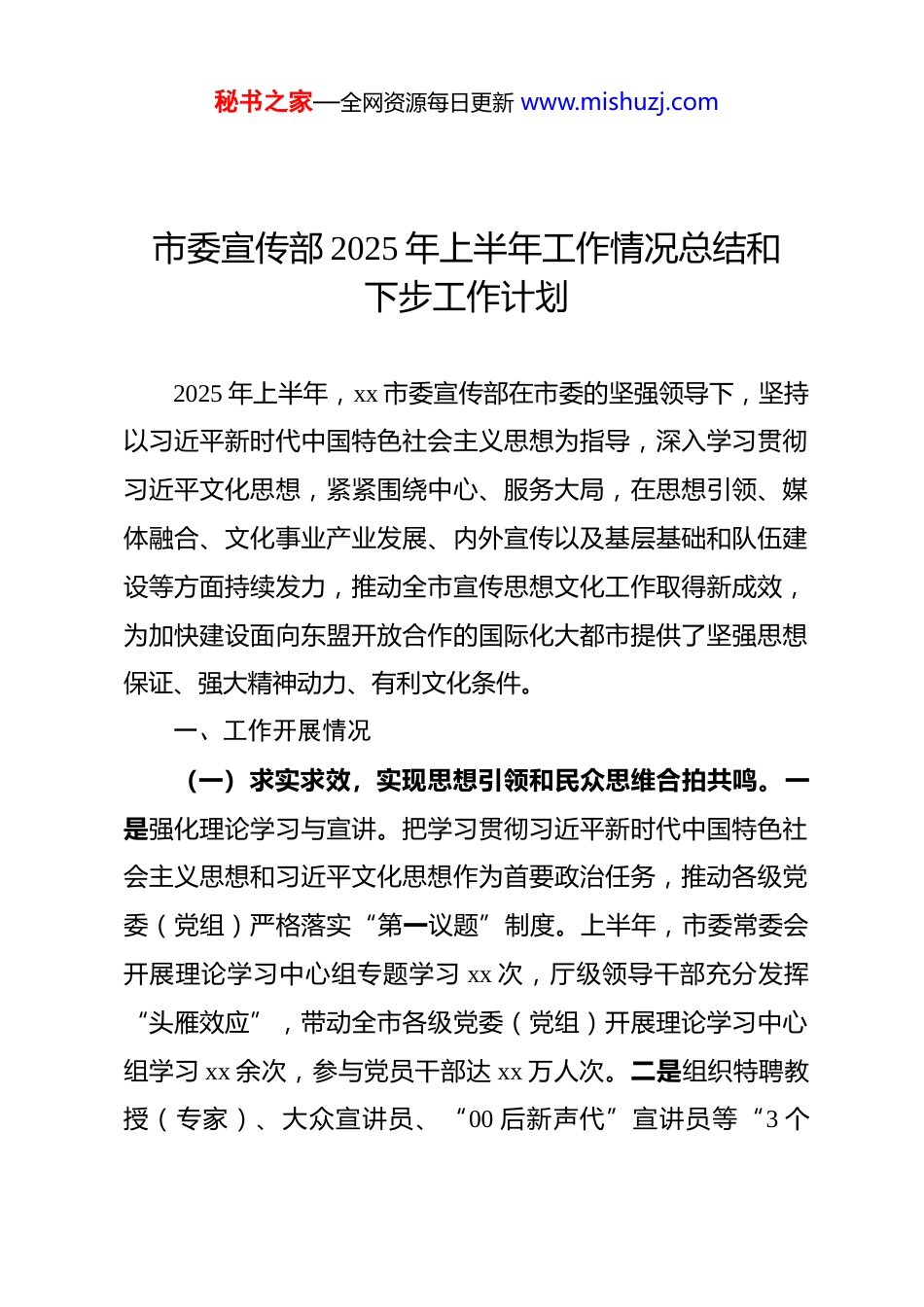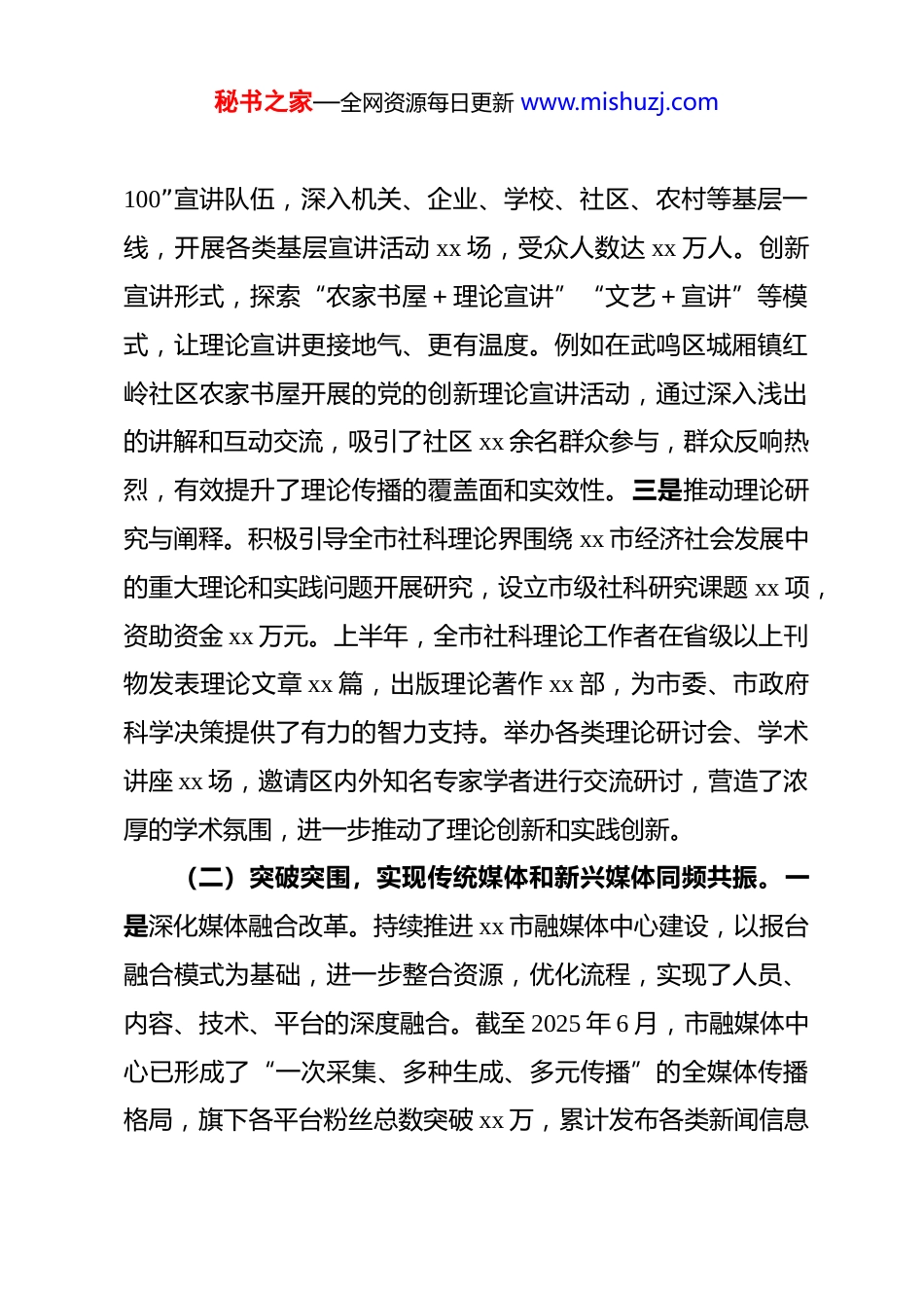 秘书之家—全网资源每日更新 www.mishuzj.com市委宣传部 2025 年上半年工作情况总结和下步工作计划2025 年上半年,xx 市委宣传部在市委的坚强领导下,坚持以习近平新时代中国特色社会主义思想为指导,深入学习贯彻习近平文化思想,紧紧围绕中心、服务大局,在思想引领、媒体融合、文化事业产业发展、内外宣传以及基层基础和队伍建设等方面持续发力,推动全市宣传思想文化工作取得新成效,为加快建设面向东盟开放合作的国际化大都市提供了坚强思想保证、强大精神动力、有利文化条件。一、工作开展情况(一)求实求效,实现思想引领和民众思维合拍共鸣。一是强化理论学习与宣讲。把学习贯彻习近平新时代中国特色社会主义思想和习近平文化思想作为首要政治任务,推动各级党委(党组)严格落实“第一议题”制度。上半年,市委常委会开展理论学习中心组专题学习 xx 次,厅级领导干部充分发挥“头雁效应”,带动全市各级党委(党组)开展理论学习中心组学习 xx 余次,参与党员干部达 xx 万人次。二是组织特聘教授(专家)、大众宣讲员、“00 后新声代”宣讲员等“3 个秘书之家—全网资源每日更新 www.mishuzj.com100”宣讲队伍,深入机关、企业、学校、社区、农村等基层一线,开展各类基层宣讲活动 xx 场,受众人数达 xx 万人。创新宣讲形式,探索“农家书屋+理论宣讲”“文艺+宣讲”等模式,让理论宣讲更接地气、更有温度。例如在武鸣区城厢镇红岭社区农家书屋开展的党的创新理论宣讲活动,通过深入浅出的讲解和互动交流,吸引了社区 xx 余名群众参与,群众反响热烈,有效提升了理论传播的覆盖面和实效性。三是推动理论研究与阐释。积极引导全市社科理论界围绕 xx 市经济社会发展中的重大理论和实践问题开展研究,设立市级社科研究课题 xx 项,资助资金 xx 万元。上半年,全市社科理论工作者在省级以上刊物发表理论文章 xx 篇,出版理论著作 xx 部,为市委、市政府科学决策提供了有力的智力支持。举办各类理论研讨会、学术讲座 xx 场,邀请区内外知名专家学者进行交流研讨,营造了浓厚的学术氛围,进一步推动了理论创新和实践创新。(二)突破突围,实现传统媒体和新兴媒体同频共振。一是深化媒体融合改革。持续推进 xx 市融媒体中心建设,以报台融合模式为基础,进一步整合资源,优化流程,实现了人员、内容、技术、平台的深度融合。截至 2025 年 6 月,市融媒体中心已形成了“一次采集、多种生成、多元传播”的全媒体传播格局,旗下各平台粉丝总数突破 xx 万,累计发布各类新闻信息秘书之家—全网资源每日更新 www.mishuzj.comxx 万条,总阅读量(播放量)达 xx 亿次。其中,“千万+”“百万+”作品不断涌现,如关于 xx 市重大项目建设的系列报道,单条视频播放量最高突破 xx 万,在社会上引起了强烈反响,有效提升了首府新闻媒体的传播力、引导力、影响力、公信力。二是加强新媒体平台建设与运营。积极打造新媒体矩阵,鼓励各媒体单位充分利用微信、微博、抖音、快手等新媒体平台,开设具有特色的新媒体账号。上半年,全市新增粉丝量超过 xx万的新媒体账号 xx 个,推出了一批形式新颖、内容丰富的新媒体作品。例如,xx 广播电视台的抖音账号“xx 视界”,通过发布短视频、直播等形式,对 xx 市的文化旅游、民生实事、城市建设等进行全方位宣传,粉丝量已突破 xx 万,成为展示 xx 形象的重要窗口。同时,加强对新媒体平台的管理和引导,建立健全相关制度,确保新媒体传播的正确方向。(三)相生相长,实现文化事业和文化产业整体繁荣。一是丰富文化活动供给。精心举办了一系列丰富多彩的文化活动,不断满足人民群众日益增长的精神文化需求。2025 年“xx 三月三·八桂嘉年华”xx 市文化旅游品牌活动吸引了全市 xx 个县区、开发区参与,开展各类文化活动 xx 场,参与群众达 xx 万人次。组织开展“我们的中国梦——文化进万家”、绿城歌台等群众文化活动 xx 场,完成公益电影放映 xx 场,覆盖全市 xx 个乡镇秘书之家—全网资源每日更新 www.mishuzj.com(街道)、xx 个村(社区)。举办全民阅读活动 x...