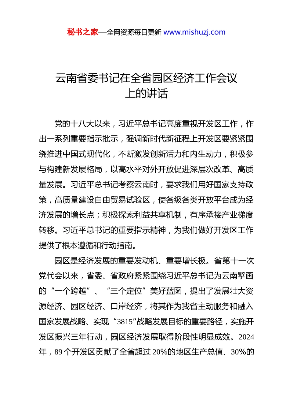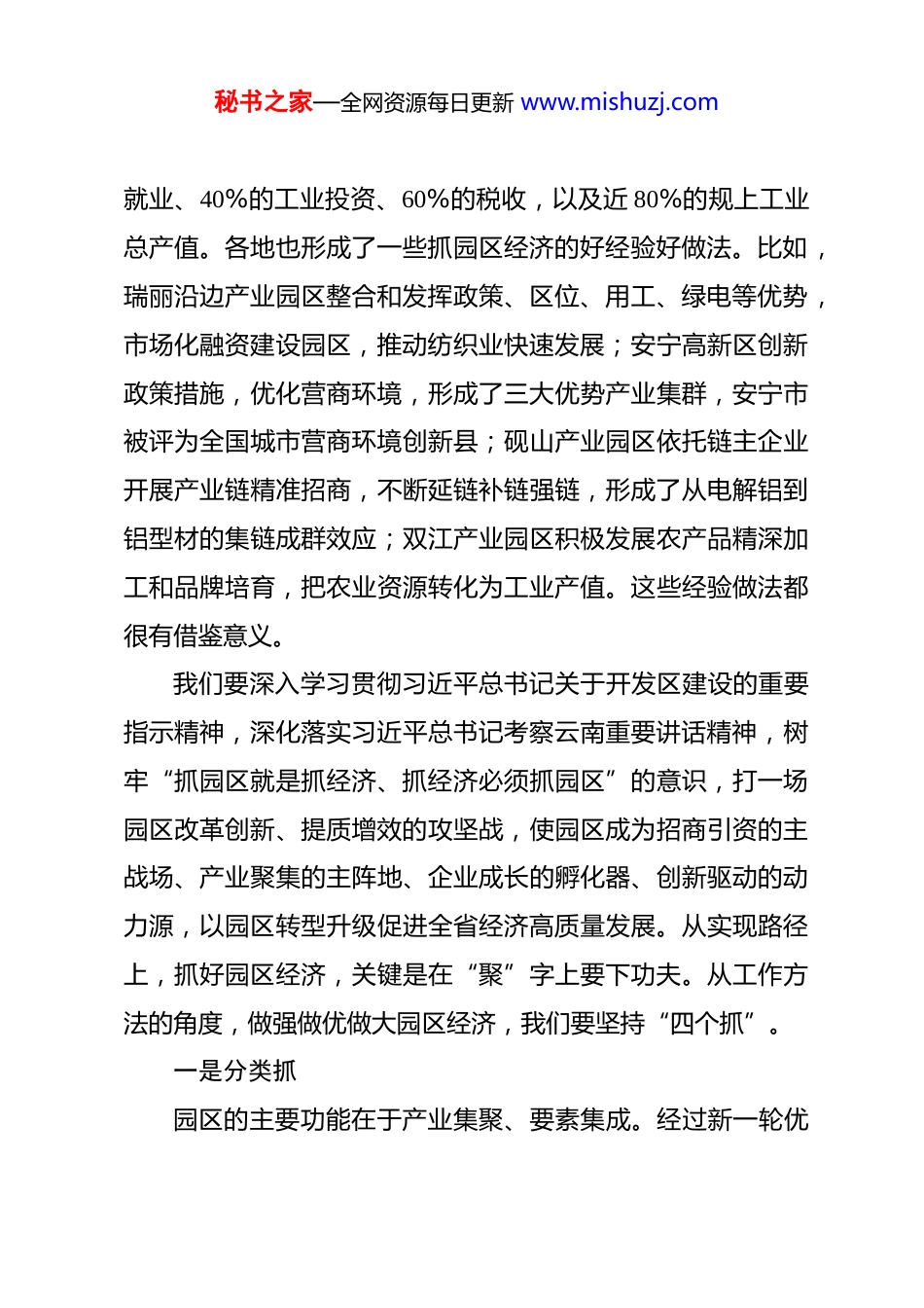 秘书之家—全网资源每日更新 www.mishuzj.com云南省委书记在全省园区经济工作会议上的讲话党的十八大以来,习近平总书记高度重视开发区工作,作出一系列重要指示批示,强调新时代新征程上开发区要紧紧围绕推进中国式现代化,不断激发创新活力和内生动力,积极参与构建新发展格局,以高水平对外开放促进深层次改革、高质量发展。习近平总书记考察云南时,要求我们用好国家支持政策,高质量建设自由贸易试验区,使各级各类开放平台成为经济发展的增长点;积极探索利益共享机制,有序承接产业梯度转移。习近平总书记的重要指示精神,为我们做好开发区工作提供了根本遵循和行动指南。园区是经济发展的重要发动机、重要增长极。省第十一次党代会以来,省委、省政府紧紧围绕习近平总书记为云南擘画的“一个跨越”、“三个定位”美好蓝图,提出了发展壮大资源经济、园区经济、口岸经济,将其作为我省主动服务和融入国家发展战略、实现“3815”战略发展目标的重要路径,实施开发区振兴三年行动,园区经济发展取得阶段性明显成效。2024年,89 个开发区贡献了全省超过 20%的地区生产总值、30%的秘书之家—全网资源每日更新 www.mishuzj.com就业、40%的工业投资、60%的税收,以及近 80%的规上工业总产值。各地也形成了一些抓园区经济的好经验好做法。比如,瑞丽沿边产业园区整合和发挥政策、区位、用工、绿电等优势,市场化融资建设园区,推动纺织业快速发展;安宁高新区创新政策措施,优化营商环境,形成了三大优势产业集群,安宁市被评为全国城市营商环境创新县;砚山产业园区依托链主企业开展产业链精准招商,不断延链补链强链,形成了从电解铝到铝型材的集链成群效应;双江产业园区积极发展农产品精深加工和品牌培育,把农业资源转化为工业产值。这些经验做法都很有借鉴意义。我们要深入学习贯彻习近平总书记关于开发区建设的重要指示精神,深化落实习近平总书记考察云南重要讲话精神,树牢“抓园区就是抓经济、抓经济必须抓园区”的意识,打一场园区改革创新、提质增效的攻坚战,使园区成为招商引资的主战场、产业聚集的主阵地、企业成长的孵化器、创新驱动的动力源,以园区转型升级促进全省经济高质量发展。从实现路径上,抓好园区经济,关键是在“聚”字上要下功夫。从工作方法的角度,做强做优做大园区经济,我们要坚持“四个抓”。一是分类抓园区的主要功能在于产业集聚、要素集成。经过新一轮优秘书之家—全网资源每日更新 www.mishuzj.com化整合,全省园区数量从 89 个调整为 122 个。这些园区产业基础、资源禀赋不尽相同,不能“一刀切”、齐步走。一方面,要明确主责,“谁的孩子谁养大”,省级抓示范,州(市)抓重点,县(市、区)履行好主体责任;省发展改革委抓全盘,省工业和信息化厅、省科技厅、省商务厅等部门要扛实行业主管责任。另一方面,要明确发展定位,聚焦主业选准赛道、深耕细作,原则上每个园区主攻 1 个产业,最多不超过 3 个,不能盲目跟风换赛道、不切实际铺摊子,更不能不计成本、不讲效益,要算好投入产出效益账。各地区各部门要围绕绿色铝、硅光伏、新能源电池、稀贵金属、有色金属等重点产业,整体谋划和打造产业配套链、要素供应链、产品价值链、技术创新链,推动产业向园区集聚、要素向园区集中。要大力推广全产业链招商、第三方招商、龙头企业招商等方式,到东中部省份去、到境外去,靶向招引龙头企业、关联企业和配套企业,把好的产业、好的企业、好的项目引进来,引导产业链上下游企业向同一园区集聚,努力构建“一个产业园就是一条产业链,上下楼就是上下游”的良好产业发展生态。要大力发展“绿电+先进制造业”,加快零碳园区、低碳园区建设,充分体现我省绿电优势和低碳价值。二是创新抓秘书之家—全网资源每日更新 www.mishuzj.com园区的竞争力在于改革创新。全省各个园区谁的体制机制政策措施与时俱进改革创新,谁就更有效率、更有吸引力,企业、项目就落得多。这几年,昆明市采取“自贸试验区+经济开发区+综合保税区+跨境合作区”的“四区联动”推动磨憨园区快速发展,保山市探索共建“园中园”形成聚集效应,这些创新做法...
