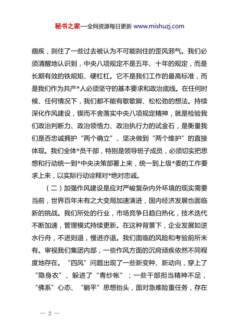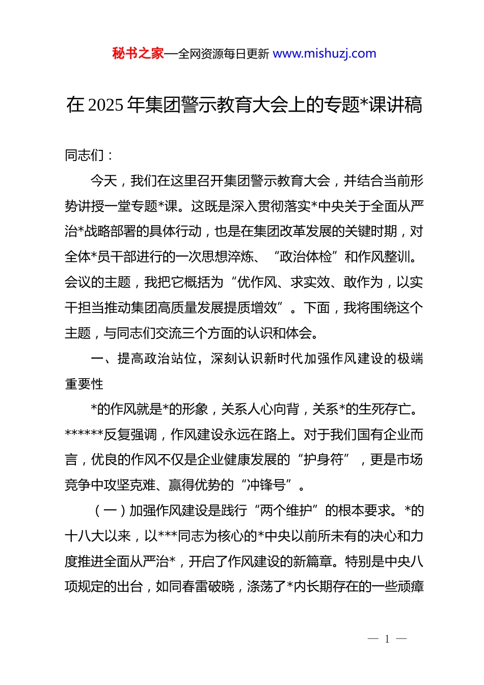 秘书之家—全网资源每日更新 www.mishuzj.com在 2025 年集团警示教育大会上的专题*课讲稿同志们:今天,我们在这里召开集团警示教育大会,并结合当前形势讲授一堂专题*课。这既是深入贯彻落实*中央关于全面从严治*战略部署的具体行动,也是在集团改革发展的关键时期,对全体*员干部进行的一次思想淬炼、“政治体检”和作风整训。会议的主题,我把它概括为“优作风、求实效、敢作为,以实干担当推动集团高质量发展提质增效”。下面,我将围绕这个主题,与同志们交流三个方面的认识和体会。一、提高政治站位,深刻认识新时代加强作风建设的极端重要性*的作风就是*的形象,关系人心向背,关系*的生死存亡。******反复强调,作风建设永远在路上。对于我们国有企业而言,优良的作风不仅是企业健康发展的“护身符”,更是市场竞争中攻坚克难、赢得优势的“冲锋号”。(一)加强作风建设是践行“两个维护”的根本要求。*的十八大以来,以***同志为核心的*中央以前所未有的决心和力度推进全面从严治*,开启了作风建设的新篇章。特别是中央八项规定的出台,如同春雷破晓,涤荡了*内长期存在的一些顽瘴— 1 —秘书之家—全网资源每日更新 www.mishuzj.com痼疾,刹住了一些过去被认为不可能刹住的歪风邪气。我们必须清醒地认识到,中央八项规定不是五年、十年的规定,而是长期有效的铁规矩、硬杠杠。它不是我们工作的最高标准,而是我们作为共产*人必须坚守的基本要求和政治底线。在任何时候、任何情况下,我们都不能有歇歇脚、松松劲的想法。持续深化作风建设,锲而不舍落实中央八项规定精神,就是检验我们政治判断力、政治领悟力、政治执行力的试金石,是衡量我们是否忠诚拥护“两个确立”、坚决做到“两个维护”的直接体现。我们全体*员干部,特别是领导班子成员,必须切实把思想和行动统一到*中央决策部署上来,统一到上级*委的工作要求上来,以实际行动诠释对*绝对忠诚。(二)加强作风建设是应对严峻复杂内外环境的现实需要当前,世界百年未有之大变局加速演进,国内经济发展也面临新的挑战。我们所处的行业,市场竞争日趋白热化,技术迭代不断加速,管理模式持续更新。在这种背景下,企业发展如逆水行舟,不进则退,慢进亦退。我们面临的风险和考验前所未有。审视我们集团内部,一些作风方面的沉疴顽疾依然不同程度地存在。“四风”问题出现了一些新变种、新动向,穿上了“隐身衣”、躲进了“青纱帐”;一些干部担当精神不足,“佛系”心态、“躺平”思想抬头,面对急难险重任务,存在— 2 —秘书之家—全网资源每日更新 www.mishuzj.com“等、靠、要”的现象;部分管理人员服务意识不强,官僚主义习气犹存,对基层和一线反映的问题推诿扯皮、敷衍了事。这些问题如果不能得到及时有效地解决,必将侵蚀我们干事创业的激情,削弱我们队伍的战斗力,最终拖累集团高质量发展的步伐。因此,我们必须把作风建设摆在更加突出的位置,以硬朗的作风、严明的纪律,为集团轻装上阵、行稳致远保驾护航。(三)加强作风建设是实现集团“十四五”战略目标的坚强保障。我们集团正处在转型升级、爬坡过坎的关键阶段。要实现既定的战略目标,任务极其艰巨繁重。越是任务艰巨,越需要我们有攻坚克难的锐气;越是挑战严峻,越需要我们有敢打必胜的豪气。良好的作风,能产生强大的凝聚力和向心力,能激发广大职工的积极性和创造性,形成推动发展的强大合力。反之,如果作风漂浮、纪律松弛,再好的蓝图也只是镜花水月。我们必须通过常态化、长效化的作风建设,锻造一支政治过硬、本领高强、作风优良、纪律严明的干部队伍,确保集团的各项决策部署不折不扣地落到实处,将我们的战略蓝图一步步变为美好现实。二、坚持问题导向,以壮士断腕的决心抓好专项治理与突出问题整改— 3 —秘书之家—全网资源每日更新 www.mishuzj.com作风问题具有顽固性和反复性,抓一抓就好转,松一松就反弹。我们决不能满足于已取得的阶段性成效,必须坚持问题导向,拿出踏石留印、抓铁有痕的劲头,聚焦突出问题,深化专项治理,以重点突破带动整体提升。今年,集团*委部署了四大专项治理行动,即“老大难”结算收款、审...