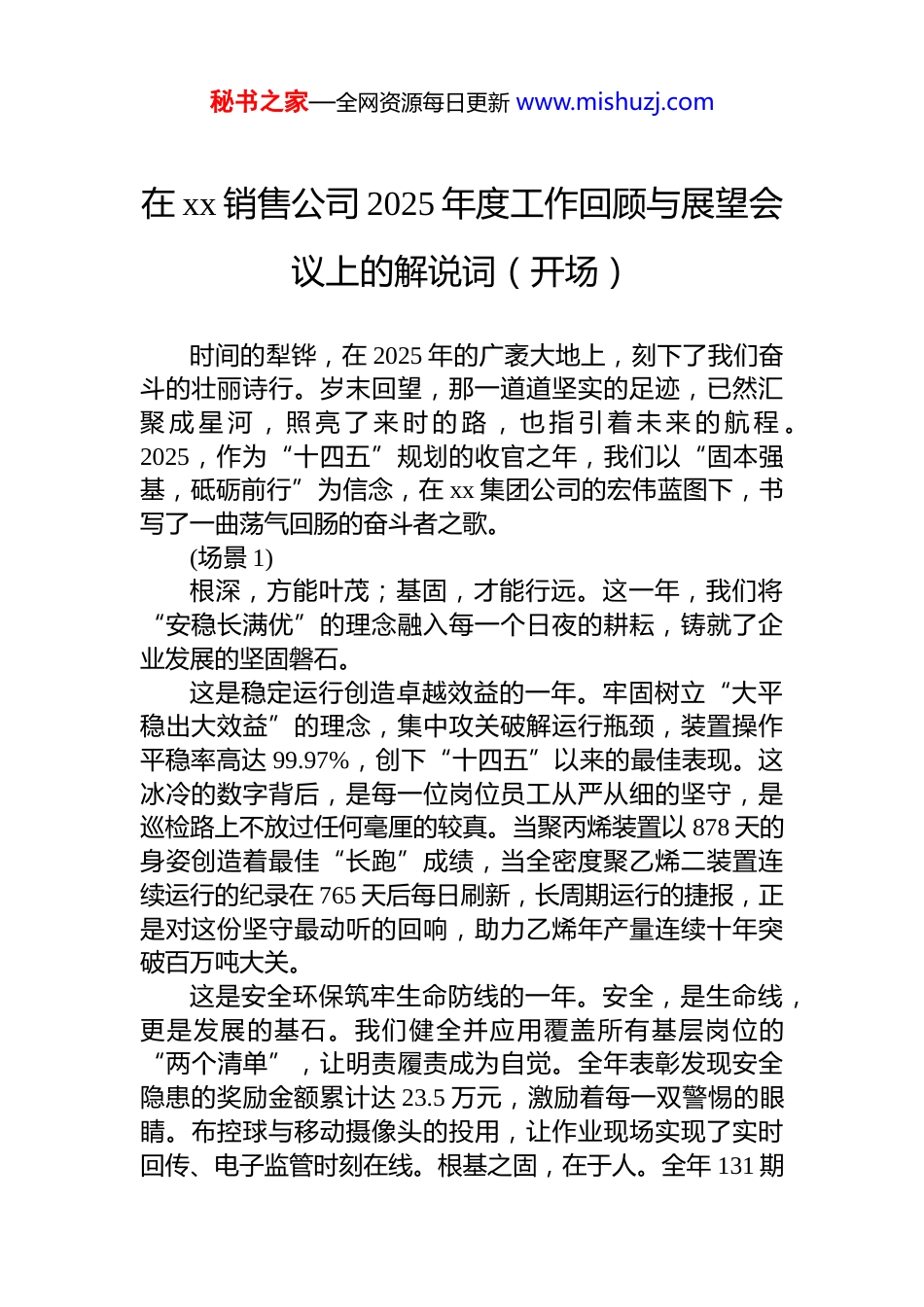 秘书之家—全网资源每日更新 www.mishuzj.com在 xx 销售公司 2025 年度工作回顾与展望会议上的解说词(开场)时间的犁铧,在 2025 年的广袤大地上,刻下了我们奋斗的壮丽诗行。岁末回望,那一道道坚实的足迹,已然汇聚 成 星 河 , 照 亮 了 来 时 的 路 , 也 指 引 着 未 来 的 航 程 。2025,作为“十四五”规划的收官之年,我们以“固本强基,砥砺前行”为信念,在 xx 集团公司的宏伟蓝图下,书写了一曲荡气回肠的奋斗者之歌。(场景 1)根深,方能叶茂;基固,才能行远。这一年,我们将“安稳长满优”的理念融入每一个日夜的耕耘,铸就了企业发展的坚固磐石。这是稳定运行创造卓越效益的一年。牢固树立“大平稳出大效益”的理念,集中攻关破解运行瓶颈,装置操作平稳率高达 99.97%,创下“十四五”以来的最佳表现。这冰冷的数字背后,是每一位岗位员工从严从细的坚守,是巡检路上不放过任何毫厘的较真。当聚丙烯装置以 878 天的身姿创造着最佳“长跑”成绩,当全密度聚乙烯二装置连续运行的纪录在 765 天后每日刷新,长周期运行的捷报,正是对这份坚守最动听的回响,助力乙烯年产量连续十年突破百万吨大关。这是安全环保筑牢生命防线的一年。安全,是生命线,更是发展的基石。我们健全并应用覆盖所有基层岗位的“两个清单”,让明责履责成为自觉。全年表彰发现安全隐患的奖励金额累计达 23.5 万元,激励着每一双警惕的眼睛。布控球与移动摄像头的投用,让作业现场实现了实时回传、电子监管时刻在线。根基之固,在于人。全年 131 期秘书之家—全网资源每日更新 www.mishuzj.com合规性培训班,11.2 万人次参与的线上安全知识竞答,累计传播 159 万个知识点。这不仅是知识的传递,更是将“安全必保、环保达标”的理念,深植于每一位奋斗者的血脉之中。(场景 2)如果说稳固的根基给予我们前行的底气,那么拥抱变革、激活源动力,便赋予我们穿云破雾的无尽能量。这是提质增效驱动内涵增长的一年。坚信潜力仍是“一座金山”,我们巧拨效益算盘,以顶层设计为抓手,滚动推进 300 项重点提质增效措施。截至前 11 个月,累计增效 3.63 亿元。我们舞活营销龙头,向着市场最前沿破浪前行。产销联动,敏捷应变,实现柴油出厂量同比增加10.97 万吨;在凛冽寒冬,为高寒地区稳定供应-35 号柴油32 万吨,保障能源大动脉的畅通。这是品牌价值与市场开拓共振的一年。明星产品 mtbe累计出口量同比增加 4.45 万吨,石蜡、合成氨等五项主要产品产量刷新历史答卷。成品油出厂合格率 100%的承诺,是我们对客户最郑重的誓言。橡胶产品优级率由 93%到97%的跨越,是品质的宣言。在 xx 市场上,我们的橡塑产品占比同比提升 3.2 个百分点,xx 石化的品牌正策马扬鞭,勇立潮头。这是创新节源赋能持续发展的一年。向管理要效益,向创新要未来。完成 26 项设备备件的国产化替代,6 套聚乙烯装置全部使用国产复合助剂,每年可节省成本超百万元;炼油 x 部闲置的螺杆式压缩机“上岗再就业”,让点滴节约汇聚成企业奔流不息的动力源泉。从智能巡检平台的应用,到数字化营销渠道的拓展,数字化的翅膀正为这片石化热土插上腾飞的希望。(场景 3)回首 2025,我们用汗水浇灌收获,用实干笃定前行。我们稳住了基本盘,更激活了源动力;我们筑牢了生命线秘书之家—全网资源每日更新 www.mishuzj.com更拓展了效益增长点。征途漫漫,惟有奋斗。告别“十四五”的累累硕果,我们站在 2026 年的全新起点,新质生产力的号角已经吹响,绿色转型的画卷正在铺展。从全国规模最大的土壤污染源头管控项目顺利中交,到雨水回收点源治理项目回收雨水13.12 万吨,绿色低碳发展的脉搏,正在我们手中强劲跳动。时光不负赶路人,星光眷顾奋斗者。那生产线上闪烁的灯火,是我们的眼眸;那装置区里轰鸣的声响,是我们的心跳。这片承载着六十余载光荣与梦想的土地,因你我的耕耘而生机勃勃。让我们满怀豪情,以更加昂扬的姿态迎接充满希望的 2026!我们的征途,是星辰大海!我们的未来,必将更加辉煌!