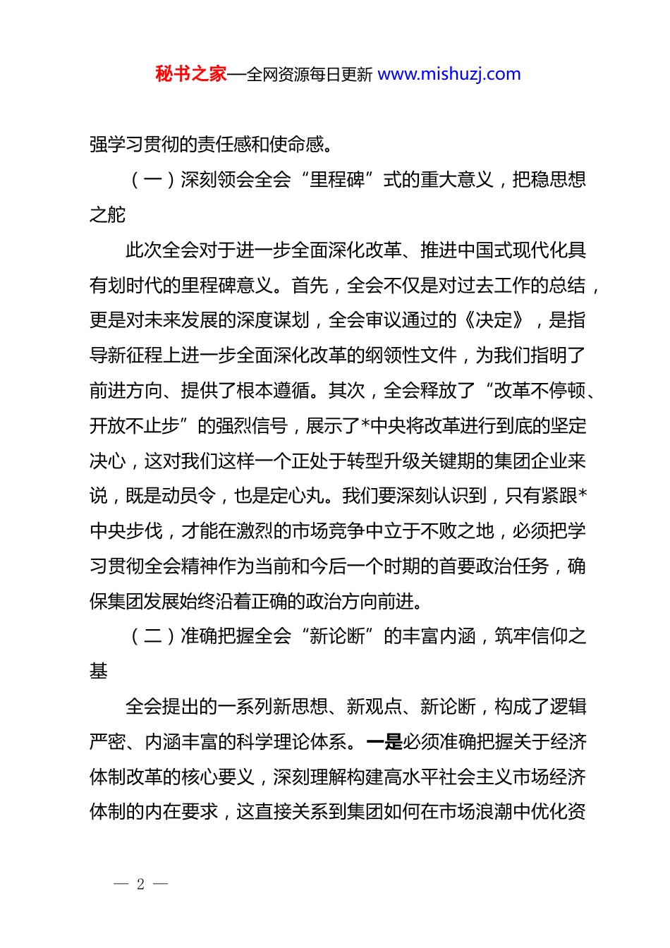 秘书之家—全网资源每日更新 www.mishuzj.com在集团公司学习宣贯*的二十届四中全会精神部署会上的总结讲话:领悟全会精髓汲取奋进力量同志们:今天,我们召开这次高规格、全覆盖的会议,主要任务是深入学习贯彻*的二十届四中全会精神,对集团上下抓好全会精神的宣贯工作进行动员部署。刚才,xx 同志传达了全会公报和《决定》的主要精神,xx 同志结合集团实际作了具体的宣贯方案说明,几家二级单位代表作了很好的表态发言,讲得都很到位,我完全赞同。这次会议不仅是一次学习会、宣贯会,更是一次改革发展的誓师会、动员会。全集团上下要迅速把思想和行动统一到*中央的决策部署上来,把智慧和力量凝聚到落实全会确定的各项任务上来。下面,就进一步抓好全会精神的学习宣传贯彻,结合集团当前工作实际,我讲四点意见。一、提高政治站位,深刻领悟全会精神实质,切实增强“两个维护”的自觉性*的二十届四中全会是在以中国式现代化全面推进强国建设、民族复兴伟业的关键时期召开的一次十分重要的会议。全集团必须从政治和全局的高度,深刻认识全会的重大意义,切实增— 1 —秘书之家—全网资源每日更新 www.mishuzj.com强学习贯彻的责任感和使命感。(一)深刻领会全会“里程碑”式的重大意义,把稳思想之舵此次全会对于进一步全面深化改革、推进中国式现代化具有划时代的里程碑意义。首先,全会不仅是对过去工作的总结,更是对未来发展的深度谋划,全会审议通过的《决定》,是指导新征程上进一步全面深化改革的纲领性文件,为我们指明了前进方向、提供了根本遵循。其次,全会释放了“改革不停顿、开放不止步”的强烈信号,展示了*中央将改革进行到底的坚定决心,这对我们这样一个正处于转型升级关键期的集团企业来说,既是动员令,也是定心丸。我们要深刻认识到,只有紧跟*中央步伐,才能在激烈的市场竞争中立于不败之地,必须把学习贯彻全会精神作为当前和今后一个时期的首要政治任务,确保集团发展始终沿着正确的政治方向前进。(二)准确把握全会“新论断”的丰富内涵,筑牢信仰之基全会提出的一系列新思想、新观点、新论断,构成了逻辑严密、内涵丰富的科学理论体系。一是必须准确把握关于经济体制改革的核心要义,深刻理解构建高水平社会主义市场经济体制的内在要求,这直接关系到集团如何在市场浪潮中优化资— 2 —秘书之家—全网资源每日更新 www.mishuzj.com源配置、提升核心竞争力。二是必须准确把握关于国资国企改革的具体要求,全会特别强调了做强做优做大国有资本和国有企业,增强核心功能,提升核心竞争力,这是我们谋划工作的逻辑起点和落脚点。我们要通过深学细悟,真正搞清楚“改什么、怎么改”的问题,把全会精神转化为武装头脑、指导实践、推动工作的强大思想武器,确保在思想上与*中央保持高度一致,在理论上时刻保持清醒坚定。(三)坚决落实全会“路线图”的战略部署,把准行动之向全会绘就了进一步全面深化改革的时间表和路线图,每一项部署都指向鲜明、针对性强。一方面,我们要对照全会提出的战略目标,结合集团实际,找准我们在国家战略全局中的定位,明确我们在产业链、供应链中的坐标,确保集团的发展战略与国家的大政方针同频共振。另一方面,我们要对标对表全会提出的具体任务,特别是涉及到我们所在行业的政策导向,要逐条梳理、逐项研究,把宏观的“大写意”转化为具体的“工笔画”。各级领导干部要强化执行意识,不折不扣地落实*中央关于推进国家治理体系和治理能力现代化的部署,把制度优势转化为集团的治理效能,确保各项改革任务在集团内部落地生根、开花结果。— 3 —秘书之家—全网资源每日更新 www.mishuzj.com二、聚焦主责主业,准确把握改革发展导向,奋力开创集团高质量发展新局面学习贯彻全会精神,关键在于落实,根本在于发展。我们要把全会精神与集团改革发展实际紧密结合起来,找准切入点和突破口,以钉钉子精神推动集团高质量发展迈上新台阶。(一)紧扣“高质量发展”这一首要任务,重塑竞争优势高质量发展是全面建设社会主义现代化国家的首要任务,也是集团生存发展的必由之路。首先,我们要坚持创新驱动发展战略,加大...