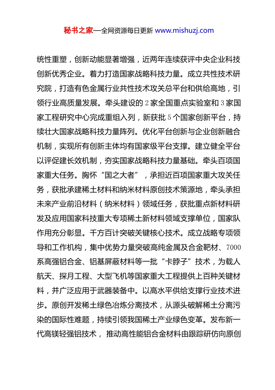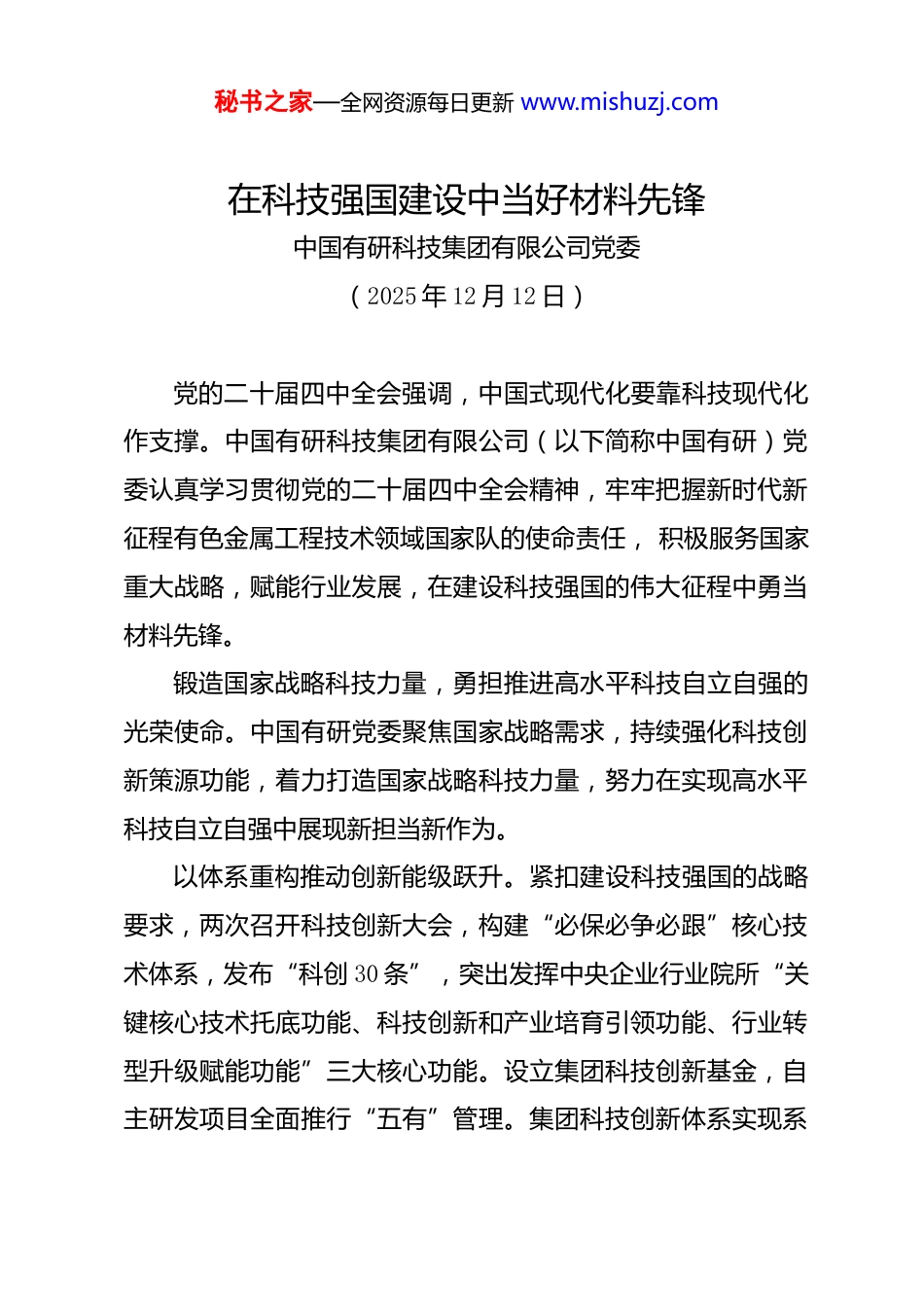 秘书之家—全网资源每日更新 www.mishuzj.com在科技强国建设中当好材料先锋中国有研科技集团有限公司党委(2025 年 12 月 12 日)党的二十届四中全会强调,中国式现代化要靠科技现代化作支撑。中国有研科技集团有限公司(以下简称中国有研)党委认真学习贯彻党的二十届四中全会精神,牢牢把握新时代新征程有色金属工程技术领域国家队的使命责任, 积极服务国家重大战略,赋能行业发展,在建设科技强国的伟大征程中勇当材料先锋。锻造国家战略科技力量,勇担推进高水平科技自立自强的光荣使命。中国有研党委聚焦国家战略需求,持续强化科技创新策源功能,着力打造国家战略科技力量,努力在实现高水平科技自立自强中展现新担当新作为。以体系重构推动创新能级跃升。紧扣建设科技强国的战略要求,两次召开科技创新大会,构建“必保必争必跟”核心技术体系,发布“科创 30 条”,突出发挥中央企业行业院所“关键核心技术托底功能、科技创新和产业培育引领功能、行业转型升级赋能功能”三大核心功能。设立集团科技创新基金,自主研发项目全面推行“五有”管理。集团科技创新体系实现系秘书之家—全网资源每日更新 www.mishuzj.com统性重塑,创新动能显著增强,近两年连续获评中央企业科技创新优秀企业。着力打造国家战略科技力量。成立共性技术研究院,打造有色金属行业共性技术攻关总平台和供给高地,引领行业高质量发展。牵头建设的 2 家全国重点实验室和 3 家国家工程研究中心完成重组入列,新获批 5 个国家创新平台,持续壮大国家战略科技力量阵列。优化平台创新与企业创新融合机制,实现所有创新主体均有国家级平台支撑。建立健全平台以评促建长效机制,夯实国家战略科技力量基础。牵头百项国家重大任务。胸怀“国之大者”,承担近百项国家重大攻关任务,获批承建稀土材料和纳米材料原创技术策源地,牵头承担未来产业前沿材料(纳米材料)领域任务,获批重点新材料研发及应用国家科技重大专项稀土新材料领域支撑单位,国家队作用充分彰显。千方百计突破关键核心技术。成立战略专项领导和工作机构,集中优势力量突破高纯金属及合金靶材、7000系高强铝合金、铝基屏蔽材料等一批“卡脖子”技术,为载人航天、探月工程、大型飞机等国家重大工程提供上百种关键材料,并广泛应用于武器装备中。以高水平供给支撑行业技术进步。原创开发稀土绿色冶炼分离技术,从源头破解稀土分离污染的国际性难题,持续引领我国稀土产业绿色变革。发布新一代高镁轻强铝技术, 推动高性能铝合金材料由跟踪研仿向原创秘书之家—全网资源每日更新 www.mishuzj.com引领转变。建成国家新材料测试评价平台唯一主中心,以检测技术革新驱动新材料产业高质量发展。以关键共性技术突破和科技服务体系建设,引领行业向高端化、智能化、绿色化方向发展。加强科技成果转化,加快培育发展新质生产力。中国有研党委把促进科技成果转化作为科技创新和产业创新深度融合的主要途径,推动创新链产业链贯通发展,加快培育发展新质生产力。以体制机制优化激发科技成果转化。聚焦成果转化堵点,构建科技项目“技术与市场”双线推进机制,试点职务科技成果赋权改革。召开科技成果转化应用促进大会,发布“成果转化六条”,构建科技成果高效转化服务体系,畅通成果转化“最后一公里”。以知识产权运营提升价值创造能力。系统实施高价值专利培育计划,打造全链条“一站式”运营平台,让“知产”加速变为“资产”。稀土绿色冶炼分离技术累计开展专利许可数十项;动力电池正极材料、全固态电解质原料等技术实现高价值转化, 知识产权转化成效加快显现。以科技创新培育增长新动能。聚焦新一代信息技术、新能源、新材料等方向,培育孵化增材制造、纳米材料等多个新质生产力增长点。加快推动存量科技成果“二次开发与转化”,超薄高强铝钛复合材料实现“第二场景”批量应用,加速科技成果向现实生产秘书之家—全网资源每日更新 www.mishuzj.com力转化。持续优化创新资源配置。强化企业创新主体地位,培育国家级专精特新企业 13 家、单项冠军企业 4 家,发挥科技领军企业龙头作用。推动企业主导的产学研融通创新,...