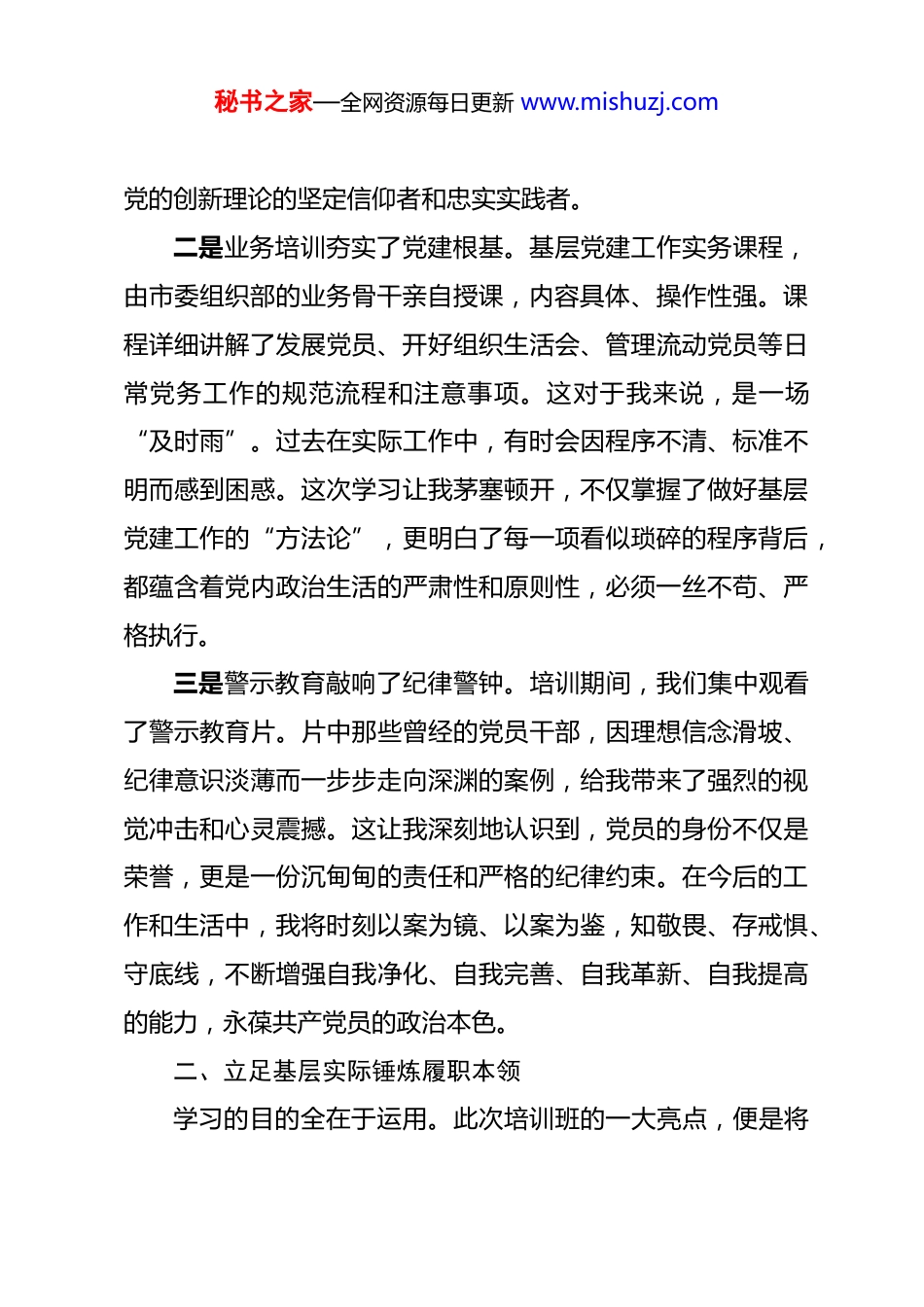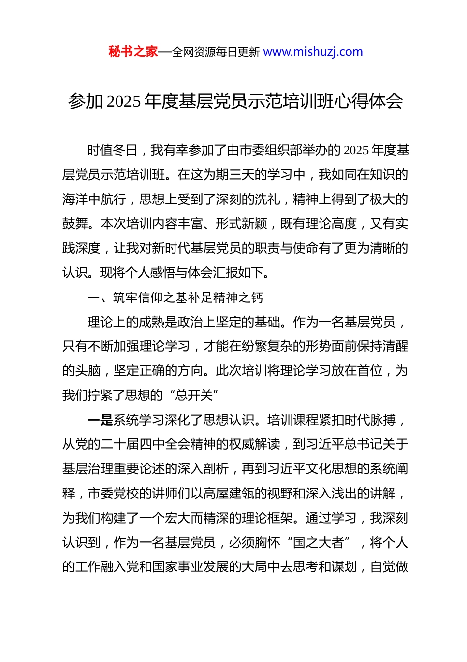 秘书之家—全网资源每日更新 www.mishuzj.com参加 2025 年度基层党员示范培训班心得体会 时值冬日,我有幸参加了由市委组织部举办的 2025 年度基层党员示范培训班。在这为期三天的学习中,我如同在知识的海洋中航行,思想上受到了深刻的洗礼,精神上得到了极大的鼓舞。本次培训内容丰富、形式新颖,既有理论高度,又有实践深度,让我对新时代基层党员的职责与使命有了更为清晰的认识。现将个人感悟与体会汇报如下。一、筑牢信仰之基补足精神之钙理论上的成熟是政治上坚定的基础。作为一名基层党员,只有不断加强理论学习,才能在纷繁复杂的形势面前保持清醒的头脑,坚定正确的方向。此次培训将理论学习放在首位,为我们拧紧了思想的“总开关”一是系统学习深化了思想认识。培训课程紧扣时代脉搏,从党的二十届四中全会精神的权威解读,到习近平总书记关于基层治理重要论述的深入剖析,再到习近平文化思想的系统阐释,市委党校的讲师们以高屋建瓴的视野和深入浅出的讲解,为我们构建了一个宏大而精深的理论框架。通过学习,我深刻认识到,作为一名基层党员,必须胸怀“国之大者”,将个人的工作融入党和国家事业发展的大局中去思考和谋划,自觉做秘书之家—全网资源每日更新 www.mishuzj.com党的创新理论的坚定信仰者和忠实实践者。二是业务培训夯实了党建根基。基层党建工作实务课程,由市委组织部的业务骨干亲自授课,内容具体、操作性强。课程详细讲解了发展党员、开好组织生活会、管理流动党员等日常党务工作的规范流程和注意事项。这对于我来说,是一场“及时雨”。过去在实际工作中,有时会因程序不清、标准不明而感到困惑。这次学习让我茅塞顿开,不仅掌握了做好基层党建工作的“方法论”,更明白了每一项看似琐碎的程序背后,都蕴含着党内政治生活的严肃性和原则性,必须一丝不苟、严格执行。三是警示教育敲响了纪律警钟。培训期间,我们集中观看了警示教育片。片中那些曾经的党员干部,因理想信念滑坡、纪律意识淡薄而一步步走向深渊的案例,给我带来了强烈的视觉冲击和心灵震撼。这让我深刻地认识到,党员的身份不仅是荣誉,更是一份沉甸甸的责任和严格的纪律约束。在今后的工作和生活中,我将时刻以案为镜、以案为鉴,知敬畏、存戒惧、守底线,不断增强自我净化、自我完善、自我革新、自我提高的能力,永葆共产党员的政治本色。二、立足基层实际锤炼履职本领学习的目的全在于运用。此次培训班的一大亮点,便是将秘书之家—全网资源每日更新 www.mishuzj.com理论政策与本土实践进行了深度融合,课程设置充满了浓厚的“泥土味”和“烟火气”,有效提升了我们服务群众、推动发展的实践能力。一是科技赋能让我看到了乡村振兴的新路径。在“科技赋能再生稻稳粮保供促增收”这堂特色实务课上,科技特派员的讲解让我眼界大开。我了解到,再生稻技术不仅是保障粮食安全的重要举措,更是促进农民增收的有效途径,与单季稻相比,亩均纯利润可增收 500 余元。通过科技特派员围绕“中稻+再生稻”高效栽培技术的理论授课和田间教学模式的介绍,我真切地感受到科技的力量如何将课堂与田野紧密连接,如何将论文写在大地上。这堂课让我深刻体会到,作为基层党员,要主动学习新知识、拥抱新技术,争当带领群众科技致富的“领头雁”二是文化赋能让我理解了乡村振兴的深层内涵。“文化赋能乡村振兴的**实践与探索”课程,分享了本地优秀村庄的成功经验。这让我明白,乡村振兴不仅要实现“产业兴旺、生活富裕”,更要实现“乡风文明、治理有效”。文化是乡村的灵魂,挖掘和传承本土优秀传统文化,可以凝聚人心、淳化民风,增强村民的认同感和归属感。这启发我,在今后的工作中,要更加注重文化建设在基层治理中的作用,将文化软实力转化为秘书之家—全网资源每日更新 www.mishuzj.com推动乡村全面振兴的硬支撑。三是榜样引领让我找到了学习的标杆。培训邀请了优秀村党组织书记进行经验分享。他们用最朴实的语言,讲述了自己带领村民修路架桥、发展产业、化解矛盾的真实故事。这些故事没有华丽的辞藻,却充满了真情实感,充满了攻坚克难的智慧和为民服务的情怀。从他们身上,我看到...