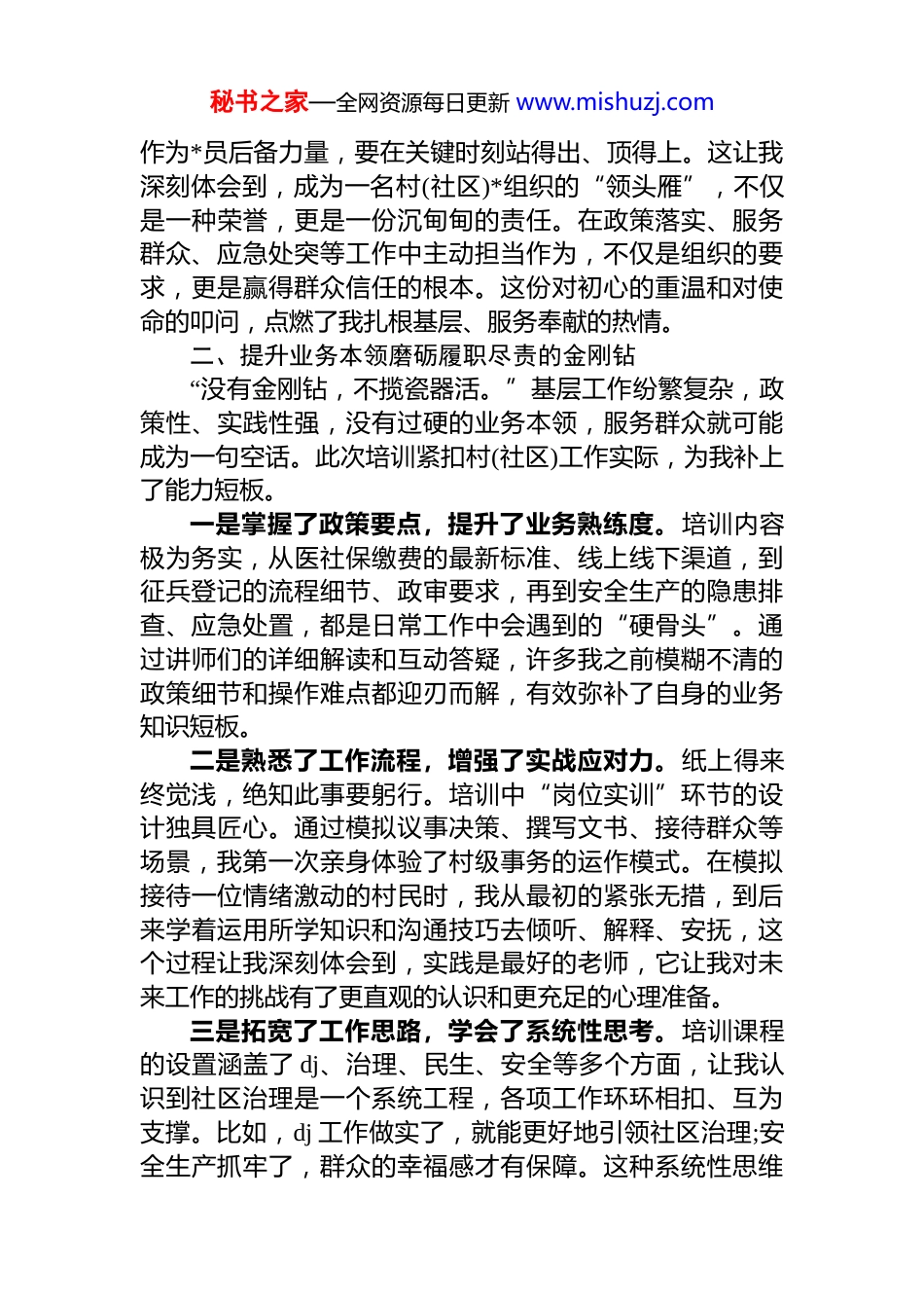 秘书之家—全网资源每日更新 www.mishuzj.com参加 xx 镇村(社区)*组织后备人选培训班心得体会有幸参加 xx 镇*委于 2025 年 10 月下旬至 12 月精心组织的村(社区)*组织后备人选培训班,我倍感荣幸与珍惜。在这段宝贵的学习时光里,我收获颇丰,感悟良多。此次培训不仅是一次知识的“充电”,更是一次思想的“洗礼”与精神的“补钙”,让我对基层工作的认识更加深刻对肩负的责任更加明晰。一、筑牢思想根基校准服务群众的定盘星基层工作千头万绪,归根结底是做人的工作,而做人的工作,首先要端正自身的思想。本次培训将思想作风建设放在突出位置,使我在思想上受到深刻淬炼。一是深化了理论认识,补足了精神之钙。培训课程系统地讲解了*的创新理论与方针政策,这对于提升个人理论素养至关重要。过去,我对一些政策的理解可能停留在表面,知其然却不知其所以然。通过专题授课,我明白了每一项政策背后的深远考量与为民初心,理论学习不再是空洞的口号,而是指导实践的强大思想武器,让我看问题的站位更高,思考问题也更有深度。二是增强了纪律意识,绷紧了廉洁之弦。培训中的*风廉政建设与反腐败警示教育课,对我触动极大。一个个鲜活的典型案例剖析,犹如警钟长鸣,让我深刻认识到纪律红线是不可触碰的高压线,工作底线是必须坚守的生命线这让我更加清醒地认识到,作为一名后备人选,必须树立正确的权力观、政绩观,时刻自重、自省、自警、自励,将清正廉洁的种子深植于心,方能行稳致远。三是坚定了初心使命,激发了担当之情。培训强调,秘书之家—全网资源每日更新 www.mishuzj.com作为*员后备力量,要在关键时刻站得出、顶得上。这让我深刻体会到,成为一名村(社区)*组织的“领头雁”,不仅是一种荣誉,更是一份沉甸甸的责任。在政策落实、服务群众、应急处突等工作中主动担当作为,不仅是组织的要求,更是赢得群众信任的根本。这份对初心的重温和对使命的叩问,点燃了我扎根基层、服务奉献的热情。二、提升业务本领磨砺履职尽责的金刚钻“没有金刚钻,不揽瓷器活。”基层工作纷繁复杂,政策性、实践性强,没有过硬的业务本领,服务群众就可能成为一句空话。此次培训紧扣村(社区)工作实际,为我补上了能力短板。一是掌握了政策要点,提升了业务熟练度。培训内容极为务实,从医社保缴费的最新标准、线上线下渠道,到征兵登记的流程细节、政审要求,再到安全生产的隐患排查、应急处置,都是日常工作中会遇到的“硬骨头”。通过讲师们的详细解读和互动答疑,许多我之前模糊不清的政策细节和操作难点都迎刃而解,有效弥补了自身的业务知识短板。二是熟悉了工作流程,增强了实战应对力。纸上得来终觉浅,绝知此事要躬行。培训中“岗位实训”环节的设计独具匠心。通过模拟议事决策、撰写文书、接待群众等场景,我第一次亲身体验了村级事务的运作模式。在模拟接待一位情绪激动的村民时,我从最初的紧张无措,到后来学着运用所学知识和沟通技巧去倾听、解释、安抚,这个过程让我深刻体会到,实践是最好的老师,它让我对未来工作的挑战有了更直观的认识和更充足的心理准备。三是拓宽了工作思路,学会了系统性思考。培训课程的设置涵盖了 dj、治理、民生、安全等多个方面,让我认识到社区治理是一个系统工程,各项工作环环相扣、互为支撑。比如,dj 工作做实了,就能更好地引领社区治理;安全生产抓牢了,群众的幸福感才有保障。这种系统性思维秘书之家—全网资源每日更新 www.mishuzj.com的培养,帮助我跳出“就事论事”的局限,学着用更宏观更全面的视角去审视和谋划工作。三、明晰未来方向争做堪当重任的排头兵培训的结束,是学习的结束,更是实践的开始。面对组织的信任和群众的期盼,我深感责任重大,也对未来的道路有了更清晰的规划。一是将所学转化为服务群众的实际行动。我将以此次培训为新的起点,主动投身村级事务,将课堂上学到的理论知识、政策法规和工作方法,切实运用到为群众办实事解难题的实践中去。从协助处理一件邻里纠纷,到帮助一位老人办理社保,我希望用一件件具体的“小事”,汇聚成服务群众的“大爱”,用实际行动来检验学习的成效。二是将差距视...