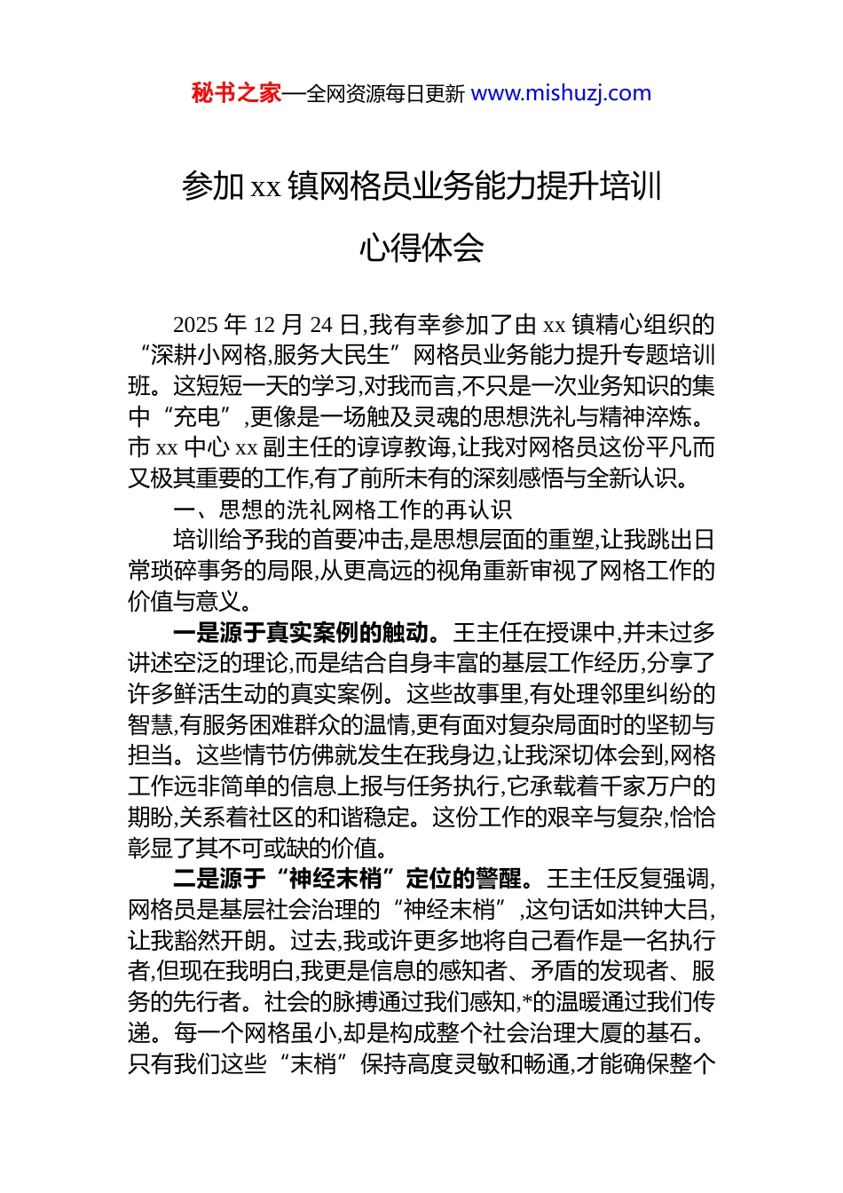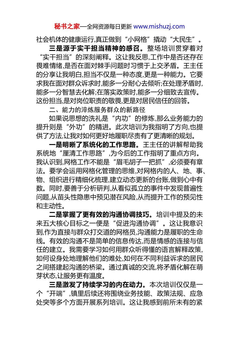 秘书之家—全网资源每日更新 www.mishuzj.com参加 xx 镇网格员业务能力提升培训心得体会2025 年 12 月 24 日,我有幸参加了由 xx 镇精心组织的“深耕小网格,服务大民生”网格员业务能力提升专题培训班。这短短一天的学习,对我而言,不只是一次业务知识的集中“充电”,更像是一场触及灵魂的思想洗礼与精神淬炼。市 xx 中心 xx 副主任的谆谆教诲,让我对网格员这份平凡而又极其重要的工作,有了前所未有的深刻感悟与全新认识。一、思想的洗礼网格工作的再认识培训给予我的首要冲击,是思想层面的重塑,让我跳出日常琐碎事务的局限,从更高远的视角重新审视了网格工作的价值与意义。一是源于真实案例的触动。王主任在授课中,并未过多讲述空泛的理论,而是结合自身丰富的基层工作经历,分享了许多鲜活生动的真实案例。这些故事里,有处理邻里纠纷的智慧,有服务困难群众的温情,更有面对复杂局面时的坚韧与担当。这些情节仿佛就发生在我身边,让我深切体会到,网格工作远非简单的信息上报与任务执行,它承载着千家万户的期盼,关系着社区的和谐稳定。这份工作的艰辛与复杂,恰恰彰显了其不可或缺的价值。二是源于“神经末梢”定位的警醒。王主任反复强调,网格员是基层社会治理的“神经末梢”,这句话如洪钟大吕,让我豁然开朗。过去,我或许更多地将自己看作是一名执行者,但现在我明白,我更是信息的感知者、矛盾的发现者、服务的先行者。社会的脉搏通过我们感知,*的温暖通过我们传递。每一个网格虽小,却是构成整个社会治理大厦的基石。只有我们这些“末梢”保持高度灵敏和畅通,才能确保整个秘书之家—全网资源每日更新 www.mishuzj.com社会机体的健康运行,真正做到“小网格”撬动“大民生”。三是源于实干担当精神的感召。整场培训贯穿着对“实干担当”的深刻阐释。这让我反思,工作中是否还存在畏难情绪,是否在面对棘手问题时习惯于上交矛盾。王主任的分享让我明白,担当不仅是一种态度,更是一种能力。它要求我在面对群众诉求时,能多一分耐心去倾听;在处理矛盾时,能多一分智慧去化解;在落实政策时,能多一分细致去宣传。这份担当,是对岗位职责的敬畏,更是对居民信任的回答。二、能力的淬炼服务群众的新路径如果说思想的洗礼是“内功”的修炼,那么业务能力的提升则是“外功”的精进。此次培训为我指明了方向,也提供了方法,让我对如何更好地履职尽责有了更清晰的规划。一是明晰了系统化的工作思路。王主任的讲解帮助我系统地“厘清工作思路”,为今后的工作指明了重点方向。我认识到,网格工作不能是“眉毛胡子一把抓”,必须要有章法。要学会运用网格化管理的思维,对网格内的人、地、事、物、组织进行精细化梳理,建立动态更新的台账,做到心中有数。同时,要善于分析研判,从看似孤立的事件中发现普遍性问题,从苗头性隐患中预见潜在风险,从而提升工作的预见性和主动性。二是掌握了更有效的沟通协调技巧。培训中提及的未来五大核心目标之一便是“促进沟通协调”。这让我意识到,作为直接与群众打交道的网格员,沟通能力是履职的生命线。有效的沟通不是简单的信息传达,而是情感的连接与信任的建立。我需要学习如何用群众听得懂的语言解释政策,如何设身处地理解他们的难处,如何在不同利益诉求的居民之间搭建起沟通的桥梁。通过真诚的交流,将矛盾化解在萌芽状态,让服务更有温度。三是激发了持续学习的内在动力。本次培训仅仅是一个“开端”,镇里后续还将围绕业务技能、政策法规、应急处突等多个方面开展系列培训。这让我感到前所未有的紧秘书之家—全网资源每日更新 www.mishuzj.com迫感和求知欲。社会在发展,政策在更新,群众的需求也在变化,只有不断学习,才能跟上时代的步伐,才能应对各种新情况、新挑战。我决心将学习作为一种常态,主动熟悉各项政策法规,积极钻研应急处置流程,努力成为一名让组织放心、让群众满意的“政策通”和“活地图”。三、初心的重温砥砺前行的源动力培训的结束,正是我履职新征程的开始。它不仅让我学到了知识、提升了能力,更重要的是,它重新点燃了我内心深处那份为民服务的热忱与初心。一是对肩上责任有了更沉甸甸的体悟。网格员的工作,一头连着*委政府,一头连着万千百姓。这份工...