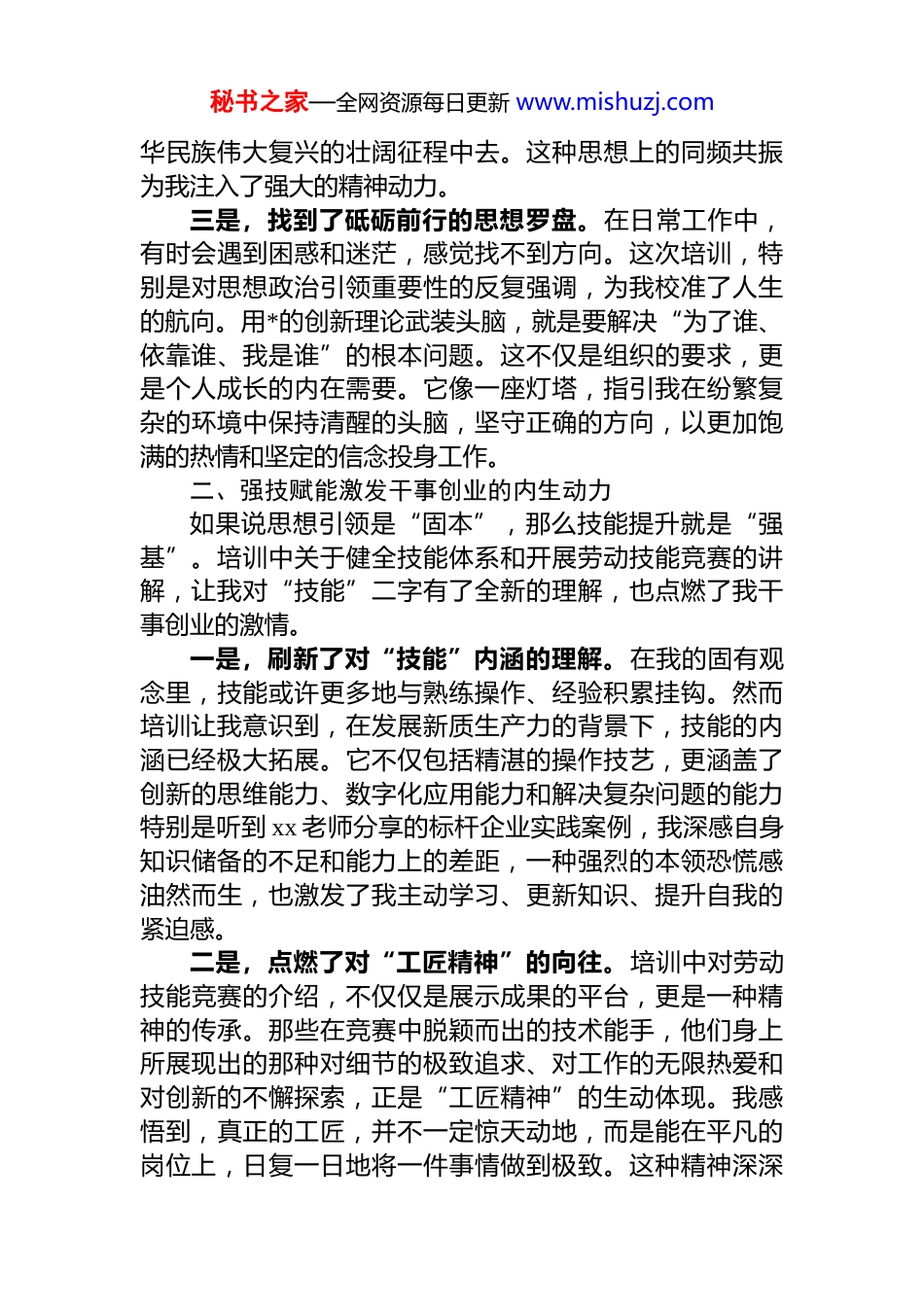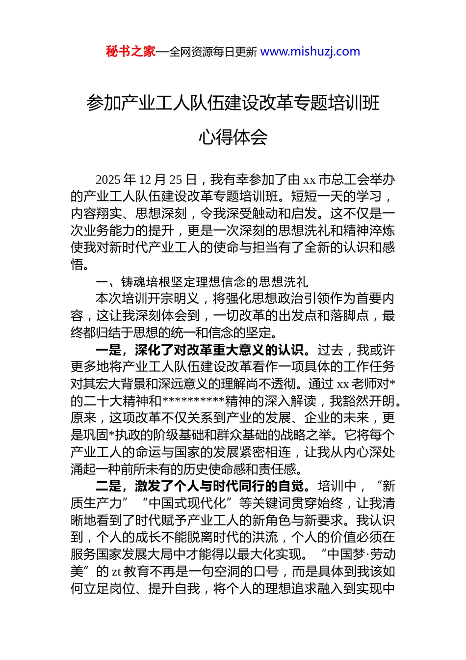 秘书之家—全网资源每日更新 www.mishuzj.com参加产业工人队伍建设改革专题培训班心得体会2025 年 12 月 25 日,我有幸参加了由 xx 市总工会举办的产业工人队伍建设改革专题培训班。短短一天的学习,内容翔实、思想深刻,令我深受触动和启发。这不仅是一次业务能力的提升,更是一次深刻的思想洗礼和精神淬炼使我对新时代产业工人的使命与担当有了全新的认识和感悟。一、铸魂培根坚定理想信念的思想洗礼本次培训开宗明义,将强化思想政治引领作为首要内容,这让我深刻体会到,一切改革的出发点和落脚点,最终都归结于思想的统一和信念的坚定。一是,深化了对改革重大意义的认识。过去,我或许更多地将产业工人队伍建设改革看作一项具体的工作任务对其宏大背景和深远意义的理解尚不透彻。通过 xx 老师对*的二十大精神和**********精神的深入解读,我豁然开朗。原来,这项改革不仅关系到产业的发展、企业的未来,更是巩固*执政的阶级基础和群众基础的战略之举。它将每个产业工人的命运与国家的发展紧密相连,让我从内心深处涌起一种前所未有的历史使命感和责任感。二是,激发了个人与时代同行的自觉。培训中,“新质生产力”“中国式现代化”等关键词贯穿始终,让我清晰地看到了时代赋予产业工人的新角色与新要求。我认识到,个人的成长不能脱离时代的洪流,个人的价值必须在服务国家发展大局中才能得以最大化实现。“中国梦·劳动美”的 zt 教育不再是一句空洞的口号,而是具体到我该如何立足岗位、提升自我,将个人的理想追求融入到实现中秘书之家—全网资源每日更新 www.mishuzj.com华民族伟大复兴的壮阔征程中去。这种思想上的同频共振为我注入了强大的精神动力。三是,找到了砥砺前行的思想罗盘。在日常工作中,有时会遇到困惑和迷茫,感觉找不到方向。这次培训,特别是对思想政治引领重要性的反复强调,为我校准了人生的航向。用*的创新理论武装头脑,就是要解决“为了谁、依靠谁、我是谁”的根本问题。这不仅是组织的要求,更是个人成长的内在需要。它像一座灯塔,指引我在纷繁复杂的环境中保持清醒的头脑,坚守正确的方向,以更加饱满的热情和坚定的信念投身工作。二、强技赋能激发干事创业的内生动力如果说思想引领是“固本”,那么技能提升就是“强基”。培训中关于健全技能体系和开展劳动技能竞赛的讲解,让我对“技能”二字有了全新的理解,也点燃了我干事创业的激情。一是,刷新了对“技能”内涵的理解。在我的固有观念里,技能或许更多地与熟练操作、经验积累挂钩。然而培训让我意识到,在发展新质生产力的背景下,技能的内涵已经极大拓展。它不仅包括精湛的操作技艺,更涵盖了创新的思维能力、数字化应用能力和解决复杂问题的能力特别是听到 xx 老师分享的标杆企业实践案例,我深感自身知识储备的不足和能力上的差距,一种强烈的本领恐慌感油然而生,也激发了我主动学习、更新知识、提升自我的紧迫感。二是,点燃了对“工匠精神”的向往。培训中对劳动技能竞赛的介绍,不仅仅是展示成果的平台,更是一种精神的传承。那些在竞赛中脱颖而出的技术能手,他们身上所展现出的那种对细节的极致追求、对工作的无限热爱和对创新的不懈探索,正是“工匠精神”的生动体现。我感悟到,真正的工匠,并不一定惊天动地,而是能在平凡的岗位上,日复一日地将一件事情做到极致。这种精神深深秘书之家—全网资源每日更新 www.mishuzj.com地感染了我,让我决心在未来的工作中,更加专注、更加严谨,努力在自己的岗位上打磨出不凡的业绩。三是,搭建了互学互鉴的广阔平台。虽然我没有亲身站在竞赛的舞台上,但通过培训中的案例分享和经验交流我仿佛置身于一个高手云集的学习场。优秀班组的建设经验,让我看到了团队协作的力量;标杆企业的改革实践,为我提供了可资借鉴的宝贵思路。这种“云端”的学习和交流,打破了空间的限制,开阔了我的视野,让我认识到自身的渺小和学习的无止境。我将把这次学习到的经验,内化于心,外化于行,不断向身边的榜样看齐。三、维权固本增强履职尽责的使命担当培训的最后一个环节是关于保障产业工人合法权益的讲解,这让我对权利与责任的关...