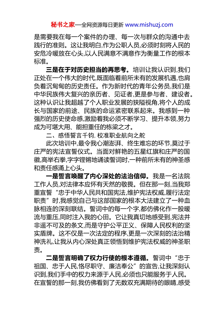 秘书之家—全网资源每日更新 www.mishuzj.com参加初任公务员培训心得体会时光荏苒,岁月如梭。当我执笔写下这篇心得体会时,已是 2025 年 12 月 19 日。回望一个多月前,也就是 2025 年 11月 8 日,我怀着激动与期待的心情,与单位新入职的同事们共同参加了初任公务员培训。这次培训内容丰富、意义深远,尤其是在庄严的宪法宣誓仪式中,我深受触动,对“公务员”这一身份的内涵与重量有了更为真切的体悟。这不仅是一次知识的汲取,更是一场思想的洗礼,让我更加坚定了为人民服务的初心与使命。一、深化理论认知,筑牢理想信念之基培训将深入学习**************思想作为首要内容与核心环节,通过系统性的讲授与研读,我深刻认识到其作为引领新时代发展的思想旗帜和行动指南的重大意义。一是在于对思想伟力的再认识。以往对这一思想的理解,多停留在概念层面。而此次培训通过深入浅出的讲解,将其与国家发展的宏伟蓝图、社会治理的生动实践以及我们日常工作的具体要求紧密结合。我深刻体会到,这一思想不仅系统回答了“坚持和发展什么样的中国特色社会主义、怎样坚持和发展中国特色社会主义”等重大时代课题,更蕴含着科学的世界观和方法论,为我们认识问题、分析问题、解决问题提供了“金钥匙”。这让我从内心深处增强了“四个认同”,即政治认同、思想认同、理论认同与情感认同,好似航船寻得了灯塔,前行的道路愈发清晰。二是在于对人民立场的再感悟。学习中,我反复咀嚼着“人民”二字的分量。无论是脱贫攻坚的伟大奇迹,还是疫情防控的人民战争,都彰显了鲜明的人民立场。我开始反思,作为一名身处 xx 法院的工作人员,我的工作如何才能真正体现“司法为民”的宗旨。这不再是一句挂在墙上的标语,而秘书之家—全网资源每日更新 www.mishuzj.com是需要我在每一个案件的办理、每一次与群众的沟通中去践行的准则。这让我明白,作为公职人员,必须时刻将人民的安危冷暖放在心头,以人民满意不满意作为衡量工作的根本标准。三是在于对历史担当的再思考。培训让我认识到,我们正处在一个伟大的时代,既面临着前所未有的发展机遇,也肩负着沉甸甸的历史责任。作为新时代的青年公务员,我们是中华民族伟大复兴的亲历者、见证者,更是参与者、建设者。这种认识让我超越了个人职业发展的狭隘视角,将个人的成长与国家的前途、民族的命运紧密联系起来。我感到一种强烈的历史使命感,激励着我必须不断学习、提升本领,努力成为可堪大用、能担重任的栋梁之才。二、感悟誓言千钧,校准职业航向之舵此次培训中,最令我心潮澎湃、终生难忘的环节,莫过于庄严的宪法宣誓仪式。当面对鲜艳的五星红旗和庄严的国徽,高举右拳,字字铿锵地诵读誓词时,一种前所未有的神圣感和责任感涌上心头。一是誓言唤醒了内心深处的法治信仰。我是一名法院工作人员,对法律本应怀有天然的敬畏。但在那一刻,当我郑重宣誓“忠于中华人民共和国宪法,维护宪法权威,履行法定职责”时,我感觉自己与这部国家的根本大法建立了一种血脉相连的深刻联结。誓词中的每一个字,都仿佛化作一股暖流与重压,同时注入我的心田。它让我真切地感受到,宪法并非遥不可及的条文,而是守护公平正义、保障人民权利的坚实盾牌。这不仅是一次法定的程序,更是一次深刻的法治精神洗礼,让我从内心深处真正领悟到维护宪法权威的神圣职责。二是誓言明确了权力行使的根本遵循。誓词中“忠于祖国、忠于人民,恪尽职守、廉洁奉公”的宣告,让我深刻认识到,我们手中的权力来源于人民,必须也只能服务于人民。在宣誓的那一刻,我仿佛看到了无数双充满期待的眼睛,感受秘书之家—全网资源每日更新 www.mishuzj.com到了人民群众对公平正义的深切期盼。这沉甸甸的 70 字誓言,是我向*和人民作出的郑重承诺,是一份必须用一生去践行的责任状。它时刻提醒我,要正确看待和行使权力,始终保持清正廉洁的政治本色,做到心有所畏、言有所戒、行有所止。三是誓言注入了砥砺前行的不竭动力。“接受人民监督,为建设富强民主文明和谐美丽的社会主义现代化强国努力奋斗!”当最后一句誓言响彻全场,我的内心充满了无尽的力量。这不仅仅是入职的承诺,更是我毕生奋斗的航标。它激励我,在未来的职业生涯中,无论遇到...