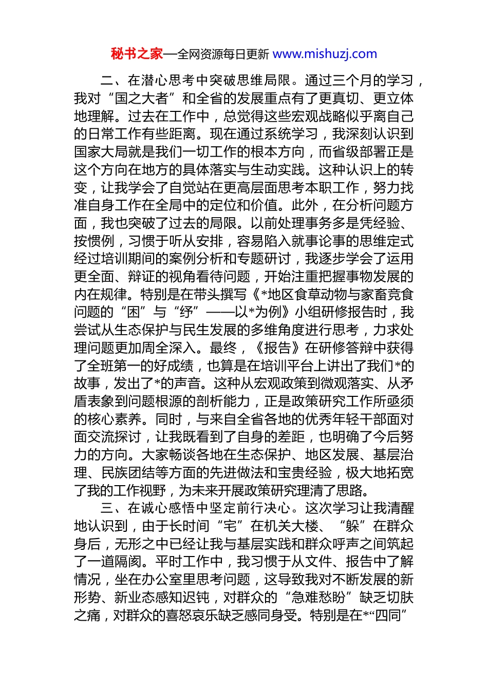 秘书之家—全网资源每日更新 www.mishuzj.com参加第 17 期青年干部培训班心得体会时光荏苒,三个月的培训学习转瞬即逝。回望这段难忘的经历,我仿佛进入了一个远离事务喧嚣的“精神高地”和“思想熔炉”,在这里,我完成了从埋头苦干具体事,到学会抬头看方向的转变;从习惯于听从指令,到开始独立思考全局的成长。与其说这是一次培训,更像是一次宝贵的沉淀,让我在忙碌的工作中停下来,为思想和心灵扎实地“充了一次电”。一、在虚心学习中补齐理论短板。在*委*校学习,不仅是一次知识的积累,更是一次深刻的自我审视与精神洗礼。我一直在*委办公室工作,以往的学习多是零敲碎打,常常是为了起草某份材料或完成手头任务而去查资料、找依据,总以为自己接触过不少理论。这次在*校,当我真正静下心来系统听课、研读原著、参与研讨,才发现自己过去的认知是多么局限。我意识到,自己过去掌握的只是一些零散的片段,许多理解都停留在字面,有时甚至是片面和断章取义的,对于*的创新理论的内在逻辑和深层精髓,把握得非常肤浅。这种差距让我内心深受触动,甚至产生了“能不配位”的紧张与不安。我深刻明白了,作为一名新时代的青年干部,如果理论根基打不牢,就看不清问题的本质,抓工作也容易偏离方向,甚至迷失在纷繁复杂的事务之中。而这三个月的系统学习,就像把我脑中散落各处的“知识珍珠”串成了一条完整的“项链”,心里感觉一下子亮堂、踏实了许多。我不仅理解了各项政策背后深刻的时代背景与战略考量,对于工作中“为什么干、怎么干更好”的思路也变得更加清晰。这份在理论上的沉淀与夯实,是我此行最宝贵的收获,它为我未来的工作提供了坚实的思想基础和行动指南。秘书之家—全网资源每日更新 www.mishuzj.com二、在潜心思考中突破思维局限。通过三个月的学习,我对“国之大者”和全省的发展重点有了更真切、更立体地理解。过去在工作中,总觉得这些宏观战略似乎离自己的日常工作有些距离。现在通过系统学习,我深刻认识到国家大局就是我们一切工作的根本方向,而省级部署正是这个方向在地方的具体落实与生动实践。这种认识上的转变,让我学会了自觉站在更高层面思考本职工作,努力找准自身工作在全局中的定位和价值。此外,在分析问题方面,我也突破了过去的局限。以前处理事务多是凭经验、按惯例,习惯于听从安排,容易陷入就事论事的思维定式经过培训期间的案例分析和专题研讨,我逐步学会了运用更全面、辩证的视角看待问题,开始注重把握事物发展的内在规律。特别是在带头撰写《*地区食草动物与家畜竞食问题的“困”与“纾”——以*为例》小组研修报告时,我尝试从生态保护与民生发展的多维角度进行思考,力求处理问题更加周全深入。最终,《报告》在研修答辩中获得了全班第一的好成绩,也算是在培训平台上讲出了我们*的故事,发出了*的声音。这种从宏观政策到微观落实、从矛盾表象到问题根源的剖析能力,正是政策研究工作所亟须的核心素养。同时,与来自全省各地的优秀年轻干部面对面交流探讨,让我既看到了自身的差距,也明确了今后努力的方向。大家畅谈各地在生态保护、地区发展、基层治理、民族团结等方面的先进做法和宝贵经验,极大地拓宽了我的工作视野,为未来开展政策研究理清了思路。三、在诚心感悟中坚定前行决心。这次学习让我清醒地认识到,由于长时间“宅”在机关大楼、“躲”在群众身后,无形之中已经让我与基层实践和群众呼声之间筑起了一道隔阂。平时工作中,我习惯于从文件、报告中了解情况,坐在办公室里思考问题,这导致我对不断发展的新形势、新业态感知迟钝,对群众的“急难愁盼”缺乏切肤之痛,对群众的喜怒哀乐缺乏感同身受。特别是在*“四同”秘书之家—全网资源每日更新 www.mishuzj.com教育期间,当我跟老乡同吃同住同劳动时,更多的是一种走出农村又“回到”农村的熟悉与亲切感,但在与村民拉家常、认亲戚,以“村里人”的视角感受乡村振兴,用“学生”的姿态倾听群众心声方面,却显得有些生疏和力不从心。这种诚心的感悟让我下定决心,必须坚决打破这种“路径依赖”。今后的工作中,我要更多地主动走到基层一线和群众身边,用自己的...