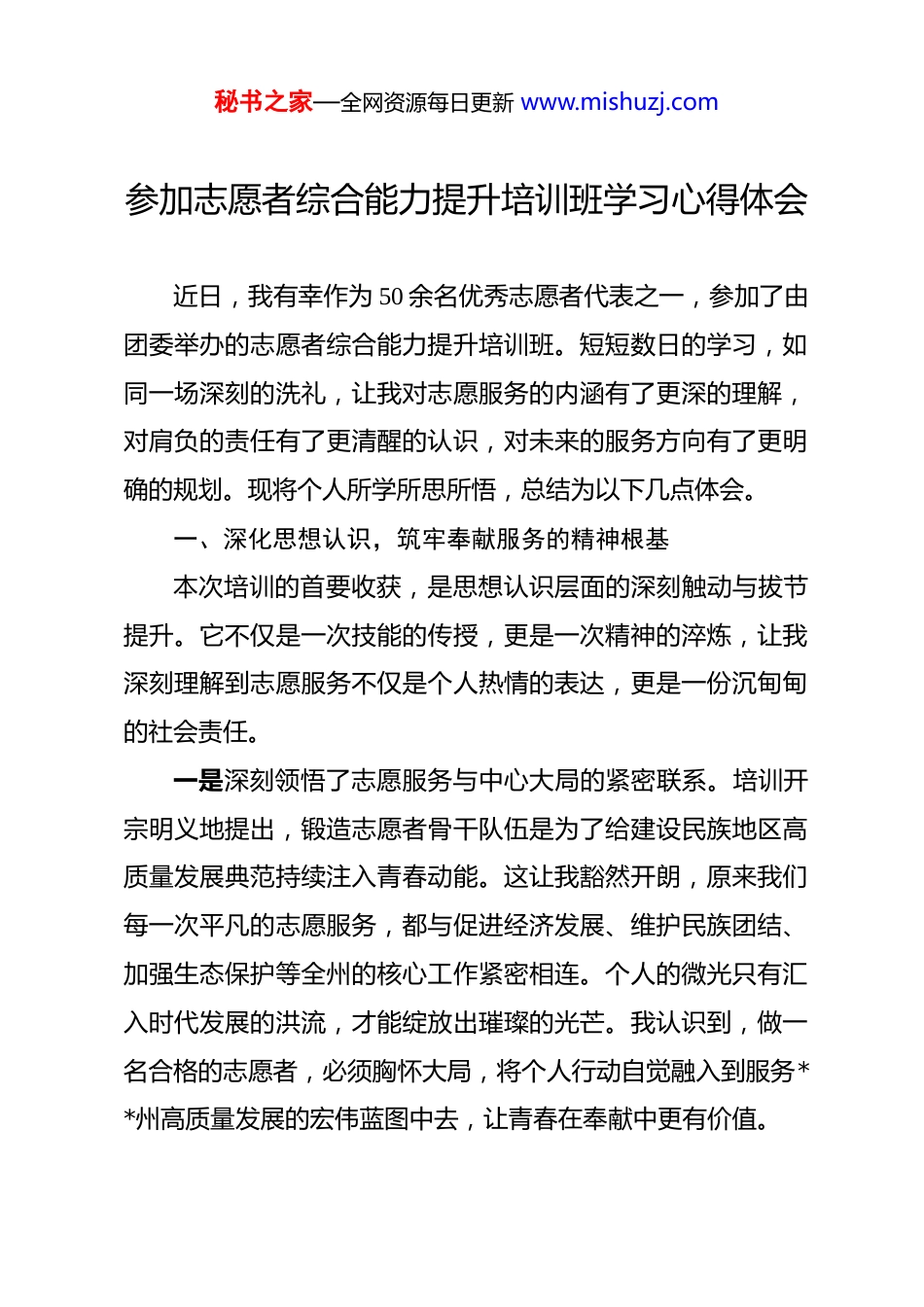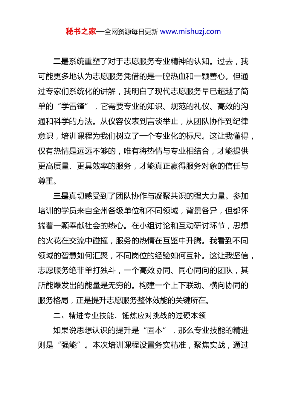秘书之家—全网资源每日更新 www.mishuzj.com参加志愿者综合能力提升培训班学习心得体会 近日,我有幸作为 50 余名优秀志愿者代表之一,参加了由团委举办的志愿者综合能力提升培训班。短短数日的学习,如同一场深刻的洗礼,让我对志愿服务的内涵有了更深的理解,对肩负的责任有了更清醒的认识,对未来的服务方向有了更明确的规划。现将个人所学所思所悟,总结为以下几点体会。一、深化思想认识,筑牢奉献服务的精神根基本次培训的首要收获,是思想认识层面的深刻触动与拔节提升。它不仅是一次技能的传授,更是一次精神的淬炼,让我深刻理解到志愿服务不仅是个人热情的表达,更是一份沉甸甸的社会责任。一是深刻领悟了志愿服务与中心大局的紧密联系。培训开宗明义地提出,锻造志愿者骨干队伍是为了给建设民族地区高质量发展典范持续注入青春动能。这让我豁然开朗,原来我们每一次平凡的志愿服务,都与促进经济发展、维护民族团结、加强生态保护等全州的核心工作紧密相连。个人的微光只有汇入时代发展的洪流,才能绽放出璀璨的光芒。我认识到,做一名合格的志愿者,必须胸怀大局,将个人行动自觉融入到服务**州高质量发展的宏伟蓝图中去,让青春在奉献中更有价值。秘书之家—全网资源每日更新 www.mishuzj.com二是系统重塑了对于志愿服务专业精神的认知。过去,我可能更多地认为志愿服务凭借的是一腔热血和一颗善心。但通过专家们系统化的讲解,我明白了现代志愿服务早已超越了简单的“学雷锋”,它需要专业的知识、规范的礼仪、高效的沟通和科学的方法。从仪容仪表到言谈举止,从团队协作到纪律意识,培训课程为我们树立了一个专业化的标尺。这让我懂得,仅有热情是远远不够的,唯有将热情与专业相结合,才能提供更高质量、更具效率的服务,才能真正赢得服务对象的信任与尊重。三是真切感受到了团队协作与凝聚共识的强大力量。参加培训的学员来自全州各级单位和不同领域,背景各异,但都怀揣着一颗奉献社会的热心。在小组讨论和互动研讨环节,思想的火花在交流中碰撞,服务的热情在互鉴中升腾。我看到不同领域的智慧如何汇聚,不同岗位的经验如何互补。这让我坚信,志愿服务绝非单打独斗,一个高效协同、同心同向的团队,其所能爆发出的能量是无穷的。构建一个上下联动、横向协同的服务格局,正是提升志愿服务整体效能的关键所在。二、精进专业技能,锤炼应对挑战的过硬本领如果说思想认识的提升是“固本”,那么专业技能的精进则是“强能”。本次培训课程设置务实精准,聚焦实战,通过秘书之家—全网资源每日更新 www.mishuzj.com一系列针对性的学习和演练,有效提升了我在复杂场景下的专业服务能力,让我从一名“热心肠”向一名“多面手”转变。一是掌握了从容应对大型活动的组织协调能力。培训紧扣全州重点工作、重大会议赛事等服务保障需求,通过生动的案例分析和逼真的情景模拟,系统讲解了大型活动中志愿者的角色定位、任务分配、流程管理与协同配合。这让我学到了如何在人流引导、信息咨询、后勤保障等环节做到忙而不乱、有条不紊。这些知识和方法论,为今后参与类似活动提供了清晰的行动指南,让我更有信心在大型活动中展现志愿者的良好风貌。二是增强了有效处置应急突发状况的支援能力。培训专设的“应急处突支援”模块让我印象尤为深刻。地理环境特殊,提升应急能力至关重要。专家通过讲解与演练,教授了我们在突发事件中如何进行初步的心理疏导、信息上报、秩序维护和自救互救。这不仅是技能的提升,更是心理素质的锤炼。我明白了在危急时刻,志愿者的冷静、专业和有序,本身就是一种安抚人心的力量。这份沉甸甸的知识,让我感觉肩上的责任更重,也让我面对未来的不确定性时多了一份底气。三是提升了助力地方文旅发展的宣传推广能力。作为一名青年,我深爱这片土地。培训中的“文旅宣传推广”模块,让我学会了如何更好地将这份热爱转化为实际行动。课程不仅教秘书之家—全网资源每日更新 www.mishuzj.com会我们如何挖掘本地文化旅游资源的独特魅力,还传授了如何运用新媒体等手段进行有效传播,如何以志愿者的微笑和专业的讲解,成为一张“流动名片”。我立志要用...