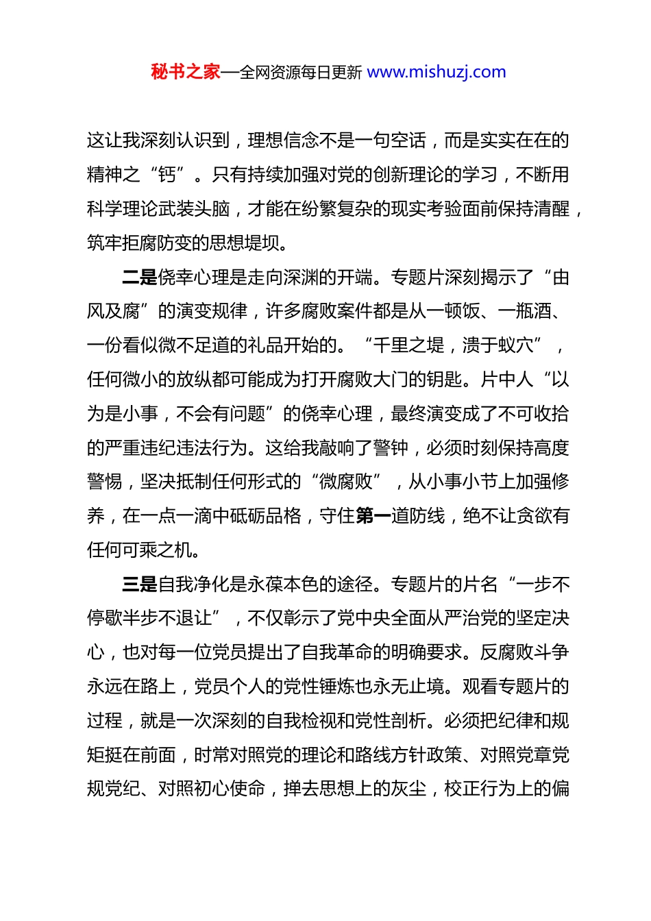 秘书之家—全网资源每日更新 www.mishuzj.com观看反腐专题片《一步不停歇半步不退让》心得体会 近日,按照党支部的统一安排,我集中观看了年度反腐专题片《一步不停歇半步不退让》。这部由中央纪委国家监委精心制作的专题片,通过 12 个典型案例,以纪实的手法、详实的采访和深刻的剖析,将一个个曾经的领导干部如何从思想滑坡走向腐败深渊的轨迹清晰地展现在眼前。片中人声泪俱下的忏悔和办案人员振聋发聩的解读,给我带来了强烈的思想冲击和深刻的党性洗礼,引发了我对初心、敬畏与使命的深入思考。一、思想的“总开关”必须时刻拧紧专题片揭示了一个共同的规律,即所有腐败问题的根源,都始于理想信念的动摇和思想防线的崩溃。“总开关”一旦松动,腐化的病毒便会乘虚而入。这警示我,作为一名共产党员,必须把坚定理想信念作为终身课题,常修常炼,常悟常进。一是理想信念是抵御腐蚀的根本。片中不论是曾经主政一方的高级干部,还是身处要职的部门领导,他们走向堕落的起点,无一不是放松了理论学习,淡忘了初心使命,导致世界观、人生观、价值观发生扭曲。他们把党的培养和人民的信任异化为谋取私利的资本,最终在权力和利益的诱惑面前败下阵来。秘书之家—全网资源每日更新 www.mishuzj.com这让我深刻认识到,理想信念不是一句空话,而是实实在在的精神之“钙”。只有持续加强对党的创新理论的学习,不断用科学理论武装头脑,才能在纷繁复杂的现实考验面前保持清醒,筑牢拒腐防变的思想堤坝。二是侥幸心理是走向深渊的开端。专题片深刻揭示了“由风及腐”的演变规律,许多腐败案件都是从一顿饭、一瓶酒、一份看似微不足道的礼品开始的。“千里之堤,溃于蚁穴”,任何微小的放纵都可能成为打开腐败大门的钥匙。片中人“以为是小事,不会有问题”的侥幸心理,最终演变成了不可收拾的严重违纪违法行为。这给我敲响了警钟,必须时刻保持高度警惕,坚决抵制任何形式的“微腐败”,从小事小节上加强修养,在一点一滴中砥砺品格,守住第一道防线,绝不让贪欲有任何可乘之机。三是自我净化是永葆本色的途径。专题片的片名“一步不停歇半步不退让”,不仅彰示了党中央全面从严治党的坚定决心,也对每一位党员提出了自我革命的明确要求。反腐败斗争永远在路上,党员个人的党性锤炼也永无止境。观看专题片的过程,就是一次深刻的自我检视和党性剖析。必须把纪律和规矩挺在前面,时常对照党的理论和路线方针政策、对照党章党规党纪、对照初心使命,掸去思想上的灰尘,校正行为上的偏秘书之家—全网资源每日更新 www.mishuzj.com差,始终保持共产党员的政治本色。二、行为的“警戒线”必须时刻清晰作为一名在国有企业工作的普通党员,虽然岗位平凡,但同样身处社会经济活动之中,面临着各种考验。专题片中的案例,就像一面面镜子,映照出现实中的风险与挑战,警示我必须时刻绷紧纪律之弦,明确行为边界,做到心有所畏、言有所戒、行有所止。一是必须正确对待手中的职责。国有企业的每一份资源都属于国家和人民,每一个岗位都承载着一份沉甸甸的责任。片中一些干部将公权力视为“私有品”,搞政商勾连,进行利益输送,最终害人害己,也给党和国家事业造成巨大损失。这使我警醒,无论在任何岗位,都必须牢固树树立正确的权力观,清醒地认识到职责是为公服务的平台,而非谋取私利的工具。要始终坚持原则、秉公办事,在日常工作中,严格遵守各项规章制度,确保经手的每一项工作都经得起检验。二是必须净化“八小时以外”的生活。专题片中多起案例都与“小圈子”“酒局饭局”有关,违纪违法行为往往发生在“八小时以外”的社交圈、生活圈、朋友圈。这些所谓的“朋友”,看中的并非个人情谊,而是党员干部身份背后的潜在利益。必须从中汲取深刻教训,对个人生活作风问题保持高度警秘书之家—全网资源每日更新 www.mishuzj.com觉,坚持交往有原则、有界线、有规矩,自觉抵制不良诱惑,培育积极健康的生活情趣,坚决不与别有用心之人攀附交往,守护好家庭的廉洁与幸福。三是必须以清风正气守护事业发展。我所在的**单位,承担着重要的社会责任。正如片中反复强调的,风清气正的政治生态是事...