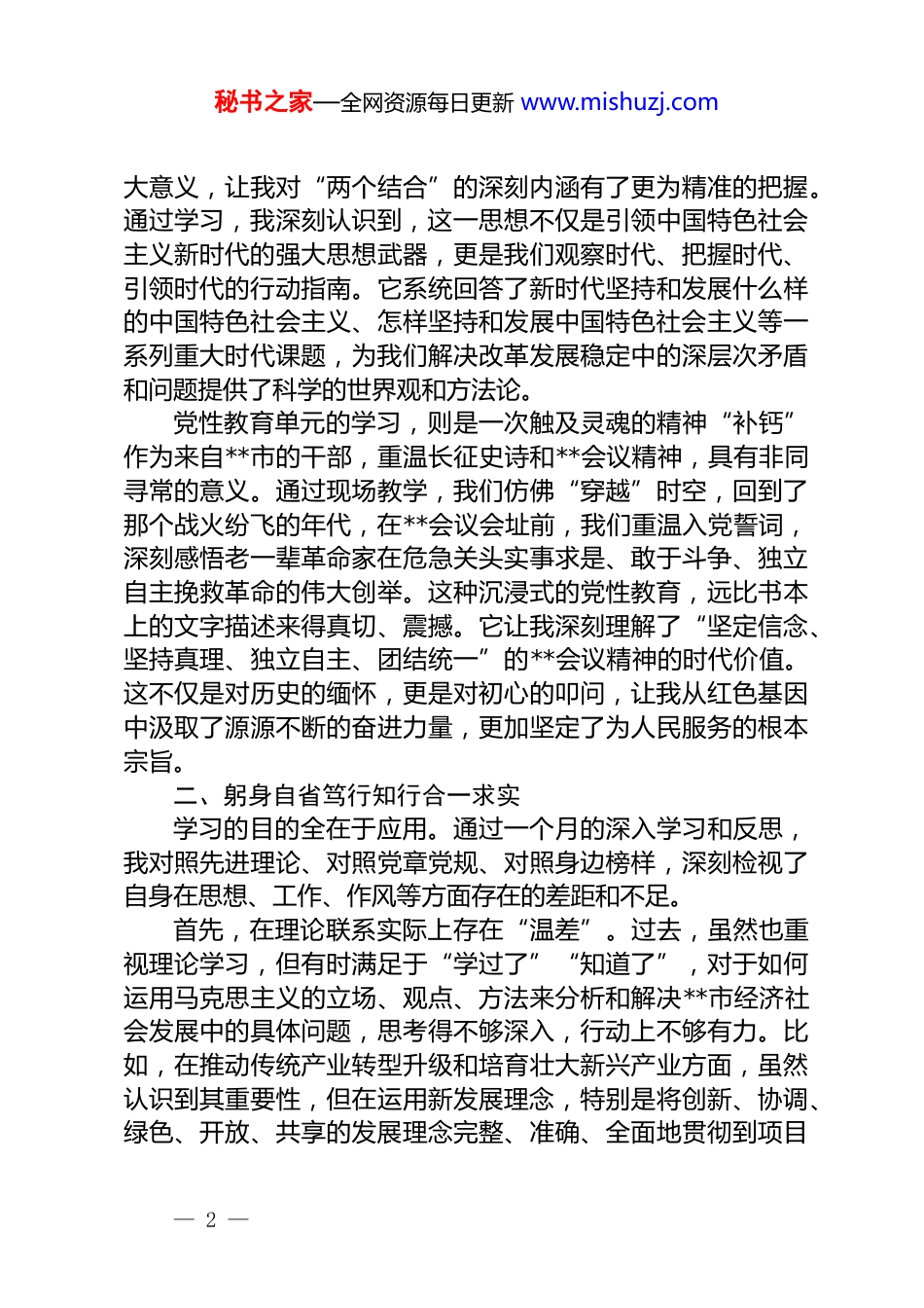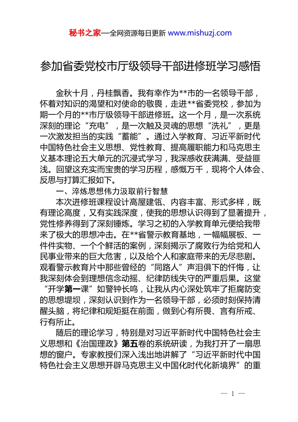 秘书之家—全网资源每日更新 www.mishuzj.com参加省委党校市厅级领导干部进修班学习感悟金秋十月,丹桂飘香。我有幸作为**市的一名领导干部,怀着对知识的渴望和对使命的敬畏,走进**省委党校,参加为期一个月的**市厅级领导干部进修班。这一个月,是一次系统深刻的理论“充电”,是一次触及灵魂的思想“洗礼”,更是一次激发担当的实践“蓄能”。通过入学教育、习近平新时代中国特色社会主义思想、党性教育、提高履职能力和马克思主义基本理论五大单元的沉浸式学习,我深感收获满满、受益匪浅。回望这充实而宝贵的学习历程,感慨万千,现将个人体会、反思与打算汇报如下。一、淬炼思想伟力汲取前行智慧本次进修班课程设计高屋建瓴、内容丰富、形式多样,既有理论高度,又有实践深度,使我的思想认识得到了显著提升,党性修养得到了深刻锤炼。学习之初的入学教育单元便给我带来了极大的思想冲击。在**省警示教育基地,一幅幅展板、一件件实物、一个个鲜活的案例,深刻揭示了腐败行为给党和人民事业带来的巨大危害,以及给个人和家庭带来的无尽悲剧。观看警示教育片中那些曾经的“同路人”声泪俱下的忏悔,让我深刻体会到理想信念动摇、纪律防线失守的严重后果。这堂“开学第一课”如警钟长鸣,让我从内心深处筑牢了拒腐防变的思想堤坝,深刻认识到作为一名领导干部,必须时刻保持清醒头脑,将纪律和规矩挺在前面,做到心有所畏、言有所戒、行有所止。随后的理论学习,特别是对习近平新时代中国特色社会主义思想和《治国理政》第五卷的系统研读,为我打开了一扇思想的窗户。专家教授们深入浅出地讲解了“习近平新时代中国特色社会主义思想开辟马克思主义中国化时代化新境界”的重— 1 —秘书之家—全网资源每日更新 www.mishuzj.com大意义,让我对“两个结合”的深刻内涵有了更为精准的把握。通过学习,我深刻认识到,这一思想不仅是引领中国特色社会主义新时代的强大思想武器,更是我们观察时代、把握时代、引领时代的行动指南。它系统回答了新时代坚持和发展什么样的中国特色社会主义、怎样坚持和发展中国特色社会主义等一系列重大时代课题,为我们解决改革发展稳定中的深层次矛盾和问题提供了科学的世界观和方法论。党性教育单元的学习,则是一次触及灵魂的精神“补钙”作为来自**市的干部,重温长征史诗和**会议精神,具有非同寻常的意义。通过现场教学,我们仿佛“穿越”时空,回到了那个战火纷飞的年代,在**会议会址前,我们重温入党誓词,深刻感悟老一辈革命家在危急关头实事求是、敢于斗争、独立自主挽救革命的伟大创举。这种沉浸式的党性教育,远比书本上的文字描述来得真切、震撼。它让我深刻理解了“坚定信念、坚持真理、独立自主、团结统一”的**会议精神的时代价值。这不仅是对历史的缅怀,更是对初心的叩问,让我从红色基因中汲取了源源不断的奋进力量,更加坚定了为人民服务的根本宗旨。二、躬身自省笃行知行合一求实学习的目的全在于应用。通过一个月的深入学习和反思,我对照先进理论、对照党章党规、对照身边榜样,深刻检视了自身在思想、工作、作风等方面存在的差距和不足。首先,在理论联系实际上存在“温差”。过去,虽然也重视理论学习,但有时满足于“学过了”“知道了”,对于如何运用马克思主义的立场、观点、方法来分析和解决**市经济社会发展中的具体问题,思考得不够深入,行动上不够有力。比如,在推动传统产业转型升级和培育壮大新兴产业方面,虽然认识到其重要性,但在运用新发展理念,特别是将创新、协调、绿色、开放、共享的发展理念完整、准确、全面地贯彻到项目— 2 —秘书之家—全网资源每日更新 www.mishuzj.com谋划、政策制定和工作推进的全过程中,还存在一定的惯性思维和路径依赖。此次马克思主义基本理论单元的学习,让我重新认识到,只有真正掌握了辩证唯物主义和历史唯物主义这个“看家本领”,才能在复杂多变的形势面前保持战略定力,找到破解难题的“金钥匙”。其次,在深入基层调查研究上存在“偏差”。提高履职能力单元的课程,特别强调了调查研究的重要性,提倡“蹲下去看蚂蚁”的求实作风。反思自身,虽然也经常下基层,...