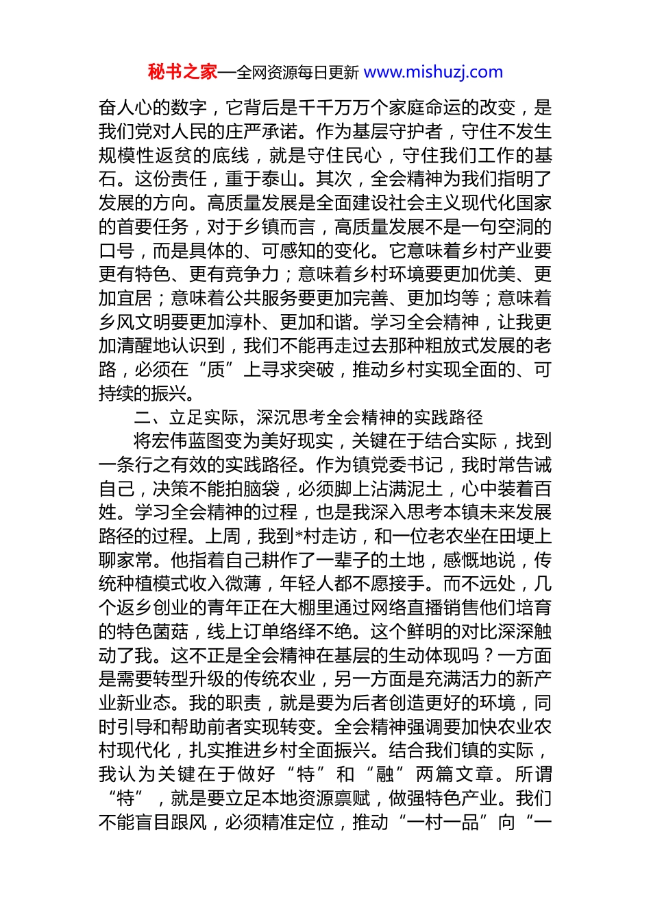 秘书之家—全网资源每日更新 www.mishuzj.com镇党委书记、四级调研员学习心得体会2025 年 10 月 20 日至 23 日,党的二十届四中全会在北京胜利召开这次会议系统擘画了“十五五”时期我国发展的宏伟蓝图,为我们基层工作者在新征程上奋勇前行指明了前进方向、提供了根本遵循。连日来,通过原原本本学、融会贯通悟,我心潮澎湃,既为国家未来的光明前景倍感振奋,也为自己肩上沉甸甸的责任与使命感到前所未有的紧迫。作为一名乡镇党委书记,我深知,学习领会全会精神,绝不能停留在口头上、止步于思想中,而必须将其转化为扎根基层、服务人民的实际行动。一、提高站位,深刻领悟全会精神的时代内涵深入学习党的二十届四中全会精神,是一次深刻的思想洗礼和党性锤炼。我的体会是,这种学习并非简单的知识输入,而是一个不断深化认知、提升站位的过程。全会站在党和国家事业发展全局的高度,为未来五年乃至更长时期谋篇布局,其意义之重大、影响之深远不言而喻。它标志着我国即将完成“十四五”规划,迈向 2035 年基本实现社会主义现代化的新征程,而“十五五”规划正是这一新征程上的第一个关键五年规划。在学习中,我反复思考,全会精神对于我们这样一个基层乡镇意味着什么?我的理解是,它首先要求我们在思想上与党中央的决策部署同频共振。全会强调坚持以人民为中心的发展思想,这与我们基层工作的出发点和落脚点完全契合。全会公报中关于巩固拓展脱贫攻坚成果的部署,让我感触尤为深刻。回望过去,我们镇的每一名干部都曾为了脱贫攻坚事业昼夜奋战,挨家挨户地落实政策。如今,国家历史性地解决了绝对贫困问题并建立了健全的防止返贫动态监测和帮扶机制,确保了未发生规模性返贫现象。全国脱贫劳动力务工规模稳定在 3300 万人以上的数据对我而言不仅仅是一个振秘书之家—全网资源每日更新 www.mishuzj.com奋人心的数字,它背后是千千万万个家庭命运的改变,是我们党对人民的庄严承诺。作为基层守护者,守住不发生规模性返贫的底线,就是守住民心,守住我们工作的基石。这份责任,重于泰山。其次,全会精神为我们指明了发展的方向。高质量发展是全面建设社会主义现代化国家的首要任务,对于乡镇而言,高质量发展不是一句空洞的口号,而是具体的、可感知的变化。它意味着乡村产业要更有特色、更有竞争力;意味着乡村环境要更加优美、更加宜居;意味着公共服务要更加完善、更加均等;意味着乡风文明要更加淳朴、更加和谐。学习全会精神,让我更加清醒地认识到,我们不能再走过去那种粗放式发展的老路,必须在“质”上寻求突破,推动乡村实现全面的、可持续的振兴。二、立足实际,深沉思考全会精神的实践路径将宏伟蓝图变为美好现实,关键在于结合实际,找到一条行之有效的实践路径。作为镇党委书记,我时常告诫自己,决策不能拍脑袋,必须脚上沾满泥土,心中装着百姓。学习全会精神的过程,也是我深入思考本镇未来发展路径的过程。上周,我到*村走访,和一位老农坐在田埂上聊家常。他指着自己耕作了一辈子的土地,感慨地说,传统种植模式收入微薄,年轻人都不愿接手。而不远处,几个返乡创业的青年正在大棚里通过网络直播销售他们培育的特色菌菇,线上订单络绎不绝。这个鲜明的对比深深触动了我。这不正是全会精神在基层的生动体现吗?一方面是需要转型升级的传统农业,另一方面是充满活力的新产业新业态。我的职责,就是要为后者创造更好的环境,同时引导和帮助前者实现转变。全会精神强调要加快农业农村现代化,扎实推进乡村全面振兴。结合我们镇的实际,我认为关键在于做好“特”和“融”两篇文章。所谓“特”,就是要立足本地资源禀赋,做强特色产业。我们不能盲目跟风,必须精准定位,推动“一村一品”向“一秘书之家—全网资源每日更新 www.mishuzj.com镇一业”集群化发展,延长产业链,提升附加值,打造属于我们自己的乡土品牌。所谓“融”,就是促进农文旅深度融合。如今,人们对乡村旅游的需求日益增长,我们要抓住机遇,将田园风光、农耕文化、特色民宿串联起来,发展采摘体验、研学旅游等项目,让乡村既有“烟火气”,又能催生“新经济”,让农民不仅能从土...