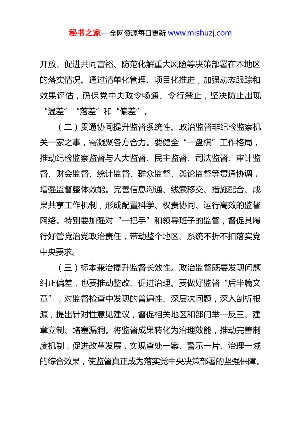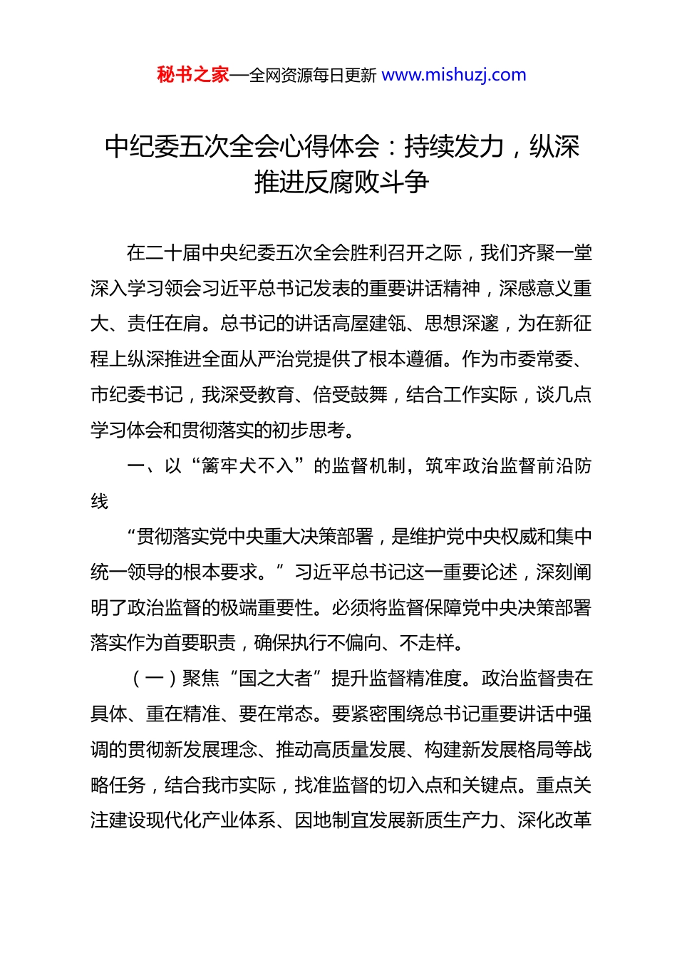 秘书之家—全网资源每日更新 www.mishuzj.com中纪委五次全会心得体会:持续发力,纵深推进反腐败斗争 在二十届中央纪委五次全会胜利召开之际,我们齐聚一堂深入学习领会习近平总书记发表的重要讲话精神,深感意义重大、责任在肩。总书记的讲话高屋建瓴、思想深邃,为在新征程上纵深推进全面从严治党提供了根本遵循。作为市委常委、市纪委书记,我深受教育、倍受鼓舞,结合工作实际,谈几点学习体会和贯彻落实的初步思考。一、以“篱牢犬不入”的监督机制,筑牢政治监督前沿防线“贯彻落实党中央重大决策部署,是维护党中央权威和集中统一领导的根本要求。”习近平总书记这一重要论述,深刻阐明了政治监督的极端重要性。必须将监督保障党中央决策部署落实作为首要职责,确保执行不偏向、不走样。(一)聚焦“国之大者”提升监督精准度。政治监督贵在具体、重在精准、要在常态。要紧密围绕总书记重要讲话中强调的贯彻新发展理念、推动高质量发展、构建新发展格局等战略任务,结合我市实际,找准监督的切入点和关键点。重点关注建设现代化产业体系、因地制宜发展新质生产力、深化改革秘书之家—全网资源每日更新 www.mishuzj.com开放、促进共同富裕、防范化解重大风险等决策部署在本地区的落实情况。通过清单化管理、项目化推进,加强动态跟踪和效果评估,确保党中央政令畅通、令行禁止,坚决防止出现“温差”“落差”和“偏差”。(二)贯通协同提升监督系统性。政治监督非纪检监察机关一家之事,需凝聚各方合力。要健全“一盘棋”工作格局,推动纪检监察监督与人大监督、民主监督、司法监督、审计监督、财会监督、统计监督、群众监督、舆论监督等贯通协调,增强监督整体效能。完善信息沟通、线索移交、措施配合、成果共享工作机制,形成配置科学、权责协同、运行高效的监督网络。特别要加强对“一把手”和领导班子的监督,督促其履行好管党治党政治责任,带动整个地区、系统不折不扣落实党中央要求。(三)标本兼治提升监督长效性。政治监督既要发现问题纠正偏差,也要推动整改、促进治理。要做好监督“后半篇文章”,对监督检查中发现的普遍性、深层次问题,深入剖析根源,提出针对性意见建议,督促相关地区和部门举一反三、建章立制、堵塞漏洞。将监督成果转化为治理效能,推动完善制度机制,促进改革发展,实现查处一案、警示一片、治理一域的综合效果,使监督真正成为落实党中央决策部署的坚强保障。秘书之家—全网资源每日更新 www.mishuzj.com二、以“矩不正不可为方”的制度铁笼,规范权力运行阳光轨道“把权力关进制度笼子,是新时代全面从严治党的一项重要任务。”习近平总书记这一形象比喻,揭示了制约和监督权力的核心要义。必须聚焦权力运行的关键环节,织密制度网络,强化刚性约束。(一)健全完善权力配置制约机制。科学配置权力是规范运行的前提。要围绕权力运行全过程,明晰权力边界,优化权力结构,做到权责法定、权责透明。重点针对政策制定、审批监管、执法司法、工程建设、资源开发、金融信贷、公共资源交易等权力集中、资金密集、资源富集的重点领域和关键岗位,查找制度空白和模糊地带,及时修订完善相关法规制度,减少自由裁量空间,确保权力在既定轨道上运行,从源头上防范权力失控、行为失范。(二)强化制度执行的刚性约束。“制度不在多,而在于精,在于务实管用,突出针对性和指导性。”要坚持制度面前人人平等、执行制度没有例外,让铁规发力、禁令生威。加大对制度执行情况的监督检查力度,对随意变通、恶意规避、破坏制度的行为,发现一起、查处一起,坚决维护制度的严肃性和权威性。领导干部特别是“一把手”要带头学习制度、严格秘书之家—全网资源每日更新 www.mishuzj.com执行制度、自觉维护制度,以上率下,形成尊崇制度、遵守制度、捍卫制度的良好氛围。(三)推动权力在阳光下透明运行。公开是最好的防腐剂。要深入推进党务、政务、司法和各领域办事公开,建立权力运行可查询、可追溯的反馈机制。善于运用信息化手段,依托大数据、人工智能等科技赋能,建设公权力大数据监督平台,实现权力运行全程电子化、留痕化、可追溯,让暗箱操作失...