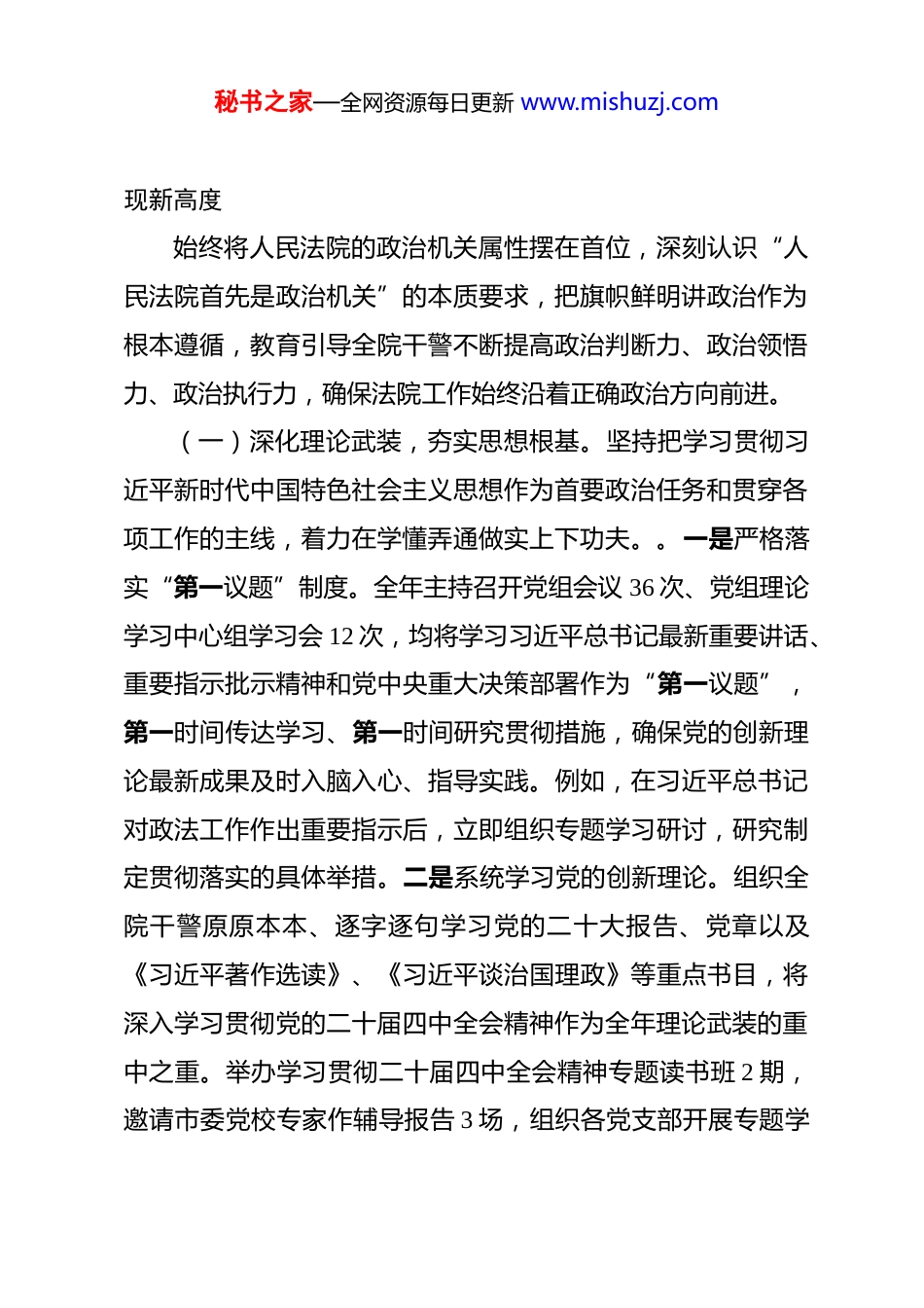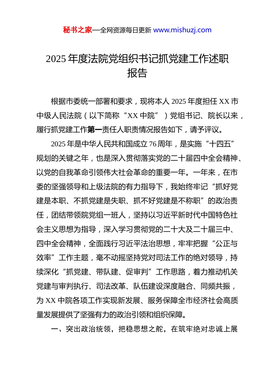 秘书之家—全网资源每日更新 www.mishuzj.com2025 年度法院党组织书记抓党建工作述职报告 根据市委统一部署和要求,现将本人 2025 年度担任 XX 市中级人民法院(以下简称“XX 中院”)党组书记、院长以来,履行抓党建工作第一责任人职责情况报告如下,请予评议。2025 年是中华人民共和国成立 76 周年,是实施“十四五”规划的关键之年,也是深入贯彻落实党的二十届四中全会精神、以党的自我革命引领伟大社会革命的重要一年。一年来,在市委的坚强领导和上级法院的有力指导下,我始终牢记“抓好党建是本职、不抓党建是失职、抓不好党建是不称职”的政治责任,团结带领院党组一班人,坚持以习近平新时代中国特色社会主义思想为指导,深入学习贯彻党的二十大及二十届三中、四中全会精神,全面践行习近平法治思想,牢牢把握“公正与效率”工作主题,毫不动摇坚持党对司法工作的绝对领导,持续深化“抓党建、带队建、促审判”工作思路,着力推动机关党建与审判执行、司法改革、队伍建设深度融合、同频共振,为 XX 中院各项工作实现新发展、服务保障全市经济社会高质量发展提供了坚强有力的政治引领和组织保障。一、突出政治统领,把稳思想之舵,在筑牢绝对忠诚上展秘书之家—全网资源每日更新 www.mishuzj.com现新高度始终将人民法院的政治机关属性摆在首位,深刻认识“人民法院首先是政治机关”的本质要求,把旗帜鲜明讲政治作为根本遵循,教育引导全院干警不断提高政治判断力、政治领悟力、政治执行力,确保法院工作始终沿着正确政治方向前进。(一)深化理论武装,夯实思想根基。坚持把学习贯彻习近平新时代中国特色社会主义思想作为首要政治任务和贯穿各项工作的主线,着力在学懂弄通做实上下功夫。。一是严格落实“第一议题”制度。全年主持召开党组会议 36 次、党组理论学习中心组学习会 12 次,均将学习习近平总书记最新重要讲话、重要指示批示精神和党中央重大决策部署作为“第一议题”,第一时间传达学习、第一时间研究贯彻措施,确保党的创新理论最新成果及时入脑入心、指导实践。例如,在习近平总书记对政法工作作出重要指示后,立即组织专题学习研讨,研究制定贯彻落实的具体举措。二是系统学习党的创新理论。组织全院干警原原本本、逐字逐句学习党的二十大报告、党章以及《习近平著作选读》、《习近平谈治国理政》等重点书目,将深入学习贯彻党的二十届四中全会精神作为全年理论武装的重中之重。举办学习贯彻二十届四中全会精神专题读书班 2 期,邀请市委党校专家作辅导报告 3 场,组织各党支部开展专题学秘书之家—全网资源每日更新 www.mishuzj.com习研讨 80 余次,引导干警深刻把握党中央关于推进中国式现代化、发展新质生产力、全面依法治国等重大战略部署,自觉用以武装头脑、指导实践、推动工作。三是强化理想信念教育。结合庆祝新中国成立 76 周年等重要节点,组织开展“传承红色基因、践行司法为民”系列主题党日活动,组织干警赴红色教育基地参观学习 4 批次,观看革命历史题材影片、话剧 6 场,重温入党誓词、入额誓词活动 2 次。扎实开展党史学习教育常态化长效化工作,教育引导干警从党的百年奋斗历程中汲取智慧和力量,坚定理想信念,筑牢信仰之基。(二)严明政治纪律,恪守政治规矩。始终将政治纪律和政治规矩挺在前面,确保党中央决策部署和市委工作要求在法院不折不扣贯彻执行。一是严肃党内政治生活。带头严格执行《关于新形势下党内政治生活的若干准则》,认真落实“三会一课”、民主生活会、组织生活会、民主评议党员、谈心谈话等制度。高质量召开年度民主生活会和专题组织生活会,带头开展批评和自我批评,主动查摆问题,深刻剖析根源。全年以普通党员身份参加所在支部组织生活 12 次,与班子成员、中层干部、青年干警等开展谈心谈话 60 余人次。二是坚决落实请示报告制度。对涉及法院工作的重大事项、重要情况、敏感案件以及个人有关事项,均严格按照规定程序和要求,及时、如实秘书之家—全网资源每日更新 www.mishuzj.com向市委、上级法院请示报告,确保政令畅通、令行禁止。全年向市委、市委政法委书面报...