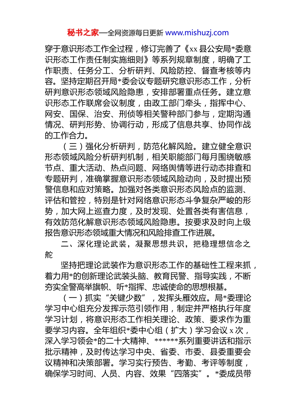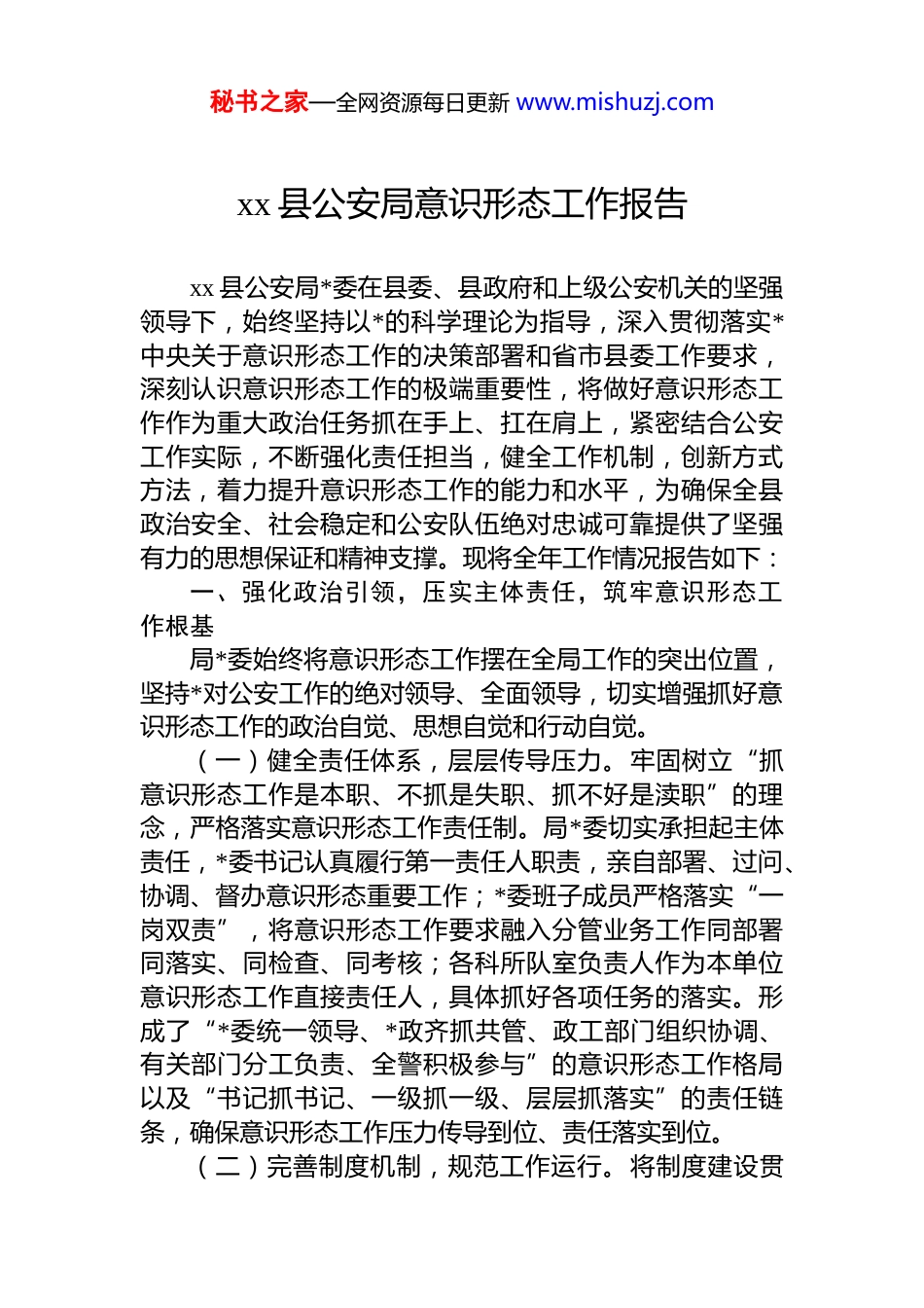 秘书之家—全网资源每日更新 www.mishuzj.comxx 县公安局意识形态工作报告xx 县公安局*委在县委、县政府和上级公安机关的坚强领导下,始终坚持以*的科学理论为指导,深入贯彻落实*中央关于意识形态工作的决策部署和省市县委工作要求,深刻认识意识形态工作的极端重要性,将做好意识形态工作作为重大政治任务抓在手上、扛在肩上,紧密结合公安工作实际,不断强化责任担当,健全工作机制,创新方式方法,着力提升意识形态工作的能力和水平,为确保全县政治安全、社会稳定和公安队伍绝对忠诚可靠提供了坚强有力的思想保证和精神支撑。现将全年工作情况报告如下:一、强化政治引领,压实主体责任,筑牢意识形态工作根基局*委始终将意识形态工作摆在全局工作的突出位置,坚持*对公安工作的绝对领导、全面领导,切实增强抓好意识形态工作的政治自觉、思想自觉和行动自觉。(一)健全责任体系,层层传导压力。牢固树立“抓意识形态工作是本职、不抓是失职、抓不好是渎职”的理念,严格落实意识形态工作责任制。局*委切实承担起主体责任,*委书记认真履行第一责任人职责,亲自部署、过问、协调、督办意识形态重要工作;*委班子成员严格落实“一岗双责”,将意识形态工作要求融入分管业务工作同部署同落实、同检查、同考核;各科所队室负责人作为本单位意识形态工作直接责任人,具体抓好各项任务的落实。形成了“*委统一领导、*政齐抓共管、政工部门组织协调、有关部门分工负责、全警积极参与”的意识形态工作格局以及“书记抓书记、一级抓一级、层层抓落实”的责任链条,确保意识形态工作压力传导到位、责任落实到位。(二)完善制度机制,规范工作运行。将制度建设贯秘书之家—全网资源每日更新 www.mishuzj.com穿于意识形态工作全过程,修订完善了《xx 县公安局*委意识形态工作责任制实施细则》等系列规章制度,明确了工作职责、任务分工、分析研判、风险防控、督查考核等内容。坚持定期召开局*委会议专题研究意识形态工作,分析研判意识形态领域风险隐患,安排部署重点任务。建立意识形态工作联席会议制度,由政工部门牵头,指挥中心、网安、国保、治安、刑侦等相关警种部门参与,定期沟通情况、研判形势、协调行动,形成了信息共享、协同作战的工作合力。(三)强化分析研判,防范化解风险。建立健全意识形态领域风险分析研判机制,相关职能部门每月围绕敏感节点、重大活动、热点问题、网络舆情等进行动态排查和专题研判,准确掌握意识形态领域风险动向,及时提出预警信息和应对策略。加强对各类意识形态风险点的监测、评估和管控,特别是针对网络意识形态斗争复杂严峻的形势,加大网上巡查力度,及时发现、处置各类有害信息,有效防范化解意识形态领域风险隐患。按要求及时向上级报告意识形态领域重大情况和风险排查工作进展。二、深化理论武装,凝聚思想共识,把稳理想信念之舵坚持把理论武装作为意识形态工作的基础性工程来抓,着力用*的创新理论武装头脑、教育民警、指导实践,不断夯实全警高举旗帜、听*指挥、忠诚使命的思想根基。(一)抓实“关键少数”,发挥头雁效应。局*委理论学习中心组充分发挥示范引领作用,制定并严格执行年度学习计划,将意识形态工作相关理论、政策、要求作为重要学习内容。全年组织*委中心组(扩大)学习会议 x 次,深入学习领会*的二十大精神、******系列重要讲话和指示批示精神,及时传达学习中央、省委、市委、县委重要会议精神和决策部署。学习实行预告、考勤、考评等制度,确保学习时间、人员、内容、效果“四落实”。*委成员带秘书之家—全网资源每日更新 www.mishuzj.com头撰写学习心得、交流研讨,带头深入基层宣讲,为全警理论学习树立了标杆。(二)创新学习形式,提升学习实效。在坚持集体学习、个人自学等传统方式的基础上,积极探索“线上+线下”相结合的学习模式。充分利用“学习强国”、公安网络学院、微信读书平台等线上载体,推送学习资料,开展线上测试,搭建互动交流平台。线下通过专家辅导、领导授课、观看教育片、实地见学、知识竞赛、主题征文等多种形式,增强理论学习的吸引力和感染力。持续开展“领导干部上讲台”、...