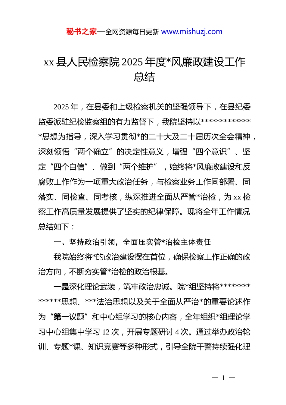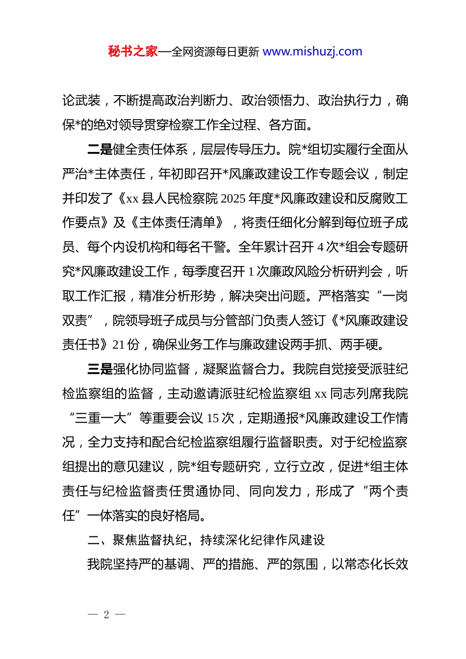 秘书之家—全网资源每日更新 www.mishuzj.comxx 县人民检察院 2025 年度*风廉政建设工作总结2025 年,在县委和上级检察机关的坚强领导下,在县纪委监委派驻纪检监察组的有力监督下,我院坚持以**************思想为指导,深入学习贯彻*的二十大及二十届历次全会精神,深刻领悟“两个确立”的决定性意义,增强“四个意识”、坚定“四个自信”、做到“两个维护”,始终将*风廉政建设和反腐败工作作为一项重大政治任务,与检察业务工作同部署、同落实、同检查、同考核,纵深推进全面从严管*治检,为 xx 检察工作高质量发展提供了坚实的纪律保障。现将全年工作情况总结如下:一、坚持政治引领,全面压实管*治检主体责任我院始终将*的政治建设摆在首位,确保检察工作正确的政治方向,不断夯实管*治检的政治根基。一是深化理论武装,筑牢政治忠诚。院*组坚持将**************思想、***法治思想以及关于全面从严治*的重要论述作为“第一议题”和中心组学习的核心内容,全年组织*组理论学习中心组集中学习 12 次,开展专题研讨 4 次。通过举办政治轮训、专题*课、知识竞赛等多种形式,引导全院干警持续强化理— 1 —秘书之家—全网资源每日更新 www.mishuzj.com论武装,不断提高政治判断力、政治领悟力、政治执行力,确保*的绝对领导贯穿检察工作全过程、各方面。二是健全责任体系,层层传导压力。院*组切实履行全面从严治*主体责任,年初即召开*风廉政建设工作专题会议,制定并印发了《xx 县人民检察院 2025 年度*风廉政建设和反腐败工作要点》及《主体责任清单》,将责任细化分解到每位班子成员、每个内设机构和每名干警。全年累计召开 4 次*组会专题研究*风廉政建设工作,每季度召开 1 次廉政风险分析研判会,听取工作汇报,精准分析形势,解决突出问题。严格落实“一岗双责”,院领导班子成员与分管部门负责人签订《*风廉政建设责任书》21 份,确保业务工作与廉政建设两手抓、两手硬。三是强化协同监督,凝聚监督合力。我院自觉接受派驻纪检监察组的监督,主动邀请派驻纪检监察组 xx 同志列席我院“三重一大”等重要会议 15 次,定期通报*风廉政建设工作情况,全力支持和配合纪检监察组履行监督职责。对于纪检监察组提出的意见建议,院*组专题研究,立行立改,促进*组主体责任与纪检监督责任贯通协同、同向发力,形成了“两个责任”一体落实的良好格局。二、聚焦监督执纪,持续深化纪律作风建设我院坚持严的基调、严的措施、严的氛围,以常态化长效— 2 —秘书之家—全网资源每日更新 www.mishuzj.com化机制推进纪律作风建设走深走实。一是常态化开展 dj 学习教育。将*章*规 dj 作为干警日常学习的必修课,通过“三会一课”、主题*日、青年理论学习小组等载体,组织全院干警深入学习《中国共产 dj 律处分条例》等*内法规。全年组织开展*规 dj 知识测试 2 次,参考率和优秀率均达到 100%,有效引导干警学纪、知纪、明纪、守纪,将纪律规矩内化于心、外化于行。二是多维度开展警示教育。坚持以案为鉴、以案明纪,用“身边事”警醒“身边人”。全年组织集中观看《歧路》《代价》等警示教育片 6 部,邀请县纪委监委专家进行廉政专题辅导授课 2 次,组织全院干警参观 xx 州廉政教育基地,通过鲜活案例和沉浸式体验,让干警身临其境感受腐败行为的巨大危害。在重要节点,如元旦、春节、五一、国庆等节假日前,通过发送廉洁提醒短信、召开节前廉政提醒会等方式,重申纪律要求,打好“预防针”,严防“节日病”,确保廉洁过节。三是驰而不息纠治“四风”。严格执行中央八项规定及其实施细则精神,紧盯形式主义、官僚主义新动向新表现,对文山会海、检查考核过多过滥等问题进行专项整治,精简会议文件数量超过 20%。加强对公务接待、公车使用、津贴补贴发放等情况的监督检查,全年未发生一起违规违纪问题。大力弘扬— 3 —秘书之家—全网资源每日更新 www.mishuzj.com“马上就办、真抓实干”的工作作风,教育引导干警树立正确的权力观、政绩观,切实为基层减负,提升检察工作质效。三、健全防控体系,规范检察权运行监督制约我院坚持问题导向...