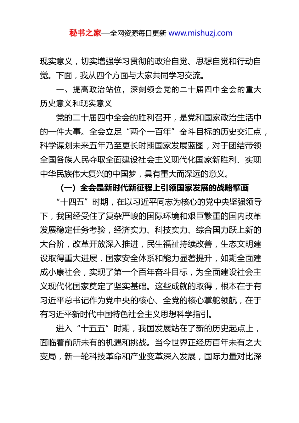 秘书之家—全网资源每日更新 www.mishuzj.com深学笃行党的二十届四中全会精神奋力谱写中国式现代化 XX 公安新篇章市公安局局长学习贯彻党的二十届四中全会精神宣讲稿同志们:根据市委统一部署要求,今天我们召开全市公安机关学习贯彻党的二十届四中全会精神专题宣讲报告会。这次会议的主要任务是,深入学习领会党的二十届四中全会精神,全面贯彻落实市委工作要求,结合 XX 公安工作实际,对全市公安机关学习宣传贯彻工作进行再动员、再部署、再深化,引导全体民警辅警切实把思想和行动统一到全会精神上来,把智慧和力量凝聚到实现全会确定的各项目标任务上来,以更加坚定的信念、更加务实的举措、更加过硬的作风,奋力开创 XX 公安工作高质量发展新局面,为奋力书写中国式现代化 XX 答卷贡献更大公安力量。党的二十届四中全会是在我国全面建设社会主义现代化国家新征程的关键时期召开的一次十分重要的会议。全会审议通过的《中共中央关于制定国民经济和社会发展第十五个五年规划和二〇三五年远景目标的建议》,是指导今后五年乃至更长时期我国经济社会发展的纲领性文件,为我们指明了前进方向、提供了根本遵循。公安机关作为党和人民手中的“刀把子”,必须站在政治和全局的高度,深刻认识全会的重大历史意义和秘书之家—全网资源每日更新 www.mishuzj.com现实意义,切实增强学习贯彻的政治自觉、思想自觉和行动自觉。下面,我从四个方面与大家共同学习交流。一、提高政治站位,深刻领会党的二十届四中全会的重大历史意义和现实意义党的二十届四中全会的胜利召开,是党和国家政治生活中的一件大事。全会立足“两个一百年”奋斗目标的历史交汇点,科学谋划未来五年乃至更长时期国家发展蓝图,对于团结带领全国各族人民夺取全面建设社会主义现代化国家新胜利、实现中华民族伟大复兴的中国梦,具有重大而深远的意义。(一)全会是新时代新征程上引领国家发展的战略擘画“十四五”时期,在以习近平同志为核心的党中央坚强领导下,我国经受住了复杂严峻的国际环境和艰巨繁重的国内改革发展稳定任务考验,经济实力、科技实力、综合国力跃上新的大台阶,改革开放深入推进,民生福祉持续改善,生态文明建设取得重大进展,国家安全体系和能力显著提升,如期全面建成小康社会,实现了第一个百年奋斗目标,为全面建设社会主义现代化国家奠定了坚实基础。这些成就的取得,根本在于有习近平总书记作为党中央的核心、全党的核心掌舵领航,在于有习近平新时代中国特色社会主义思想科学指引。进入“十五五”时期,我国发展站在了新的历史起点上,面临着前所未有的机遇和挑战。当今世界正经历百年未有之大变局,新一轮科技革命和产业变革深入发展,国际力量对比深秘书之家—全网资源每日更新 www.mishuzj.com刻调整,和平与发展仍是时代主题,但霸权主义、强权政治抬头,单边主义、保护主义蔓延,全球治理体系面临深刻变革。国内方面,我国经济转向高质量发展阶段,发展不平衡不充分问题仍然突出,科技创新能力有待进一步提升,民生领域还有不少短板,社会治理面临新的课题。党的二十届四中全会准确把握我国发展的阶段性特征,科学制定“十五五”规划和二〇三五年远景目标,明确了未来发展的指导思想、主要目标、重点任务和重大举措,为我们应对风险挑战、抢抓发展机遇、实现高质量发展提供了行动纲领。(二)全会为新时代公安工作高质量发展指明了前进方向公安工作是党和国家工作的重要组成部分,事关国家安全社会稳定、人民安宁。党的二十届四中全会对统筹发展和安全、推进法治中国建设、提升社会治理现代化水平等作出了全面部署,这些部署与公安工作密切相关,为我们明确了工作重点和努力方向。从安全维度看,全会强调“统筹发展和安全,建设更高水平的平安中国”,要求“坚持总体国家安全观,把安全发展贯穿国家发展各领域和全过程,防范和化解影响我国现代化进程的各种风险”。这要求公安机关必须始终把维护国家安全置于首位,坚决防范化解各类政治安全风险,严厉打击各类违法犯罪活动,全力维护社会大局持续稳定,为经济社会高质量发展创造安全稳定的政治社会环境。秘书之家—全网...