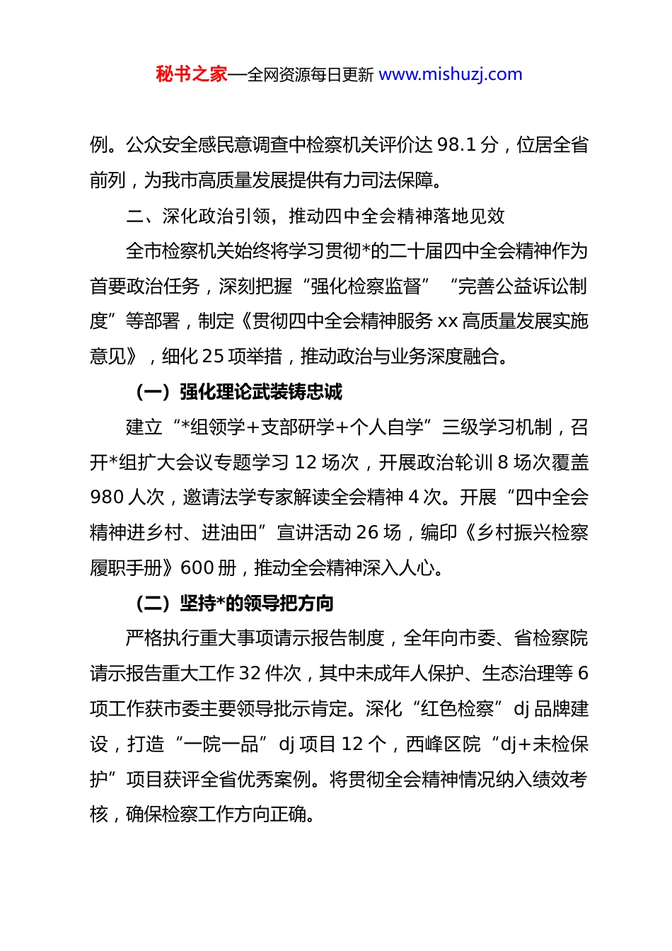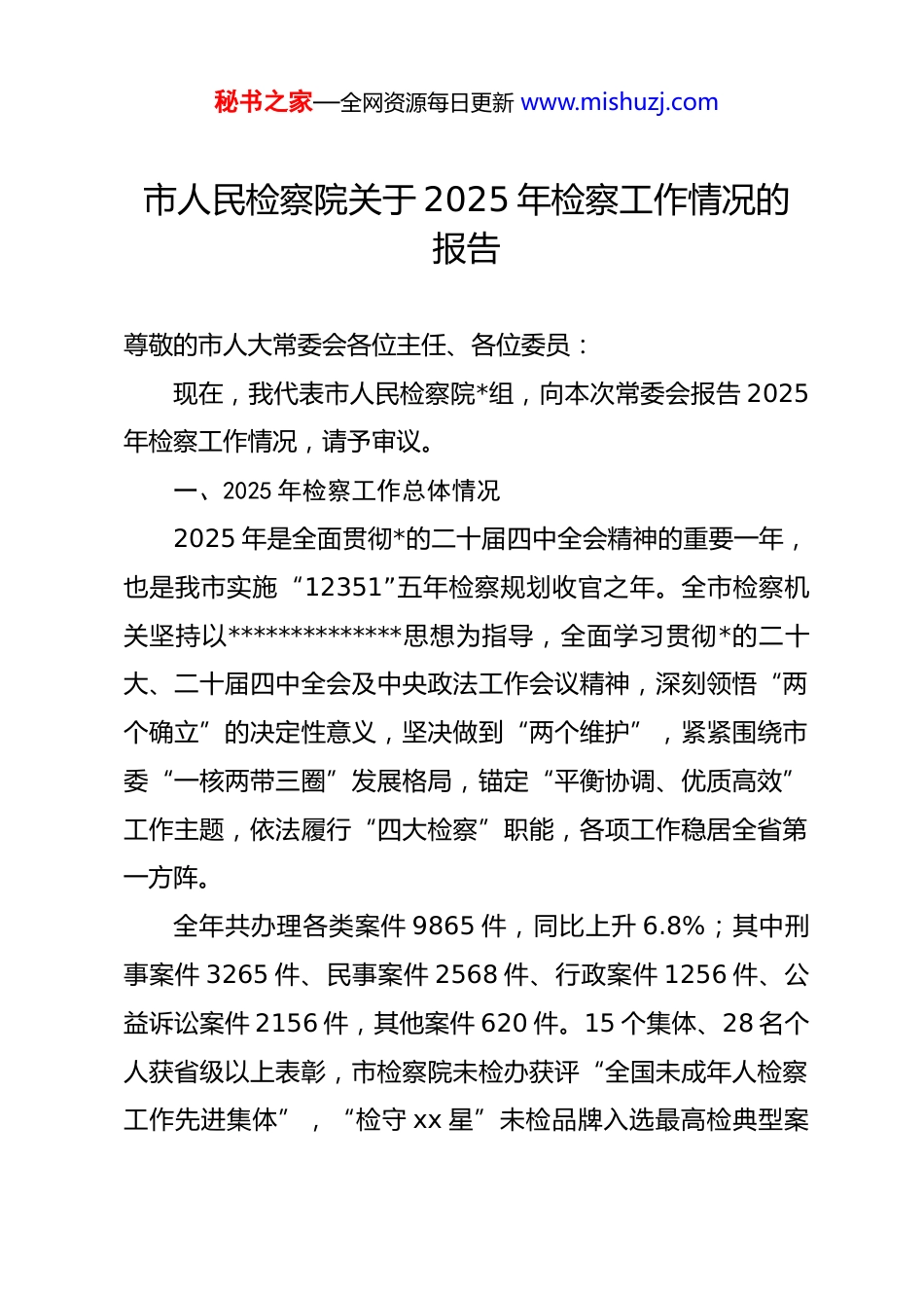 秘书之家—全网资源每日更新 www.mishuzj.com市人民检察院关于 2025 年检察工作情况的报告尊敬的市人大常委会各位主任、各位委员:现在,我代表市人民检察院*组,向本次常委会报告 2025年检察工作情况,请予审议。一、2025 年检察工作总体情况2025 年是全面贯彻*的二十届四中全会精神的重要一年,也是我市实施“12351”五年检察规划收官之年。全市检察机关坚持以**************思想为指导,全面学习贯彻*的二十大、二十届四中全会及中央政法工作会议精神,深刻领悟“两个确立”的决定性意义,坚决做到“两个维护”,紧紧围绕市委“一核两带三圈”发展格局,锚定“平衡协调、优质高效”工作主题,依法履行“四大检察”职能,各项工作稳居全省第一方阵。全年共办理各类案件 9865 件,同比上升 6.8%;其中刑事案件 3265 件、民事案件 2568 件、行政案件 1256 件、公益诉讼案件 2156 件,其他案件 620 件。15 个集体、28 名个人获省级以上表彰,市检察院未检办获评“全国未成年人检察工作先进集体”,“检守 xx 星”未检品牌入选最高检典型案秘书之家—全网资源每日更新 www.mishuzj.com例。公众安全感民意调查中检察机关评价达 98.1 分,位居全省前列,为我市高质量发展提供有力司法保障。二、深化政治引领,推动四中全会精神落地见效全市检察机关始终将学习贯彻*的二十届四中全会精神作为首要政治任务,深刻把握“强化检察监督”“完善公益诉讼制度”等部署,制定《贯彻四中全会精神服务 xx 高质量发展实施意见》,细化 25 项举措,推动政治与业务深度融合。(一)强化理论武装铸忠诚建立“*组领学+支部研学+个人自学”三级学习机制,召开*组扩大会议专题学习 12 场次,开展政治轮训 8 场次覆盖980 人次,邀请法学专家解读全会精神 4 次。开展“四中全会精神进乡村、进油田”宣讲活动 26 场,编印《乡村振兴检察履职手册》600 册,推动全会精神深入人心。(二)坚持*的领导把方向严格执行重大事项请示报告制度,全年向市委、省检察院请示报告重大工作 32 件次,其中未成年人保护、生态治理等 6项工作获市委主要领导批示肯定。深化“红色检察”dj 品牌建设,打造“一院一品”dj 项目 12 个,西峰区院“dj+未检保护”项目获评全省优秀案例。将贯彻全会精神情况纳入绩效考核,确保检察工作方向正确。秘书之家—全网资源每日更新 www.mishuzj.com(三)服务大局显担当聚焦我市“产业强市、生态立市”战略,制定《服务保障石油化工产业高质量发展十项措施》。深化数字检察建设,研发“刑事一审裁判法律监督”“未成年人保护预警”等 4 个大数据模型,其中“刑事一审裁判法律监督模型”被最高检推广,累计发现监督线索 86 条,纠正裁判不当案件 28 件。三、聚焦主责主业,以高质效履职服务发展大局(一)坚决维护安全稳定,建设更高水平平安 xx1. 严惩严重刑事犯罪。全面贯彻总体国家安全观,起诉严重暴力犯罪 156 人;常态化开展扫黑除恶,办理涉黑涉恶案件8 件 32 人,一体推进“破网打伞”,查封扣押冻结涉案资产1.2 亿元。深入开展打击电信网络诈骗专项行动,起诉相关犯罪 326 人,追赃挽损 1.8 亿元,成功办理“2·16”跨境电诈案,挽回群众损失 6800 万元。2. 精准打击突出犯罪。聚焦能源安全,起诉破坏石油设施、非法采矿等犯罪 68 人,办理的“某团伙盗窃原油案”入选全省刑事检察典型案例;聚焦民生安全,起诉危害食品药品安全犯罪 45 人,挂牌督办制售假农资案等重大案件 5 件,推动开展行业专项整治 3 次。3. 化解社会矛盾纠纷。落实宽严相济刑事政策,不批准逮秘书之家—全网资源每日更新 www.mishuzj.com捕 865 人、不起诉 728 人,认罪认罚从宽适用率达 90.8%。畅通群众信访渠道,化解长期未结信访案件 18 件,办理司法救助案件 216 件,发放救助金 580 万元,建立“检察+民政+乡村振兴”救助机制,帮助 42 名困难群众脱困。(二)服务高质量发展,优化法治化营商环境1. 平等保护市场主体。起诉侵害企业产权犯罪 216 人,建立涉企案件“少捕慎诉慎押”清单,对 32 家涉案...
