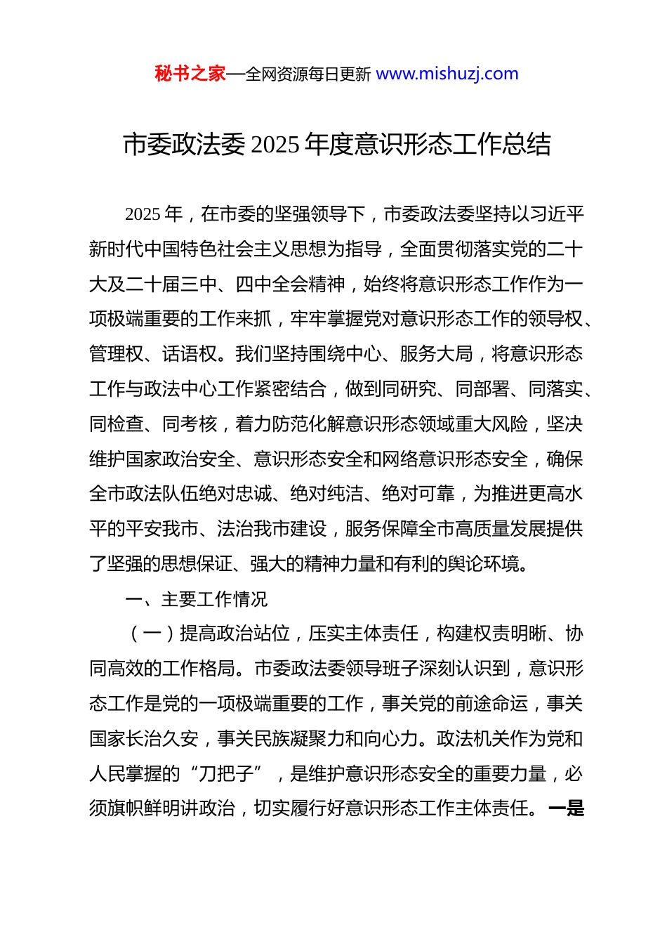 秘书之家—全网资源每日更新 www.mishuzj.com市委政法委 2025 年度意识形态工作总结 2025 年,在市委的坚强领导下,市委政法委坚持以习近平新时代中国特色社会主义思想为指导,全面贯彻落实党的二十大及二十届三中、四中全会精神,始终将意识形态工作作为一项极端重要的工作来抓,牢牢掌握党对意识形态工作的领导权、管理权、话语权。我们坚持围绕中心、服务大局,将意识形态工作与政法中心工作紧密结合,做到同研究、同部署、同落实、同检查、同考核,着力防范化解意识形态领域重大风险,坚决维护国家政治安全、意识形态安全和网络意识形态安全,确保全市政法队伍绝对忠诚、绝对纯洁、绝对可靠,为推进更高水平的平安我市、法治我市建设,服务保障全市高质量发展提供了坚强的思想保证、强大的精神力量和有利的舆论环境。一、主要工作情况(一)提高政治站位,压实主体责任,构建权责明晰、协同高效的工作格局。市委政法委领导班子深刻认识到,意识形态工作是党的一项极端重要的工作,事关党的前途命运,事关国家长治久安,事关民族凝聚力和向心力。政法机关作为党和人民掌握的“刀把子”,是维护意识形态安全的重要力量,必须旗帜鲜明讲政治,切实履行好意识形态工作主体责任。一是秘书之家—全网资源每日更新 www.mishuzj.com强化组织领导,健全责任体系。坚持和加强党对意识形态工作的全面领导。健全领导机构。调整充实市委政法委意识形态工作领导小组,由常务副书记担任组长,领导班子其他成员任副组长,相关内设机构负责人为成员。领导小组下设办公室,负责日常工作协调、督促检查和情况汇总。明确责任分工。严格落实意识形态工作责任制,明确领导班子对意识形态工作负全面领导责任,主要领导作为第一责任人,带头抓意识形态工作,带头管阵地、把导向、强队伍;领导班子其他成员根据工作分工,按照“一岗双责”要求,抓好分管科室和领域的意识形态工作。年初召开委务会,专题研究部署年度意识形态工作,制定印发《市委政法委 2025 年度意识形态工作要点及责任分工》,明确年度工作目标、重点任务、责任单位和完成时限,将责任分解压实到各支部、各科室,形成了“一把手”负总责、分管领导具体抓、机关党委牵头协调、各科室各负其责、齐抓共管的工作责任体系。纳入重要议程。坚持将意识形态工作作为向市委报告工作、领导班子民主生活会、年度述职述廉、干部考核评价的重要内容,定期分析研判意识形态领域情况,推动意识形态工作常态长效。二是完善制度机制,规范工作运行。注重以制度化、规范化建设保障意识形态工作责任落实。健全分析研判机制。每季度至少召开一次意识形态工作专题会议或领秘书之家—全网资源每日更新 www.mishuzj.com导小组会议,分析研判政法领域意识形态形势,特别是针对涉政治安全、社会稳定、司法执法、队伍建设等方面的风险点,进行深入研判,全年累计召开专题分析研判会*次,形成分析研判报告*份,提出针对性工作建议*条。健全督查考核机制。将意识形态工作责任制落实情况纳入委机关党建工作责任制考核、党支部书记述职评议考核、领导班子和领导干部年度考核的重要内容,加大权重。年内组织开展了*次专项督查,重点检查责任落实、阵地管理、理论学习、风险防范等方面情况,对发现的问题建立台账、督促整改,确保各项工作要求落到实处。健全责任追究机制。严格执行意识形态工作纪律,对意识形态领域出现苗头性、倾向性问题的科室和个人,及时进行提醒、约谈;对在意识形态工作中失职失责、造成不良影响的,依规依纪严肃问责,确保责任链条环环相扣、压力层层传导。(二)深化理论武装,筑牢信仰之基,用党的创新理论凝心铸魂。始终把用新时代中国特色社会主义思想武装头脑、指导实践、推动工作作为首要政治任务,教育引导全体干警筑牢信仰之基、补足精神之钙、把稳思想之舵。一是突出抓好“关键少数”学习。严格落实“第一议题”制度,及时跟进学习党中央最新精神、重要讲话和指示批示精神。坚持和完善理论学习中心组学习制度,制定年度学习计划,围绕党的二十大及二秘书之家—全网资源每日更新 www.mishuzj.com十届三中全会、四中全会精神和...