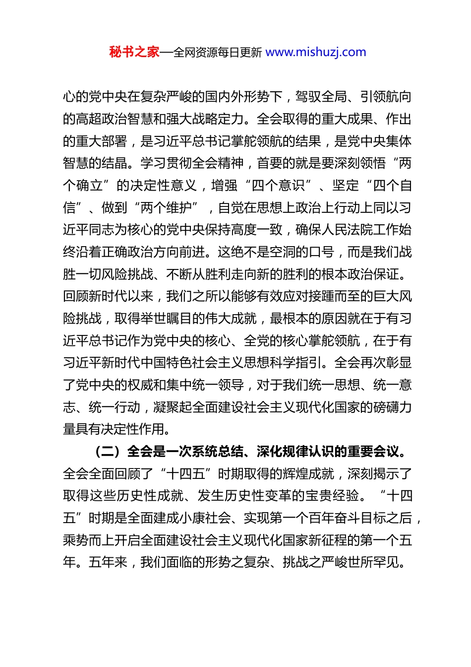秘书之家—全网资源每日更新 www.mishuzj.comXX 县法院院长关于党的二十届四中全会精神的宣讲稿同志们:今天,我们在这里隆重举行 XX 县人民法院学习贯彻党的二十届四中全会精神宣讲报告会。这次全会,是在我国迈上全面建设社会主义现代化国家新征程、向第二个百年奋斗目标进军的关键时刻召开的一次十分重要的会议。会议系统总结了新时代党和国家事业取得的历史性成就、发生的历史性变革,并就当前和今后一个时期党和国家事业发展作出了全面战略部署。深入学习、准确领会、全面贯彻全会精神,是当前和今后一个时期全院上下的首要政治任务。下面,我结合自身学习体会,就深刻领会和贯彻落实好全会精神,讲三个方面的意见。一、深刻认识党的二十届四中全会的重大历史意义、现实意义和深远意义,切实把思想和行动统一到党中央决策部署上来党的二十届四中全会,承前启后、继往开来,其重大意义体现在多个维度,我们必须全面把握、深刻理解。(一)全会是一次高举旗帜、维护核心的重要会议。全会听取和讨论了习近平总书记受中央政治局委托所作的工作报告。这份报告,以及全会审议通过的各项文件,通篇贯穿着习近平新时代中国特色社会主义思想,充分展现了以习近平同志为核秘书之家—全网资源每日更新 www.mishuzj.com心的党中央在复杂严峻的国内外形势下,驾驭全局、引领航向的高超政治智慧和强大战略定力。全会取得的重大成果、作出的重大部署,是习近平总书记掌舵领航的结果,是党中央集体智慧的结晶。学习贯彻全会精神,首要的就是要深刻领悟“两个确立”的决定性意义,增强“四个意识”、坚定“四个自信”、做到“两个维护”,自觉在思想上政治上行动上同以习近平同志为核心的党中央保持高度一致,确保人民法院工作始终沿着正确政治方向前进。这绝不是空洞的口号,而是我们战胜一切风险挑战、不断从胜利走向新的胜利的根本政治保证。回顾新时代以来,我们之所以能够有效应对接踵而至的巨大风险挑战,取得举世瞩目的伟大成就,最根本的原因就在于有习近平总书记作为党中央的核心、全党的核心掌舵领航,在于有习近平新时代中国特色社会主义思想科学指引。全会再次彰显了党中央的权威和集中统一领导,对于我们统一思想、统一意志、统一行动,凝聚起全面建设社会主义现代化国家的磅礴力量具有决定性作用。(二)全会是一次系统总结、深化规律认识的重要会议。全会全面回顾了“十四五”时期取得的辉煌成就,深刻揭示了取得这些历史性成就、发生历史性变革的宝贵经验。“十四五”时期是全面建成小康社会、实现第一个百年奋斗目标之后,乘势而上开启全面建设社会主义现代化国家新征程的第一个五年。五年来,我们面临的形势之复杂、挑战之严峻世所罕见。秘书之家—全网资源每日更新 www.mishuzj.com然而,在党中央坚强领导下,我们有效统筹国内国际两个大局,统筹疫情防控和经济社会发展,统筹发展和安全,推动党和国家事业取得了一系列标志性成果。经济实力、科技实力、综合国力和国际影响力持续增强,脱贫攻坚战取得全面胜利,在中华大地上全面建成了小康社会,民生保障更加坚实,文化建设取得重大进展,生态文明建设发生历史性、转折性、全局性变化,国家安全得到全面加强,社会大局保持稳定,国防和军队现代化建设迈出坚实步伐,大国外交展现新气象,全面从严治党开辟新境界。全会对这些成就的总结,不是简单的罗列,而是深入分析了成就背后的理论逻辑、实践逻辑和制度逻辑,深化了我们对共产党执政规律、社会主义建设规律、人类社会发展规律的认识。特别是全会总结的“六个坚持”等宝贵经验,是我们党在新时代实践基础上的重大理论创新,是习近平新时代中国特色社会主义思想的丰富和发展,必须长期坚持并不断丰富发展。深刻理解这些成就和经验,对于我们坚定历史自信、增强历史主动,在新的赶考之路上交出优异答卷至关重要。(三)全会是一次研判形势、把握战略机遇的重要会议。全会坚持马克思主义立场观点方法,运用辩证唯物主义和历史唯物主义,对当前和今后一个时期国内外形势进行了深刻分析和科学研判。全会既充分肯定了我国发展具有的多方面显著优势和有利条件,指出我国经...