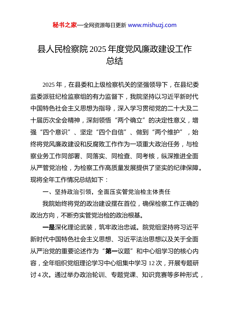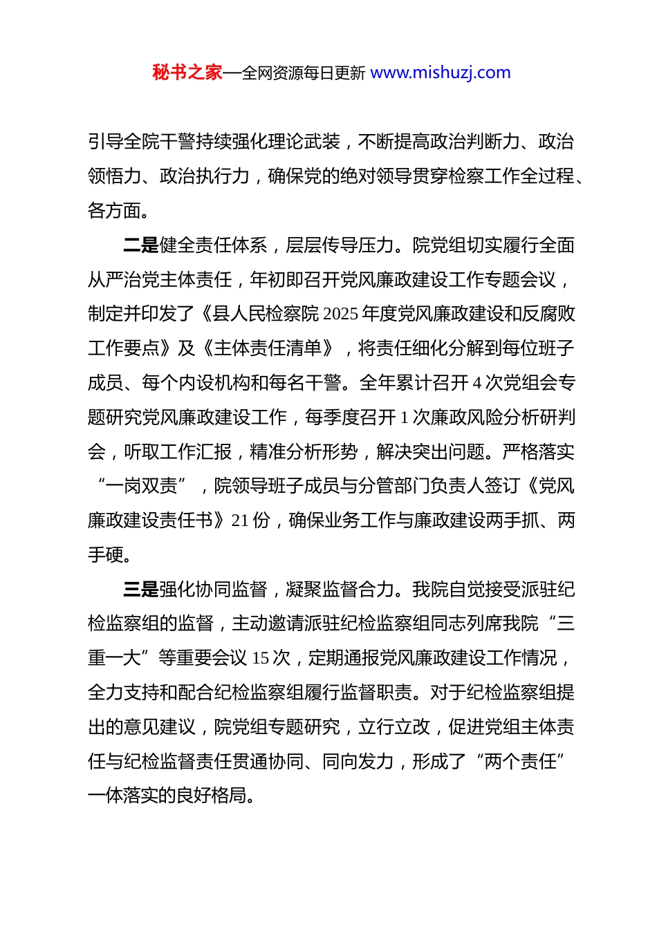 秘书之家—全网资源每日更新 www.mishuzj.com县人民检察院 2025 年度党风廉政建设工作总结 2025 年,在县委和上级检察机关的坚强领导下,在县纪委监委派驻纪检监察组的有力监督下,我院坚持以习近平新时代中国特色社会主义思想为指导,深入学习贯彻党的二十大及二十届历次全会精神,深刻领悟“两个确立”的决定性意义,增强“四个意识”、坚定“四个自信”、做到“两个维护”,始终将党风廉政建设和反腐败工作作为一项重大政治任务,与检察业务工作同部署、同落实、同检查、同考核,纵深推进全面从严管党治检,为检察工作高质量发展提供了坚实的纪律保障。现将全年工作情况总结如下:一、坚持政治引领,全面压实管党治检主体责任我院始终将党的政治建设摆在首位,确保检察工作正确的政治方向,不断夯实管党治检的政治根基。一是深化理论武装,筑牢政治忠诚。院党组坚持将习近平新时代中国特色社会主义思想、习近平法治思想以及关于全面从严治党的重要论述作为“第一议题”和中心组学习的核心内容,全年组织党组理论学习中心组集中学习 12 次,开展专题研讨 4 次。通过举办政治轮训、专题党课、知识竞赛等多种形式,秘书之家—全网资源每日更新 www.mishuzj.com引导全院干警持续强化理论武装,不断提高政治判断力、政治领悟力、政治执行力,确保党的绝对领导贯穿检察工作全过程、各方面。二是健全责任体系,层层传导压力。院党组切实履行全面从严治党主体责任,年初即召开党风廉政建设工作专题会议,制定并印发了《县人民检察院 2025 年度党风廉政建设和反腐败工作要点》及《主体责任清单》,将责任细化分解到每位班子成员、每个内设机构和每名干警。全年累计召开 4 次党组会专题研究党风廉政建设工作,每季度召开 1 次廉政风险分析研判会,听取工作汇报,精准分析形势,解决突出问题。严格落实“一岗双责”,院领导班子成员与分管部门负责人签订《党风廉政建设责任书》21 份,确保业务工作与廉政建设两手抓、两手硬。三是强化协同监督,凝聚监督合力。我院自觉接受派驻纪检监察组的监督,主动邀请派驻纪检监察组同志列席我院“三重一大”等重要会议 15 次,定期通报党风廉政建设工作情况,全力支持和配合纪检监察组履行监督职责。对于纪检监察组提出的意见建议,院党组专题研究,立行立改,促进党组主体责任与纪检监督责任贯通协同、同向发力,形成了“两个责任”一体落实的良好格局。秘书之家—全网资源每日更新 www.mishuzj.com二、聚焦监督执纪,持续深化纪律作风建设我院坚持严的基调、严的措施、严的氛围,以常态化长效化机制推进纪律作风建设走深走实。一是常态化开展党纪学习教育。将党章党规党纪作为干警日常学习的必修课,通过“三会一课”、主题党日、青年理论学习小组等载体,组织全院干警深入学习《中国共产党纪律处分条例》等党内法规。全年组织开展党规党纪知识测试 2 次,参考率和优秀率均达到 100%,有效引导干警学纪、知纪、明纪、守纪,将纪律规矩内化于心、外化于行。二是多维度开展警示教育。坚持以案为鉴、以案明纪,用“身边事”警醒“身边人”。全年组织集中观看《歧路》《代价》等警示教育片 6 部,邀请县纪委监委专家进行廉政专题辅导授课 2 次,组织全院干警参观**州廉政教育基地,通过鲜活案例和沉浸式体验,让干警身临其境感受腐败行为的巨大危害。在重要节点,如元旦、春节、五一、国庆等节假日前,通过发送廉洁提醒短信、召开节前廉政提醒会等方式,重申纪律要求,打好“预防针”,严防“节日病”,确保廉洁过节。三是驰而不息纠治“四风”。严格执行中央八项规定及其实施细则精神,紧盯形式主义、官僚主义新动向新表现,对文山会海、检查考核过多过滥等问题进行专项整治,精简会议文秘书之家—全网资源每日更新 www.mishuzj.com件数量超过 20%。加强对公务接待、公车使用、津贴补贴发放等情况的监督检查,全年未发生一起违规违纪问题。大力弘扬“马上就办、真抓实干”的工作作风,教育引导干警树立正确的权力观、政绩观,切实为基层减负,提升检察工作质效。三、健全防控体系,规范检察权运行监督制约我院坚持问题导...