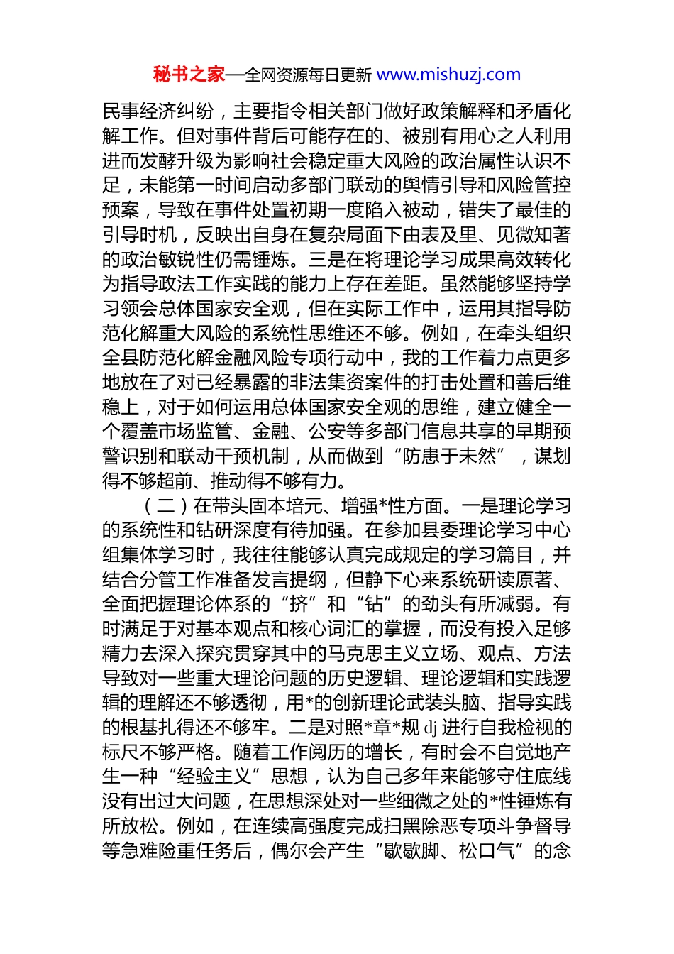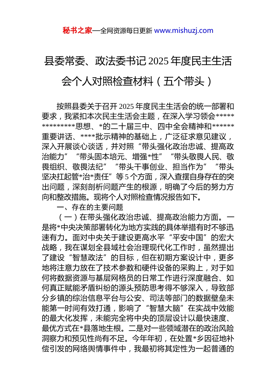 秘书之家—全网资源每日更新 www.mishuzj.com县委常委、政法委书记 2025 年度民主生活会个人对照检查材料(五个带头)按照县委关于召开 2025 年度民主生活会的统一部署和要求,我紧扣本次民主生活会主题,在深入学习领会**************思想、*的二十届三中、四中全会精神和******重要讲话、****批示精神的基础上,广泛征求意见建议,深入开展谈心谈话,并对照“带头强化政治忠诚、提高政治能力”“带头固本培元、增强*性”“带头敬畏人民、敬畏组织、敬畏法纪”“带头干事创业、担当作为”“带头坚决扛起管*治*责任”等 5 个方面,深入查摆自身存在的突出问题,深刻剖析问题产生的根源,明确了今后的努力方向和整改措施。现将个人对照检查情况报告如下。一、存在的主要问题(一)在带头强化政治忠诚、提高政治能力方面。一是将*中央决策部署转化为地方实践的具体举措有时不够迅速有力。面对中央关于建设更高水平“平安中国”的宏大战略,我在谋划全县域社会治理现代化工作时,虽然提出了建设“智慧政法”的目标,但在初期方案设计中,更多地将注意力放在了技术参数和硬件设备的采购上,对于如何将数据资源与基层网格员的日常工作进行深度融合、如何真正赋能矛盾纠纷的源头预防思考得不够深入,导致部分乡镇的综治信息平台与公安、司法等部门的数据壁垒未能第一时间有效打通,影响了“智慧大脑”在实战中效能的最大化发挥,未能完全将中央的顶层设计以最快速度、最优方式在*县落地生根。二是对一些领域潜在的政治风险洞察力和预见性尚有不足。今年年初,在处置*乡因征地补偿引发的网络舆情事件中,我最初将其定性为一起普通的秘书之家—全网资源每日更新 www.mishuzj.com民事经济纠纷,主要指令相关部门做好政策解释和矛盾化解工作。但对事件背后可能存在的、被别有用心之人利用进而发酵升级为影响社会稳定重大风险的政治属性认识不足,未能第一时间启动多部门联动的舆情引导和风险管控预案,导致在事件处置初期一度陷入被动,错失了最佳的引导时机,反映出自身在复杂局面下由表及里、见微知著的政治敏锐性仍需锤炼。三是在将理论学习成果高效转化为指导政法工作实践的能力上存在差距。虽然能够坚持学习领会总体国家安全观,但在实际工作中,运用其指导防范化解重大风险的系统性思维还不够。例如,在牵头组织全县防范化解金融风险专项行动中,我的工作着力点更多地放在了对已经暴露的非法集资案件的打击处置和善后维稳上,对于如何运用总体国家安全观的思维,建立健全一个覆盖市场监管、金融、公安等多部门信息共享的早期预警识别和联动干预机制,从而做到“防患于未然”,谋划得不够超前、推动得不够有力。(二)在带头固本培元、增强*性方面。一是理论学习的系统性和钻研深度有待加强。在参加县委理论学习中心组集体学习时,我往往能够认真完成规定的学习篇目,并结合分管工作准备发言提纲,但静下心来系统研读原著、全面把握理论体系的“挤”和“钻”的劲头有所减弱。有时满足于对基本观点和核心词汇的掌握,而没有投入足够精力去深入探究贯穿其中的马克思主义立场、观点、方法导致对一些重大理论问题的历史逻辑、理论逻辑和实践逻辑的理解还不够透彻,用*的创新理论武装头脑、指导实践的根基扎得还不够牢。二是对照*章*规 dj 进行自我检视的标尺不够严格。随着工作阅历的增长,有时会不自觉地产生一种“经验主义”思想,认为自己多年来能够守住底线没有出过大问题,在思想深处对一些细微之处的*性锤炼有所放松。例如,在连续高强度完成扫黑除恶专项斗争督导等急难险重任务后,偶尔会产生“歇歇脚、松口气”的念秘书之家—全网资源每日更新 www.mishuzj.com头,在每日反躬自省、净化思想方面有所懈怠,没有真正做到将*性修养内化为一种高度的政治自觉和生活习惯,时时刻刻以*员的最高标准来要求自己。三是将*性修养与人民立场深度融合的自觉性需要提升。在推进“我为群众办实事”实践活动中,我牵头推动了覆盖全县的公共法律服务体系建设,将法律援助工作站建到了每个乡镇。但在工作初期,我更多地关注了工作站点的覆盖率、派驻律师的人数等可量化的“硬件”指标,而...