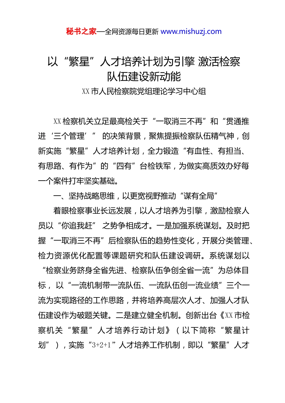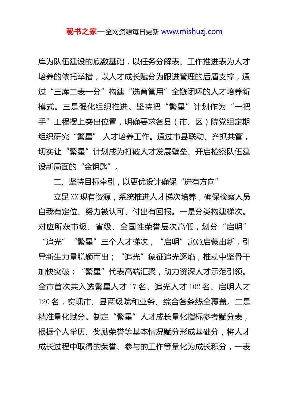 秘书之家—全网资源每日更新 www.mishuzj.com以“繁星”人才培养计划为引擎 激活检察队伍建设新动能XX 市人民检察院党组理论学习中心组XX 检察机关立足最高检关于“一取消三不再”和“贯通推进‘三个管理’” 的决策背景,聚焦提振检察队伍精气神,创新实施“繁星”人才培养计划,全力锻造“有血性、有担当、有思路、有作为”的“四有”台检铁军,为做实高质效办好每一个案件打牢坚实基础。一、坚持战略思维,以更宽视野推动“谋有全局”着眼检察事业长远发展,以人才培养为引擎,激励检察人员以“你追我赶” 之势争相成才。一是加强系统谋划。及时把握“一取消三不再”后检察队伍的趋势性变化,开展分类管理、检力资源优化配置等课题研究和队伍建设调研。系统谋划以“检察业务跻身全省先进、检察队伍争创全省一流”为总体目标, 以“一流机制带一流队伍、一流队伍创一流业绩”三个一流为实现路径的工作思路,并将培养高层次人才、加强人才队伍建设作为破题关键。二是建立健全机制。创新出台《XX 市检察机关“繁星”人才培养行动计划》(以下简称“繁星计划”),实施“3+2+1”人才培养工作机制,即以“繁星”人才秘书之家—全网资源每日更新 www.mishuzj.com库为队伍建设的底数基础,以任务分解表、工作推进表为人才培养的依托举措,以人才成长赋分为跟进管理的后盾支撑,通过“三库二表一分”构建“选育管用”全链闭环的人才培养新模式。三是强化组织推进。坚持把“繁星”计划作为“一把手”工程摆上突出位置,明确要求各县(市、区)院党组定期组织研究“繁星” 人才培养工作。通过市县联动、齐抓共管,切实让“繁星”计划成为打破人才发展壁垒、开启检察队伍建设新局面的“金钥匙”。二、坚持目标牵引,以更优设计确保“进有方向”立足 XX 现有资源,系统推进人才梯次培养,确保检察人员自我有定位、努力被认可、付出有回报。一是分类构建梯次。对应所获市级、省级、全国性荣誉层次高低,划分“启明”“追光”“繁星”三个人才梯次,“启明”寓意启蒙出新,引导新生力量脱颖而出;“追光”象征追光逐焰,推动中坚骨干加快突破;“繁星”代表高端汇聚,助力资深人才示范引领。全市首次共入选繁星人才 17 名、追光人才 102 名、启明人才120 名,实现市、县两级院和业务、综合各条线全覆盖。二是精准量化赋分。制定“繁星”人才成长量化指标参考赋分表,根据个人学历、奖励荣誉等基本情况赋分形成基础分,将人才成长过程中取得的荣誉、参与的工作等量化为成长积分,一表秘书之家—全网资源每日更新 www.mishuzj.com看清人才底数和成长轨迹。通过“基础赋分+成长积分”相结合的方式量化人才培养成效。三是动态跟踪管理。坚持“能者上,庸者下,劣者汰”,以半年为周期对各类人才实绩表现进行定期追踪、实时评估,推动人才梯次上下、动态进出。跟进调整培养措施, 充分撬动各类人才的内生动力和潜在竞争力,让更多敢担当、善作为的人才脱颖而出。三、坚持强基导向,以更实举措促进“学有劲头”根据人才成长需要,从“点、线、面”三个维度织密能力培养提升网,助力增强不同类别人才“追光逐焰”的信心和底气。一是实施骨干“点训”。按一定比例确定重点骨干人才开展“点训”,秉持“跳出检察看检察”理念开展跨系统交流,2024 年以来,首次推动检察人员赴公安系统交流学习,选派市院 18 人到省巡察办等党政机关锻炼学习,推动 7 人到乡镇、企业等一线“墩苗”历练。实施系统内“一人一策”定制培养,推荐 66 人次参加上级院条线业务培训; 动员 3 名青年骨干到基层院锻炼成长。二是开展条线“赛马”。分类分级开展“订单式”选学、“模拟式”教学、“赛马式”施训。广泛开展业务竞赛等实战练兵活动,1 名检察人员获全国检察机关案件流程监控“标兵型”人才。注重“走出去借外力,学先进增内力”,积极对接宁波、嘉兴等先进地区举办未检业务竞赛,联合 XX 市秘书之家—全网资源每日更新 www.mishuzj.com中院开展法检同堂培训,靶向提升人才专业能力。三是推进全员“赋能”。将传承弘扬大陈岛垦荒精神嵌入 XX 检察发展内核,引领检察人员找准价值...